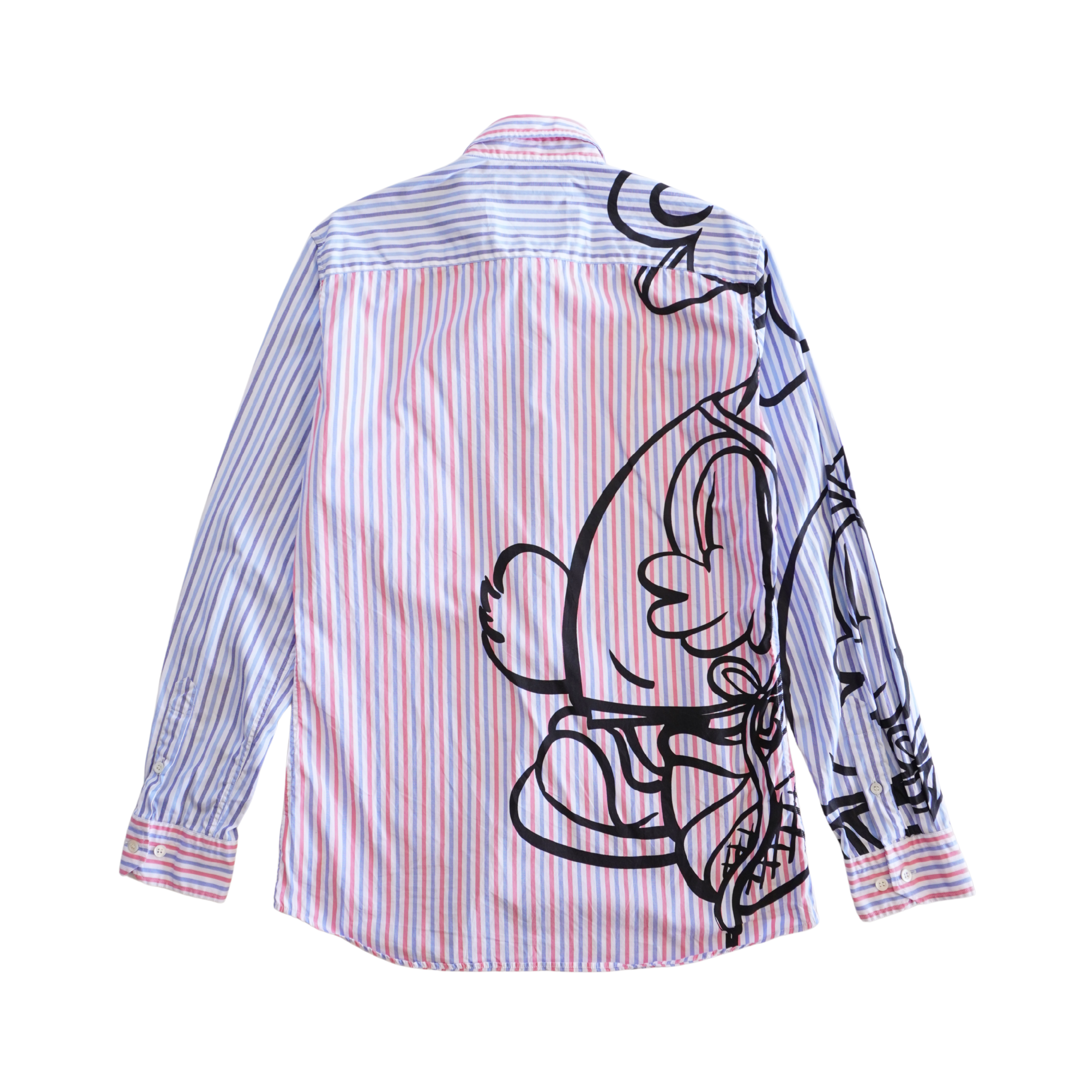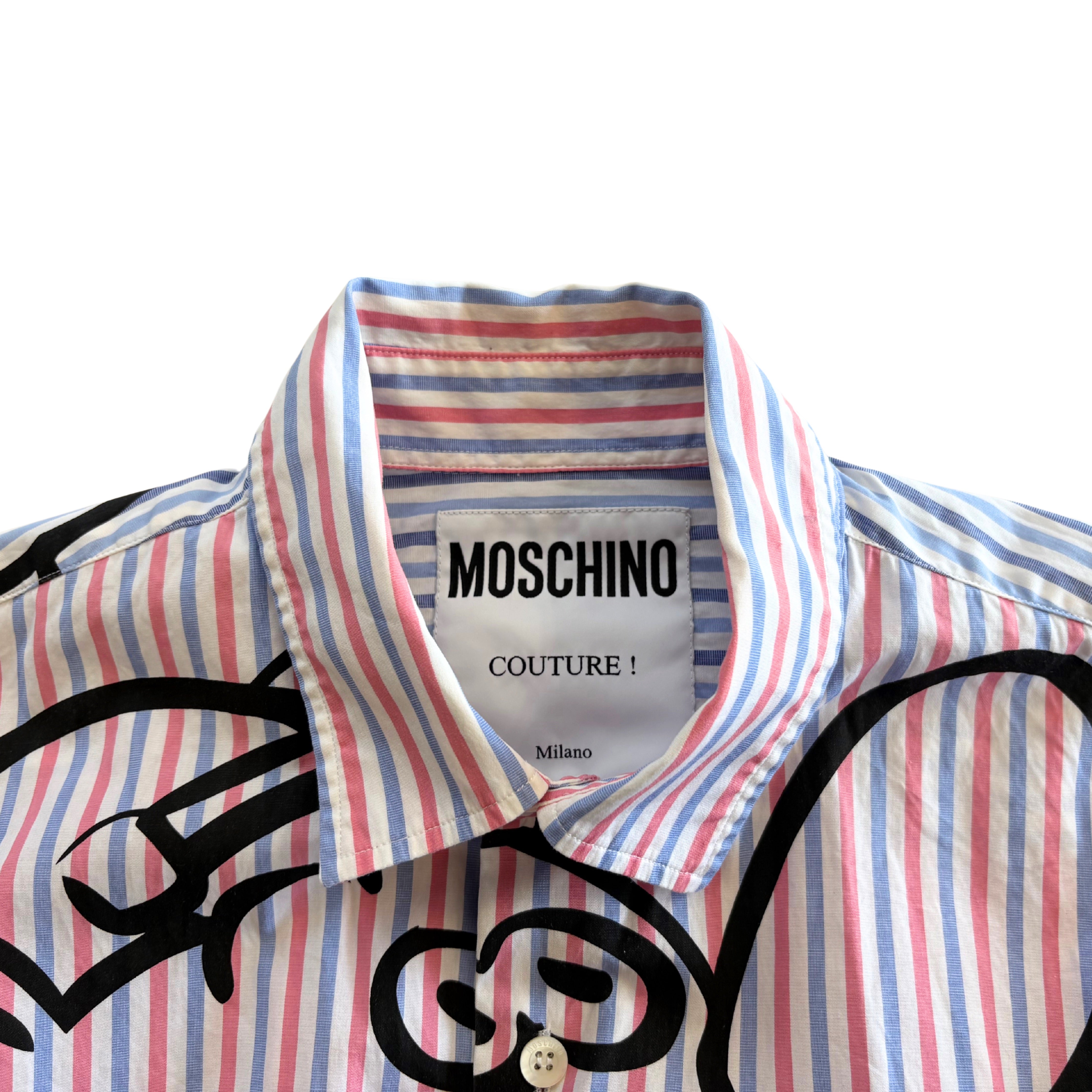 Moschino Couture 'Rabbit' button-down shirt in white, blue and red stripes with black doodled character print.