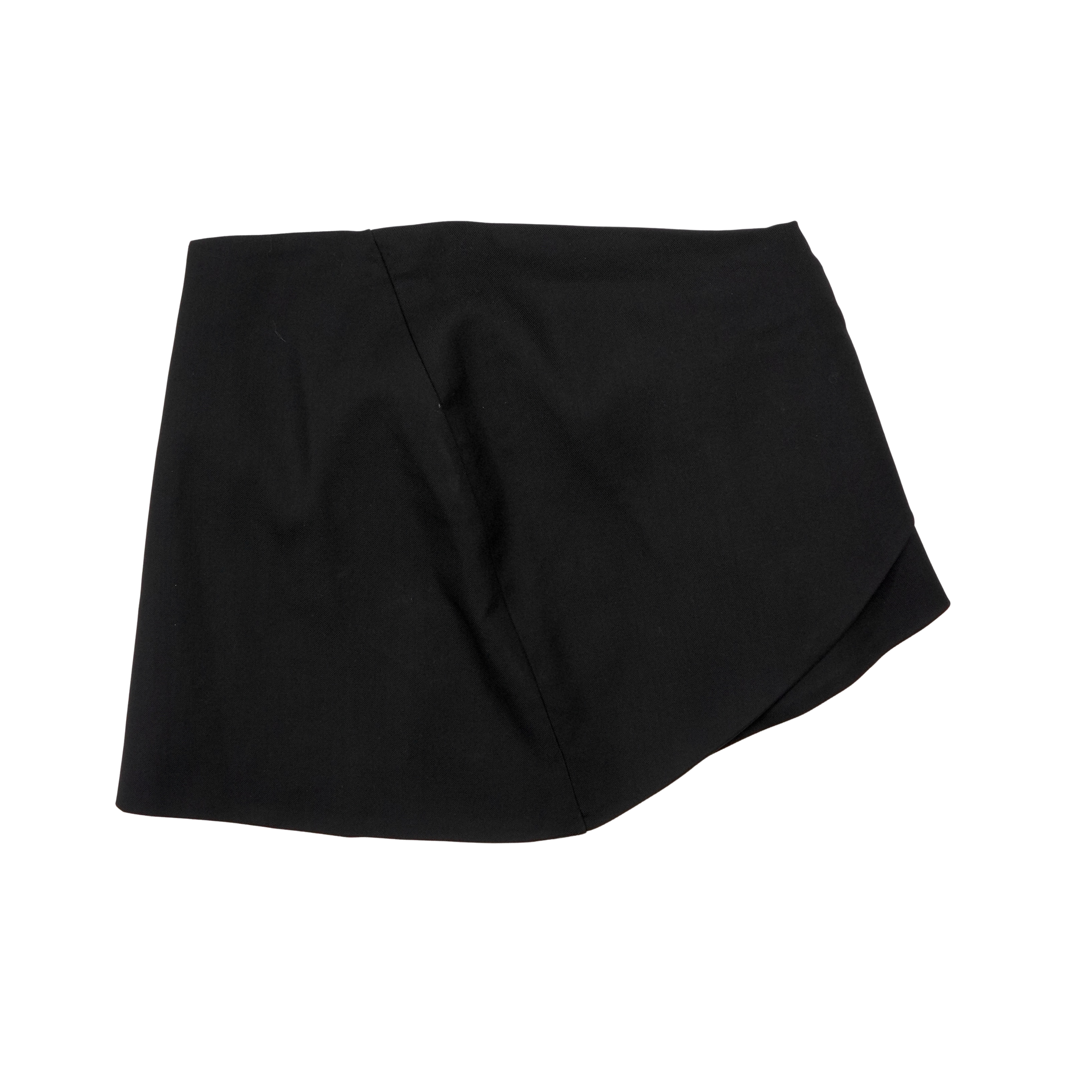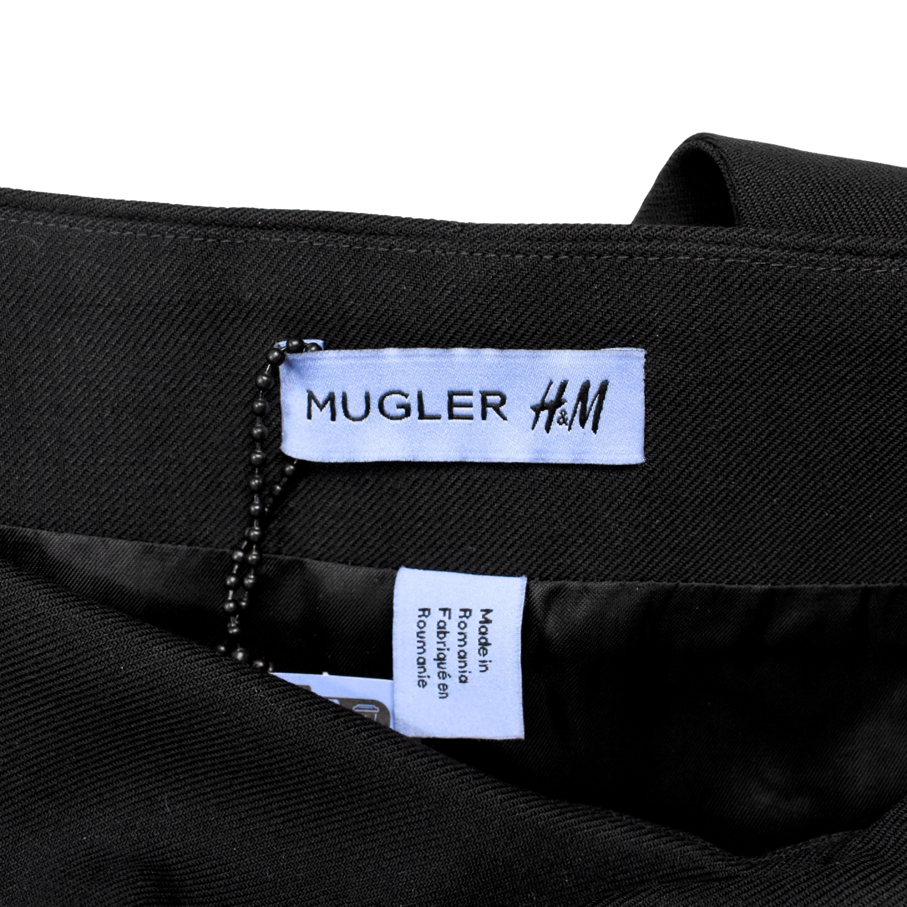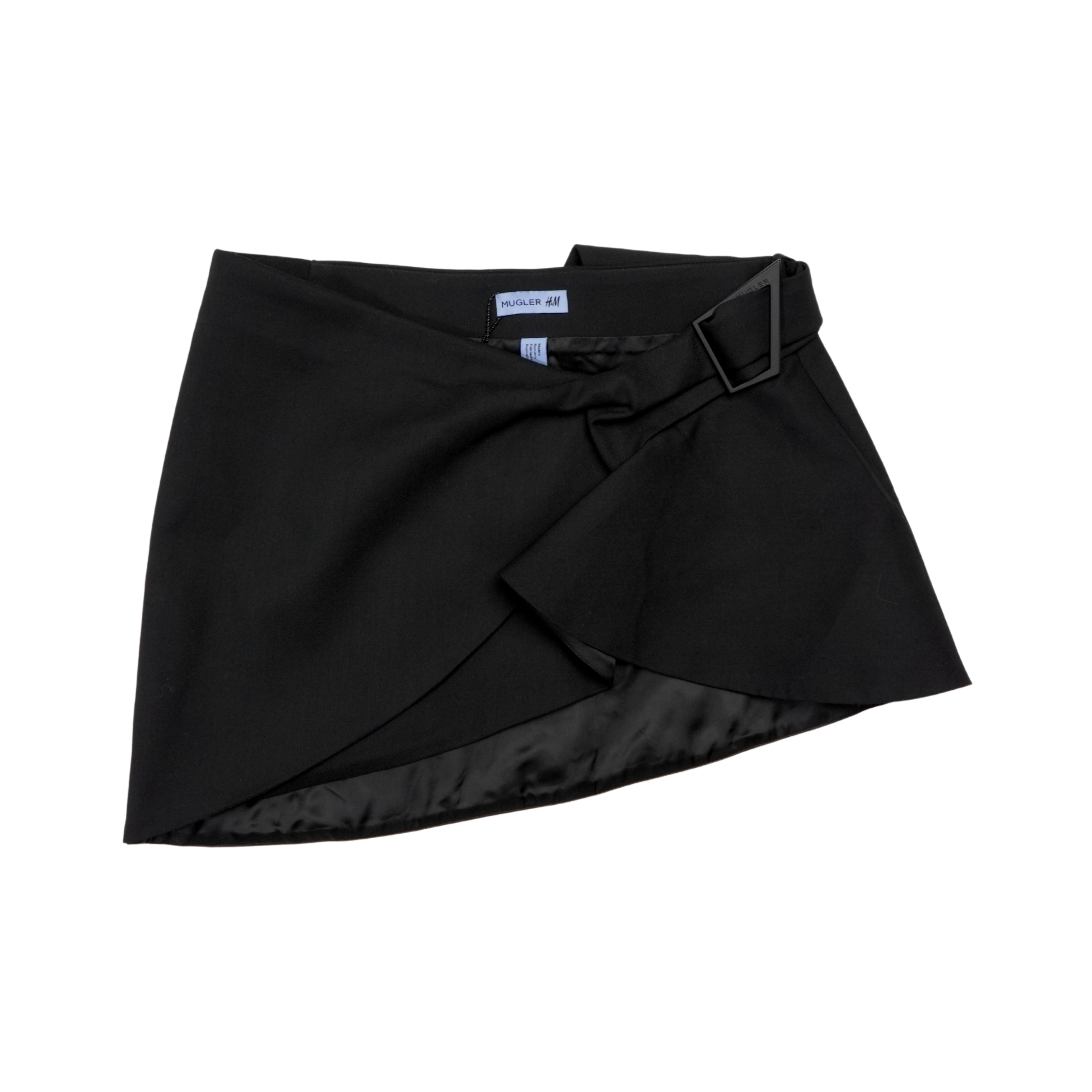 Mugler & H&M black asymmertrical mini skirt with front flounce and geomatric black belt buckle.