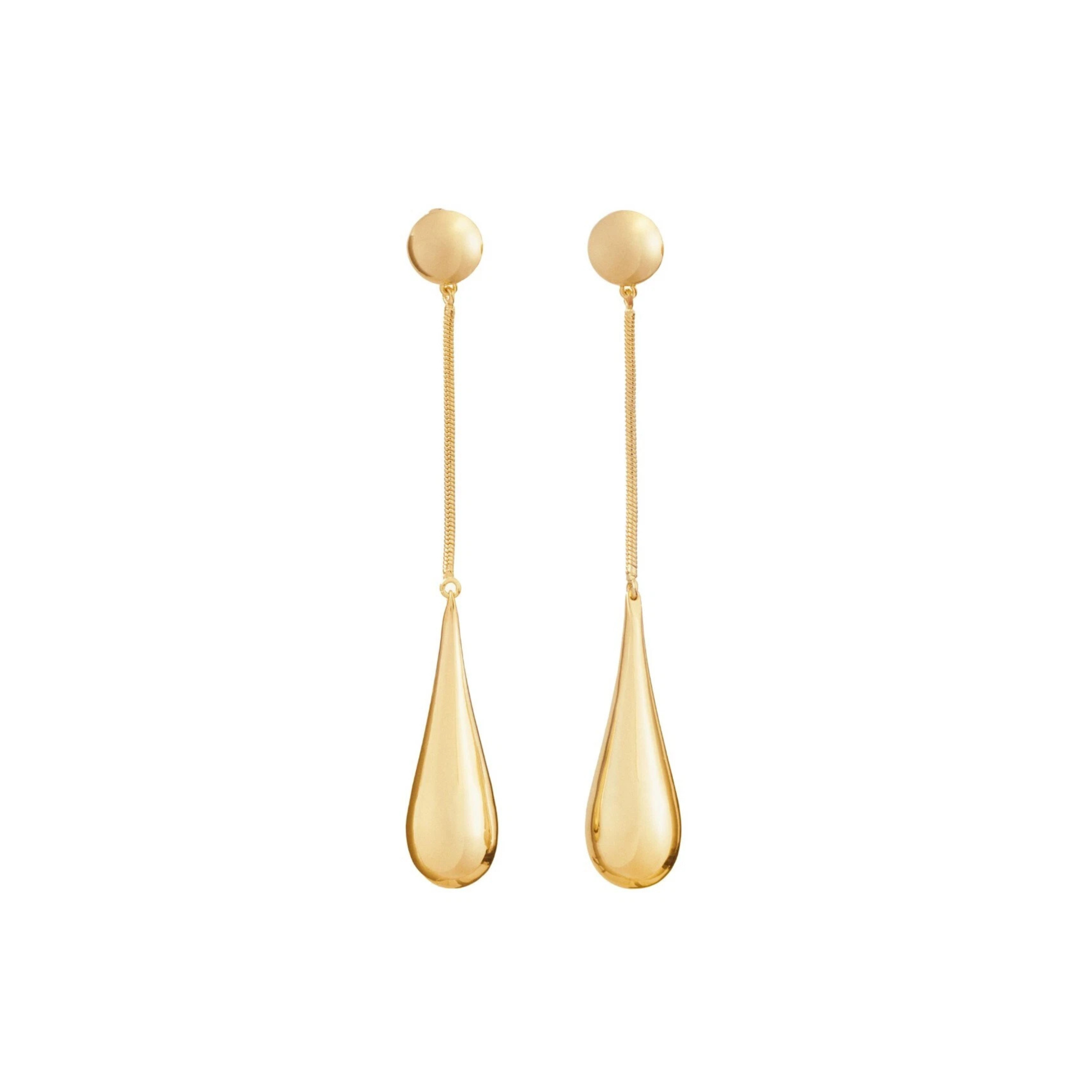 Mugler x H&M earrings in gold tone brass with a long snake cord carrying a large teardrop pendant.