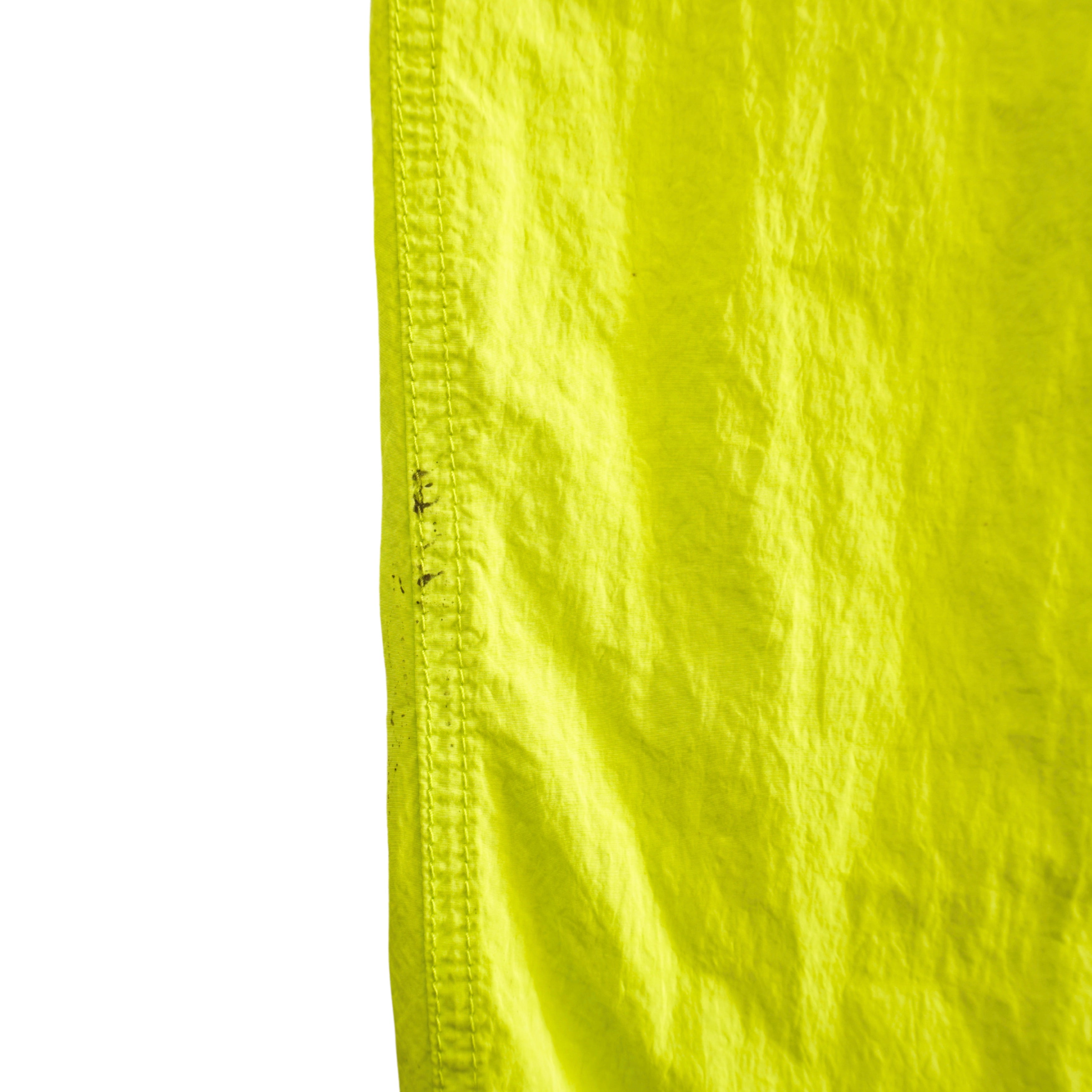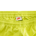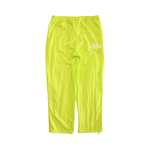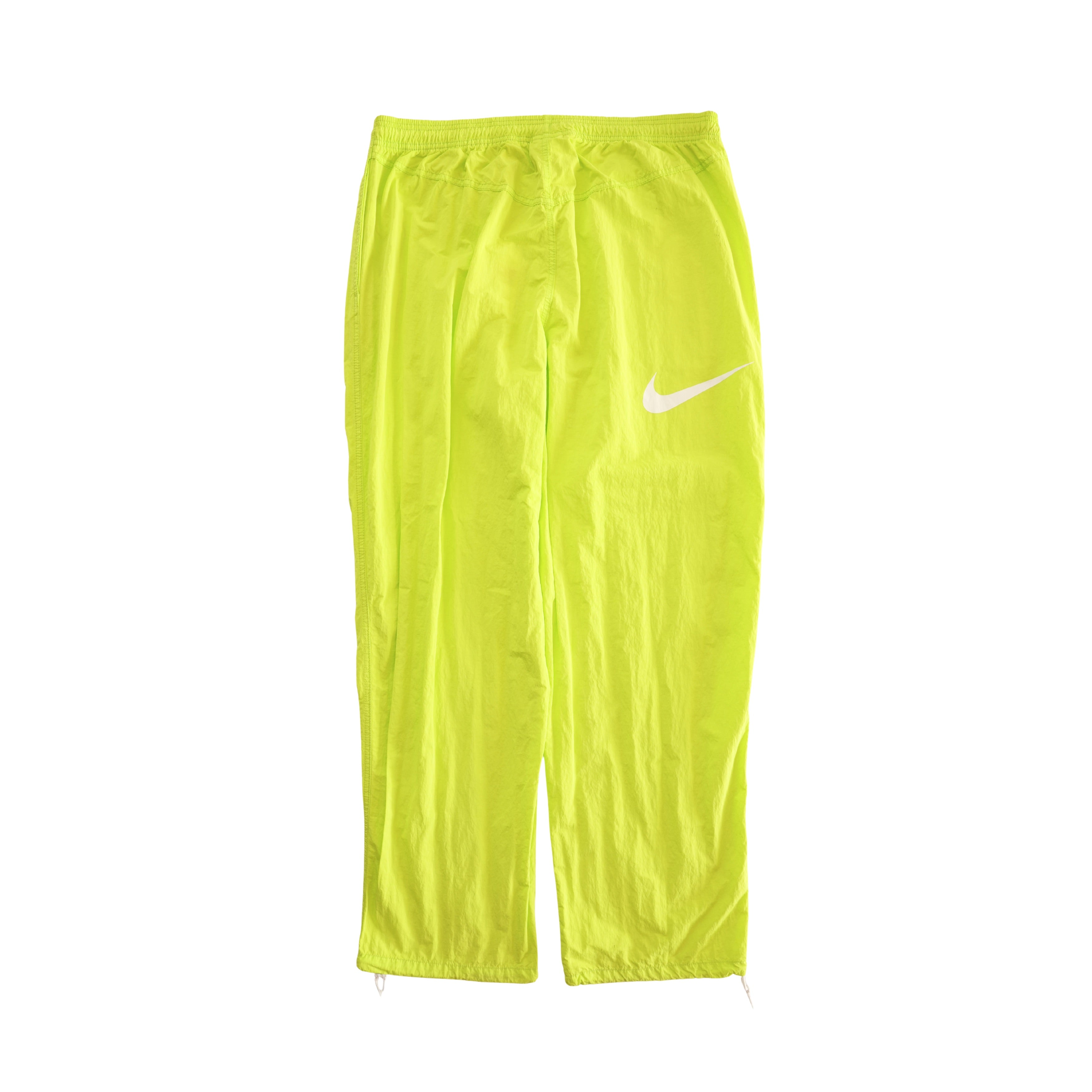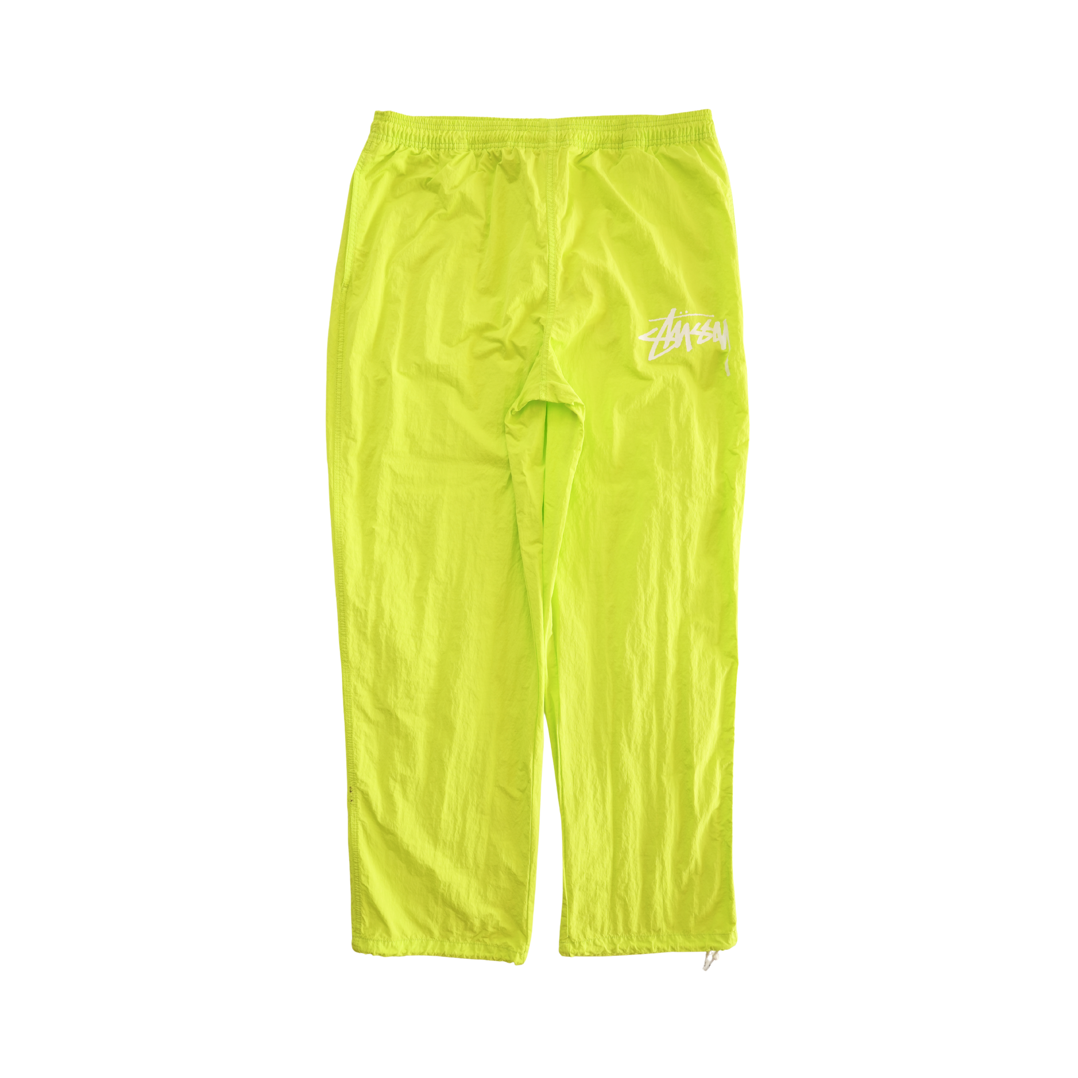 Nike x Stussy 'Beach' track pants in neon green nylon with a white logo on the thighs and drawstrings at the waist and hem.