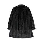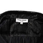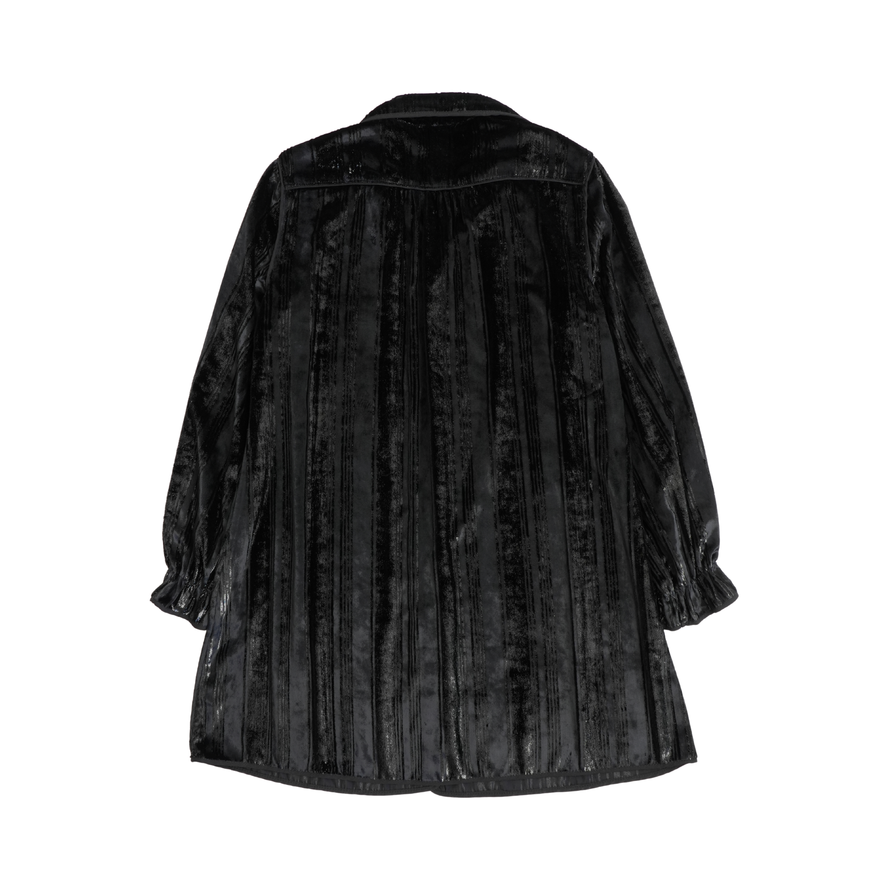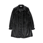 Opening Ceremony long-sleeve button-down shift dress in black velvet with silver lurex thread stripes, velvet covered buttons and black trim.
