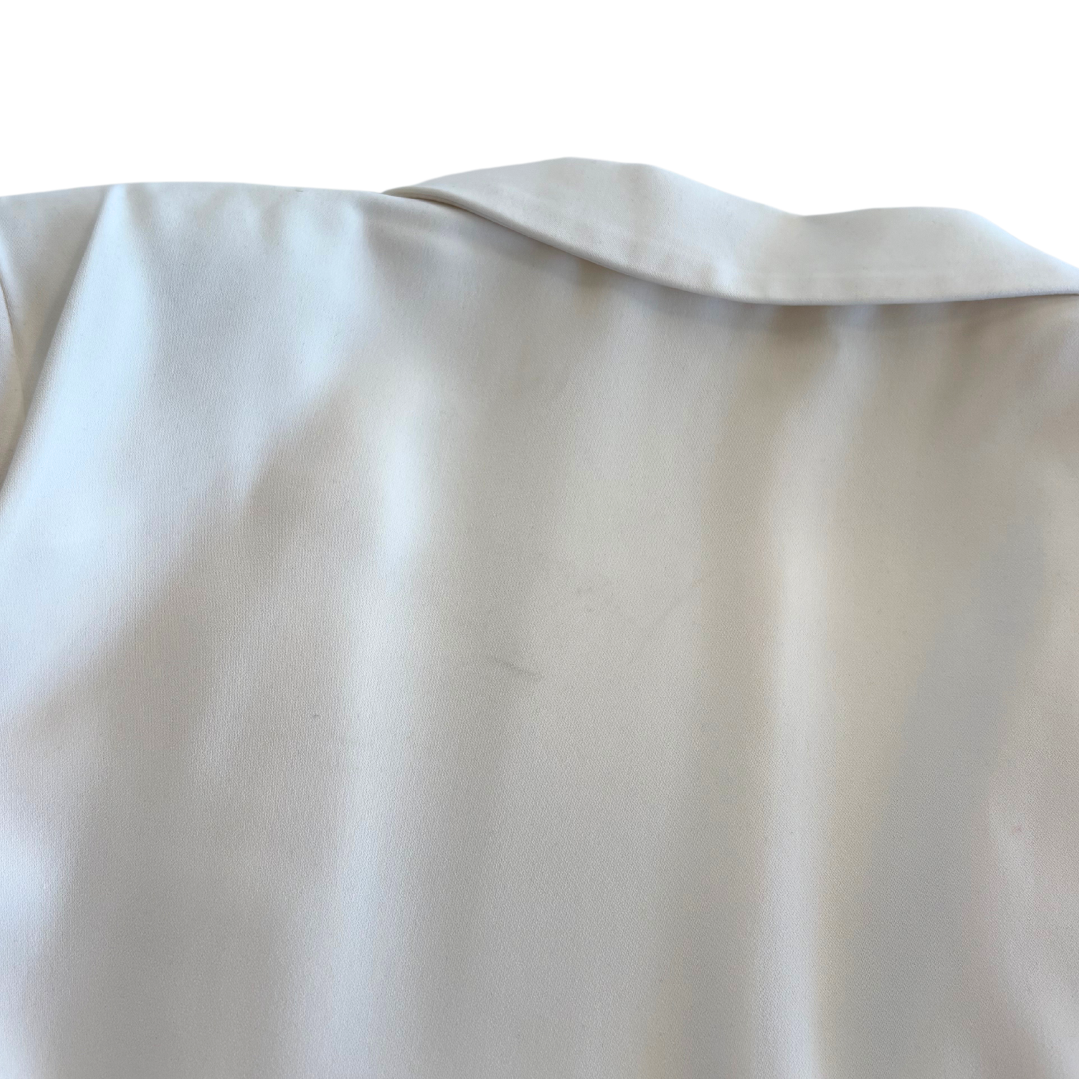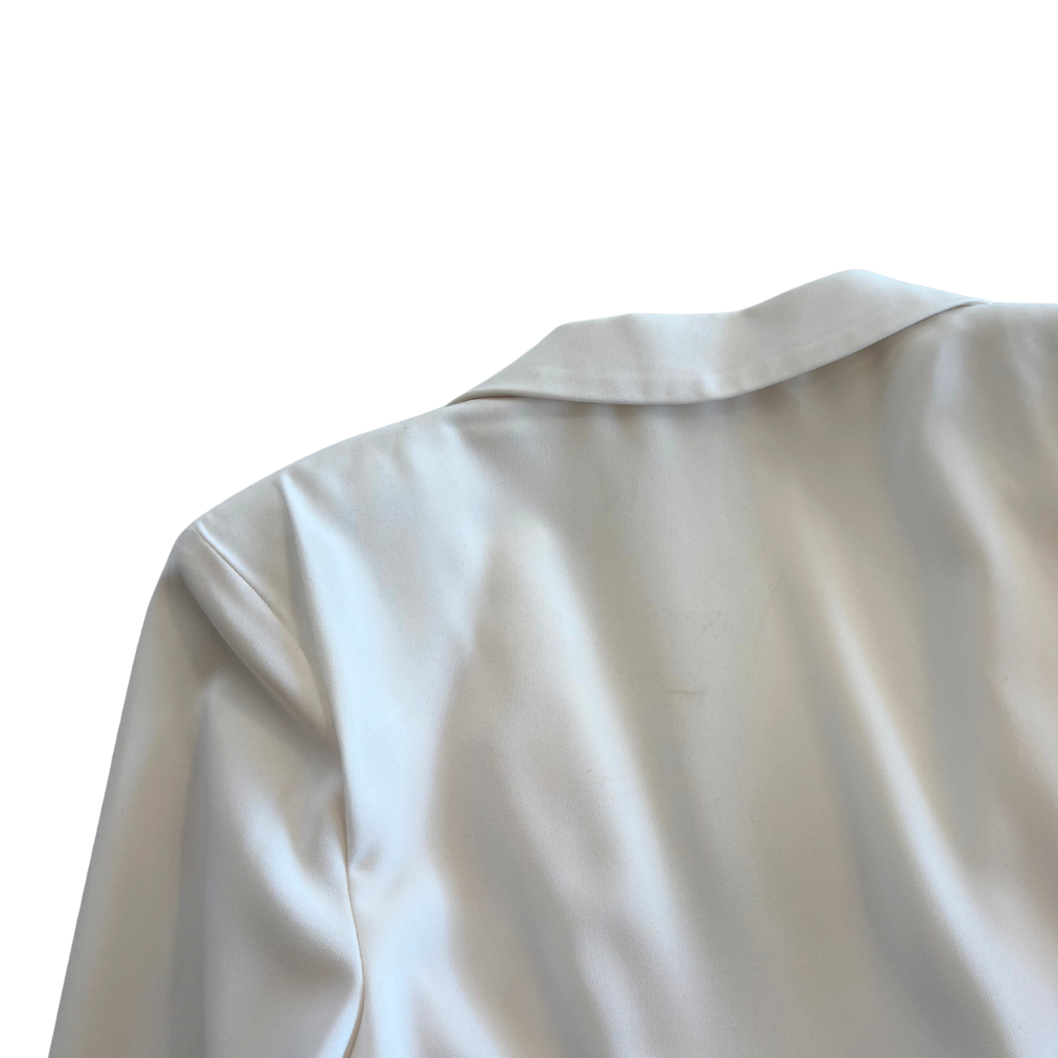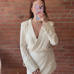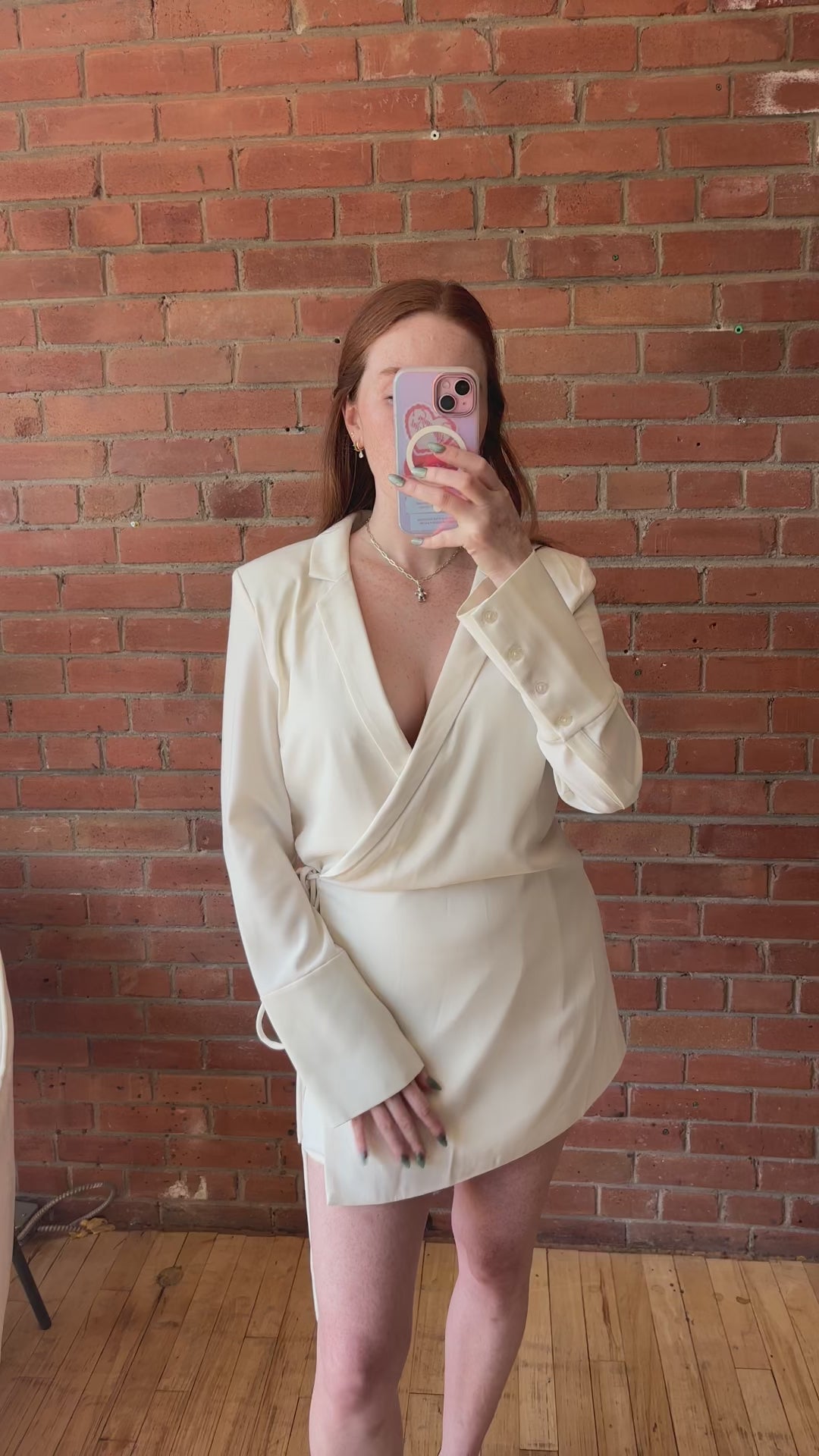 Orseund Iris mini blazer wrap dress in cream viscose with wide sleeves, a tie at the waist, and a notch lapel collar.