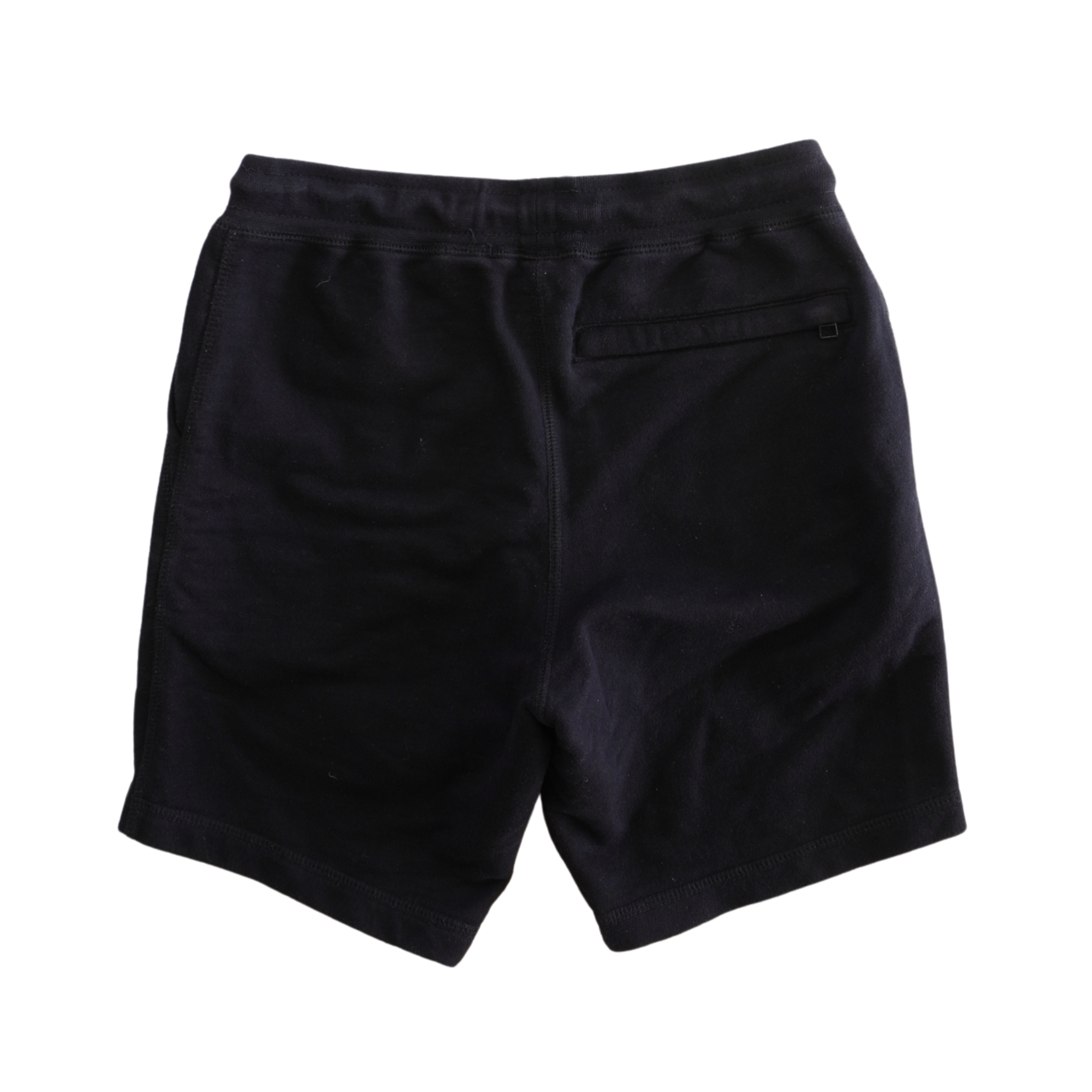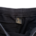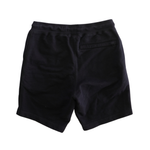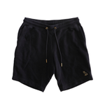 OVO sweat shorts in black cotton with a thick drawstring waistband, front slip pockets and back zip pocket. Features gold embroidered owl patch at the hem, drawstring tabs and grommets in gold hardware.