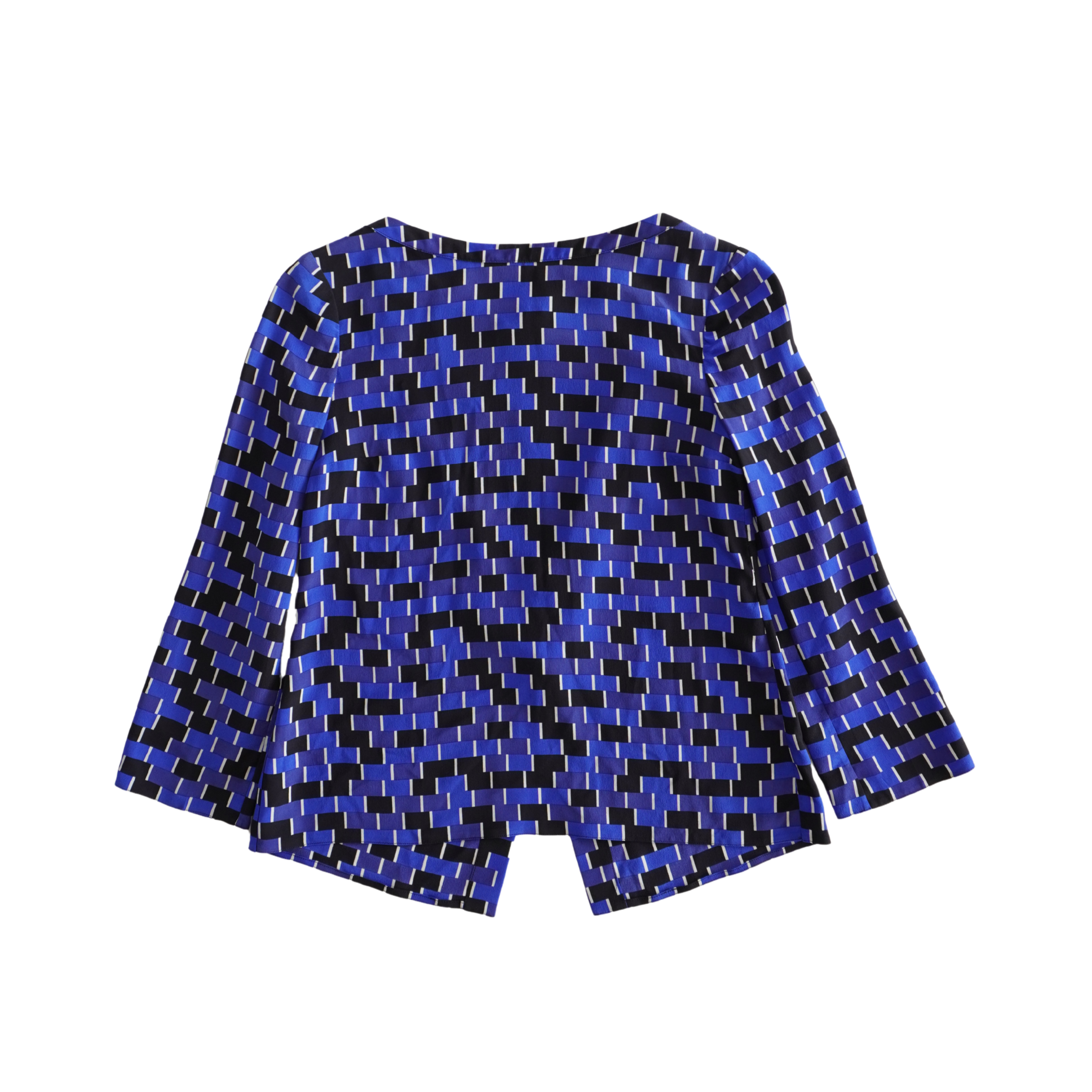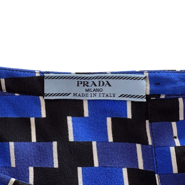 Prada boat neck long sleeve top in black and blue silk rectangular pattern featuring button down detail and hem slit on the back.