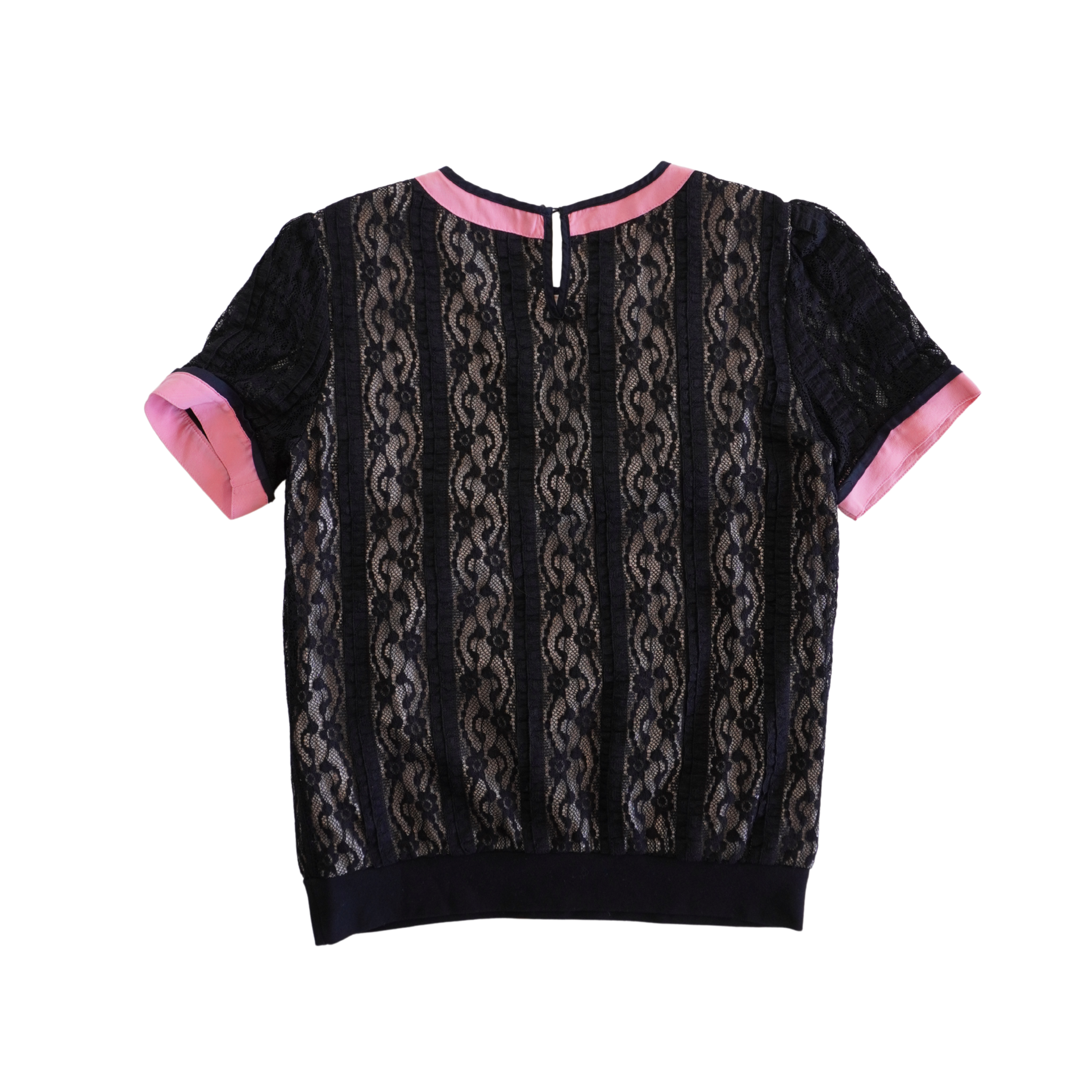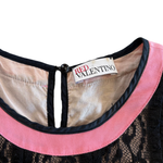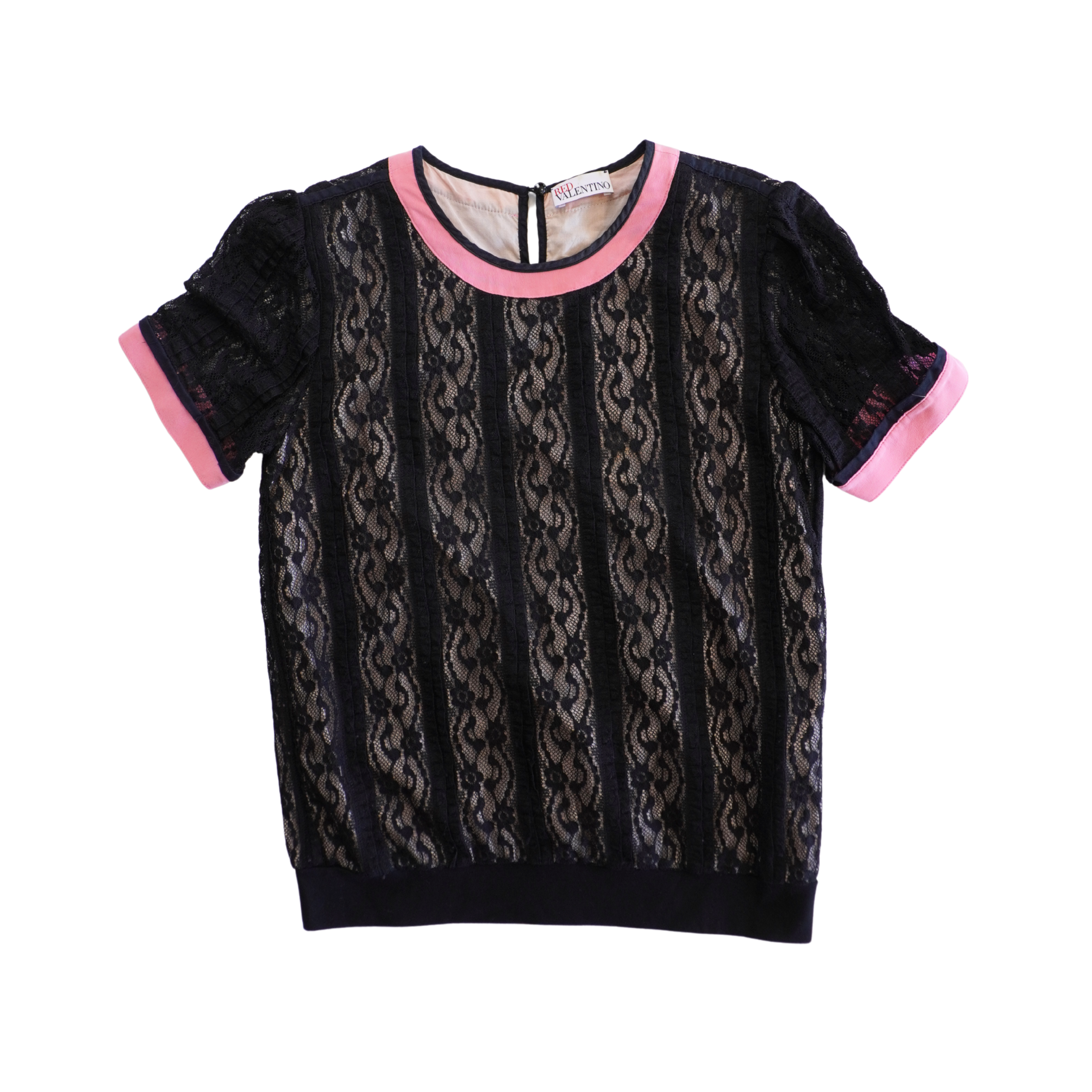 Red Valentino short-sleeve top in black lace with pink trim, cotton hem and keyhole closure at the back neck.