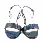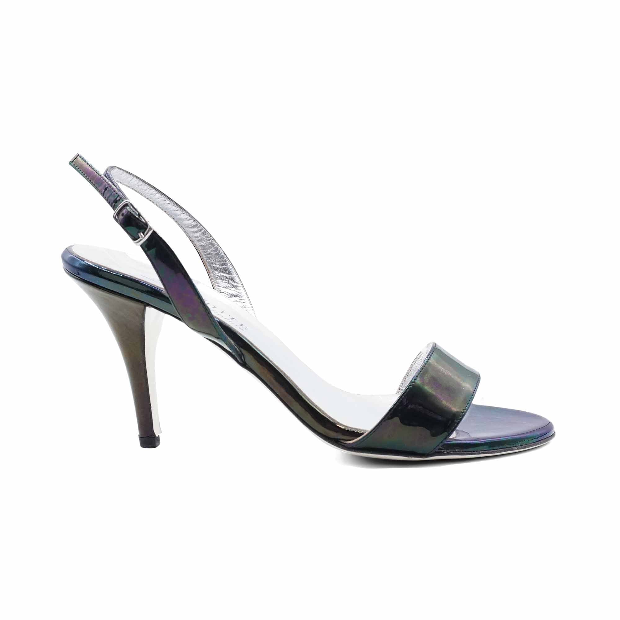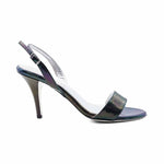 Ron White sling-back heeled sandals in black iridescent patent leather with front toe strap.