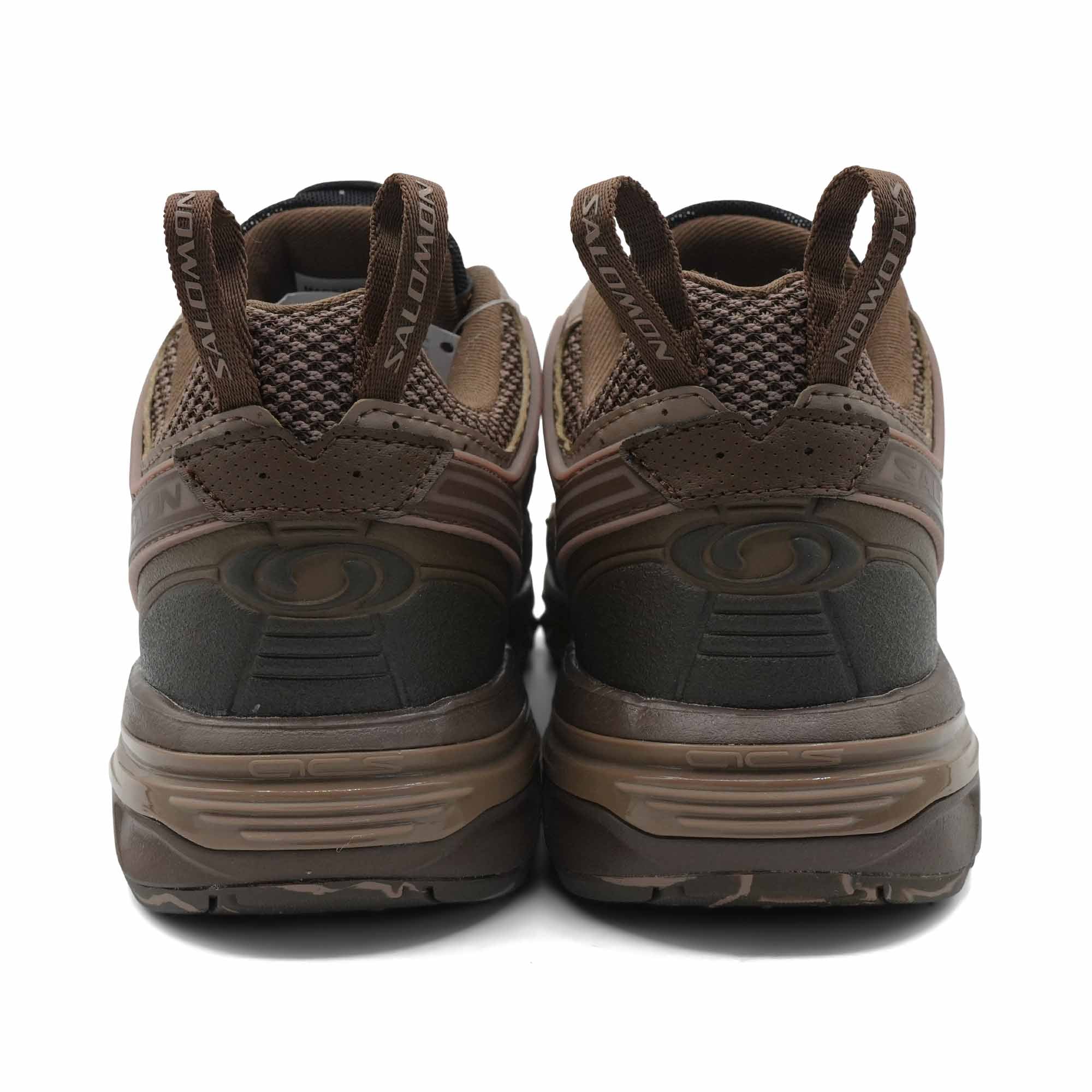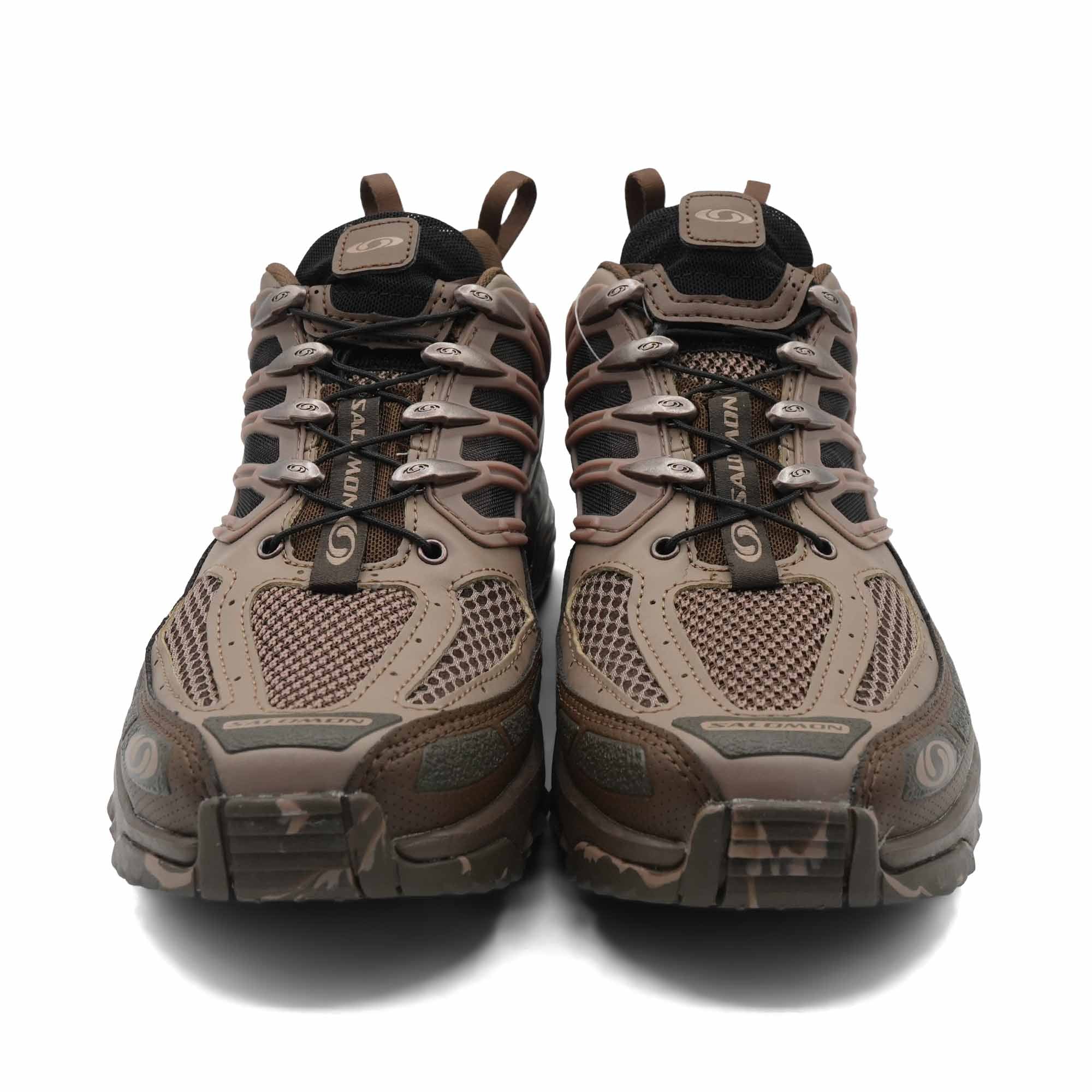 Salomon 'Pro Desert' sneakers in brown leather and rubber with adjustable drawstring laces, black sheer mesh panelling, and a chunky sole.