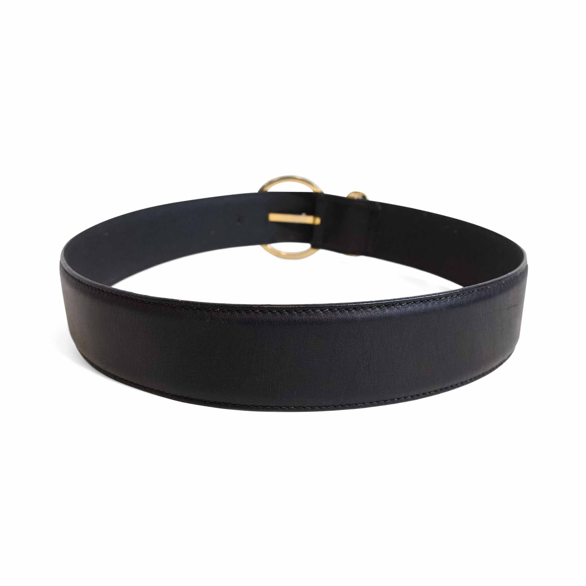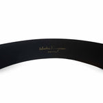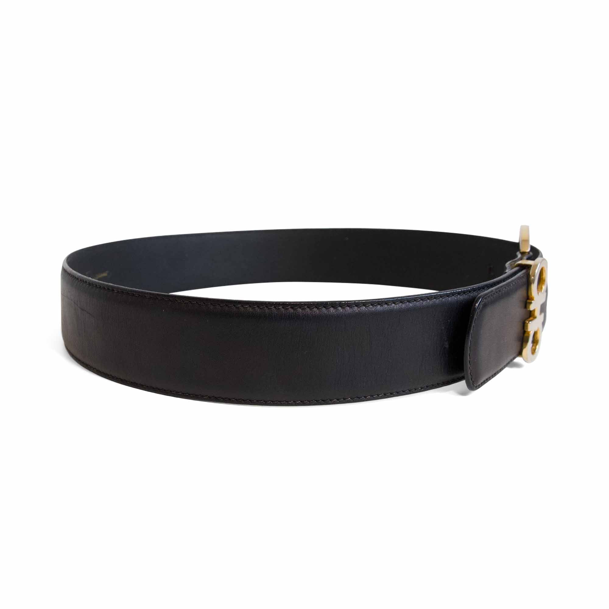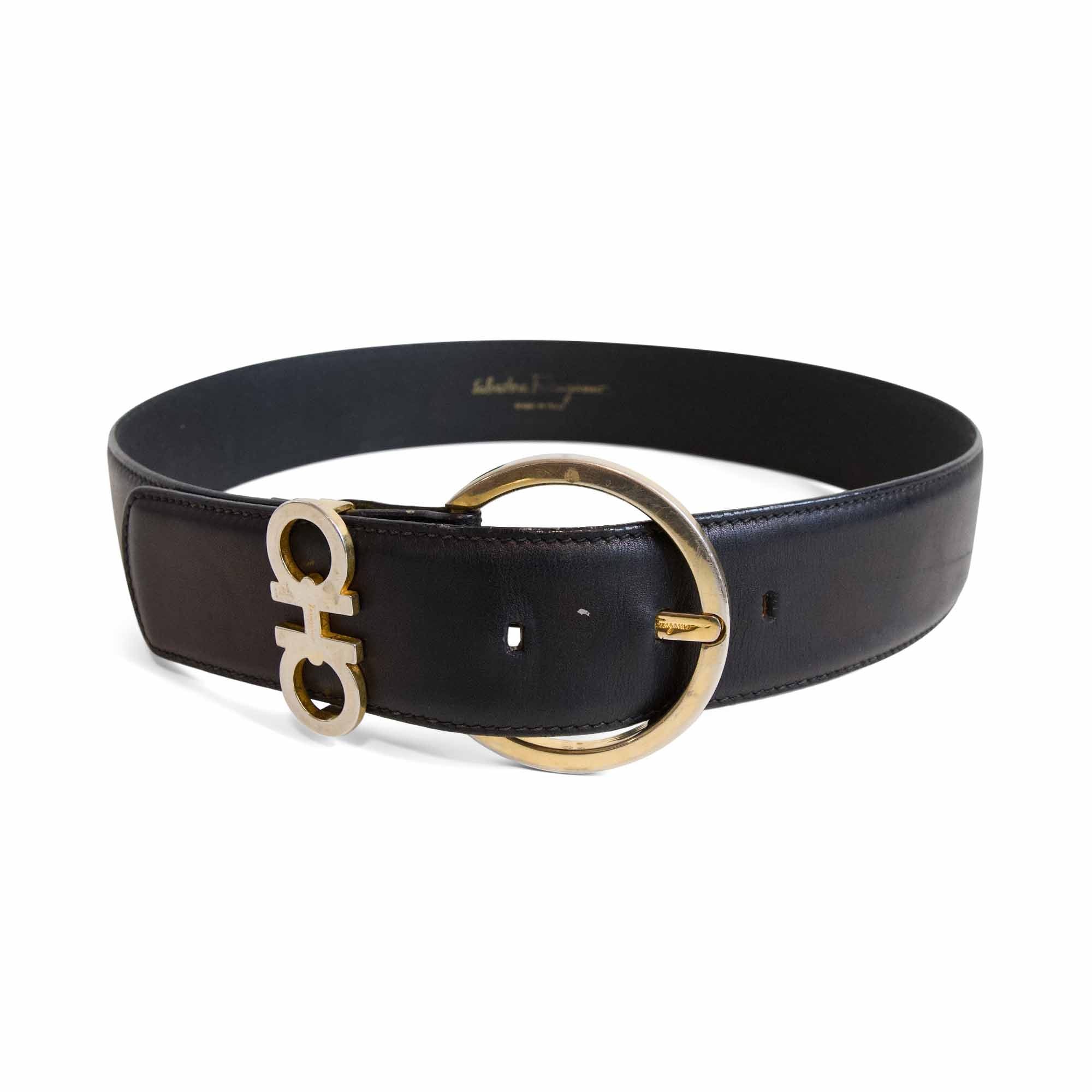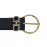 Salvatore Ferragamo 'Gancini' belt in black leather with buckle in gold hardware and gancini detailing.