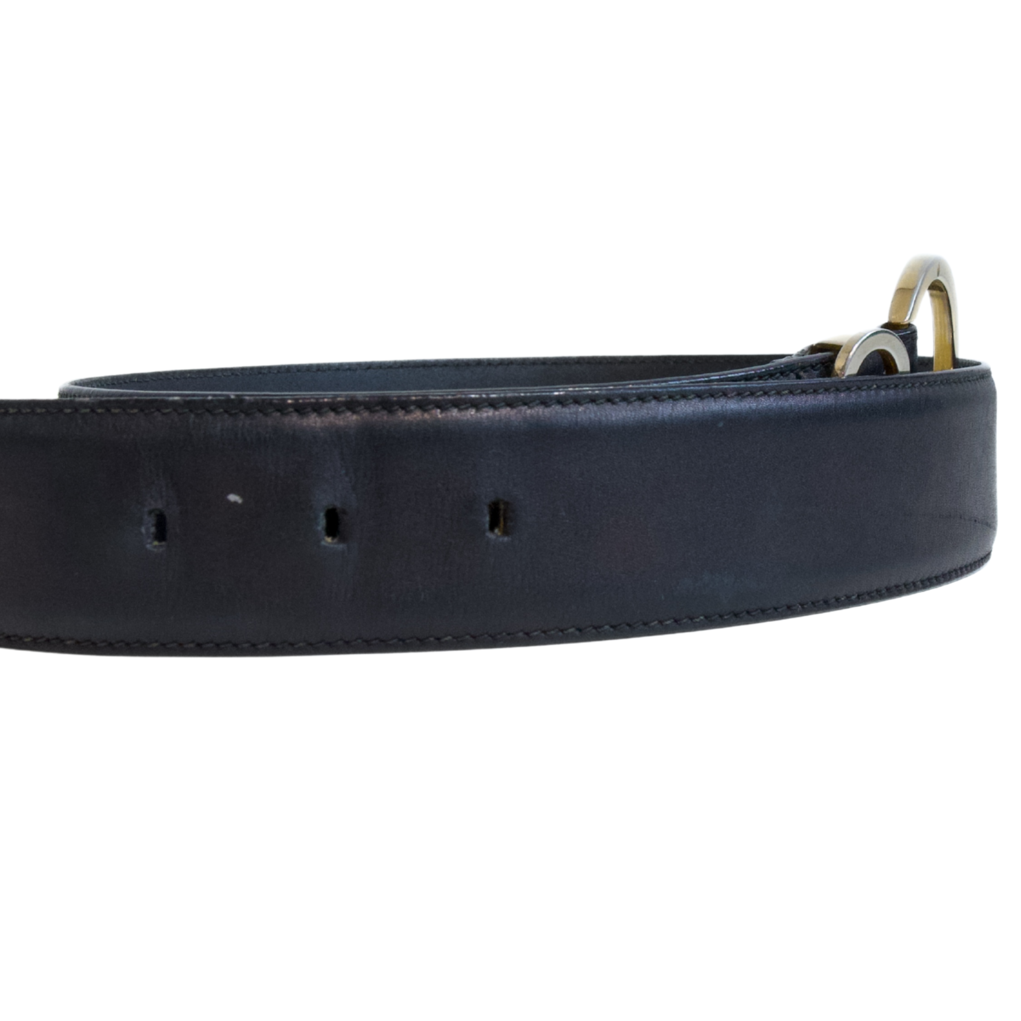 Fair. Creasing throughout leather, tarnishing of gold hardware, belt holes stretched.