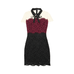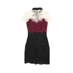 Sandro 'Rozen' collared, short sleeved midi dress in black, burgundy and cream floral lace. Features a black contrast collar with a tie up bow and a zipper down the back.