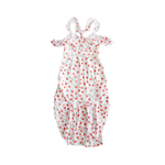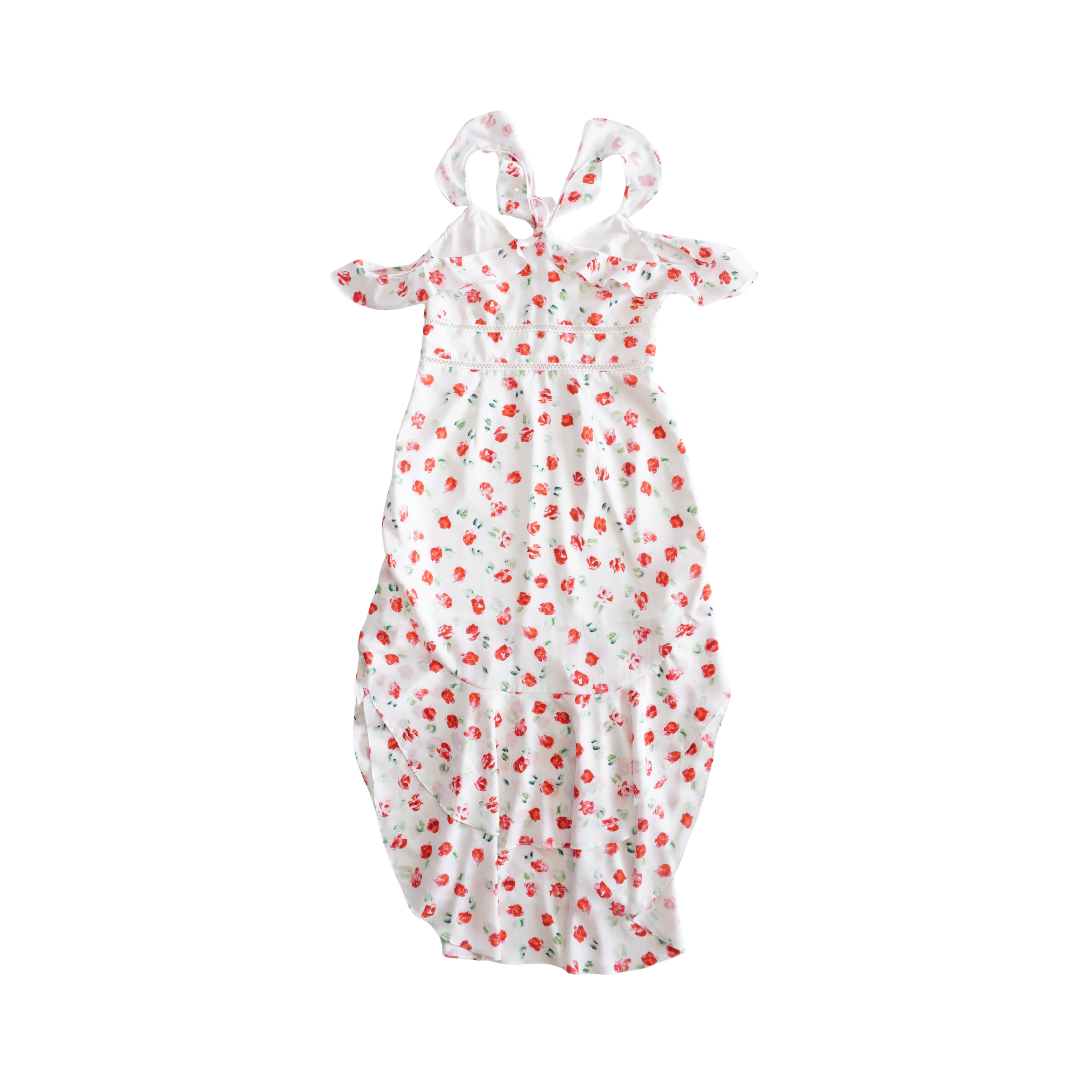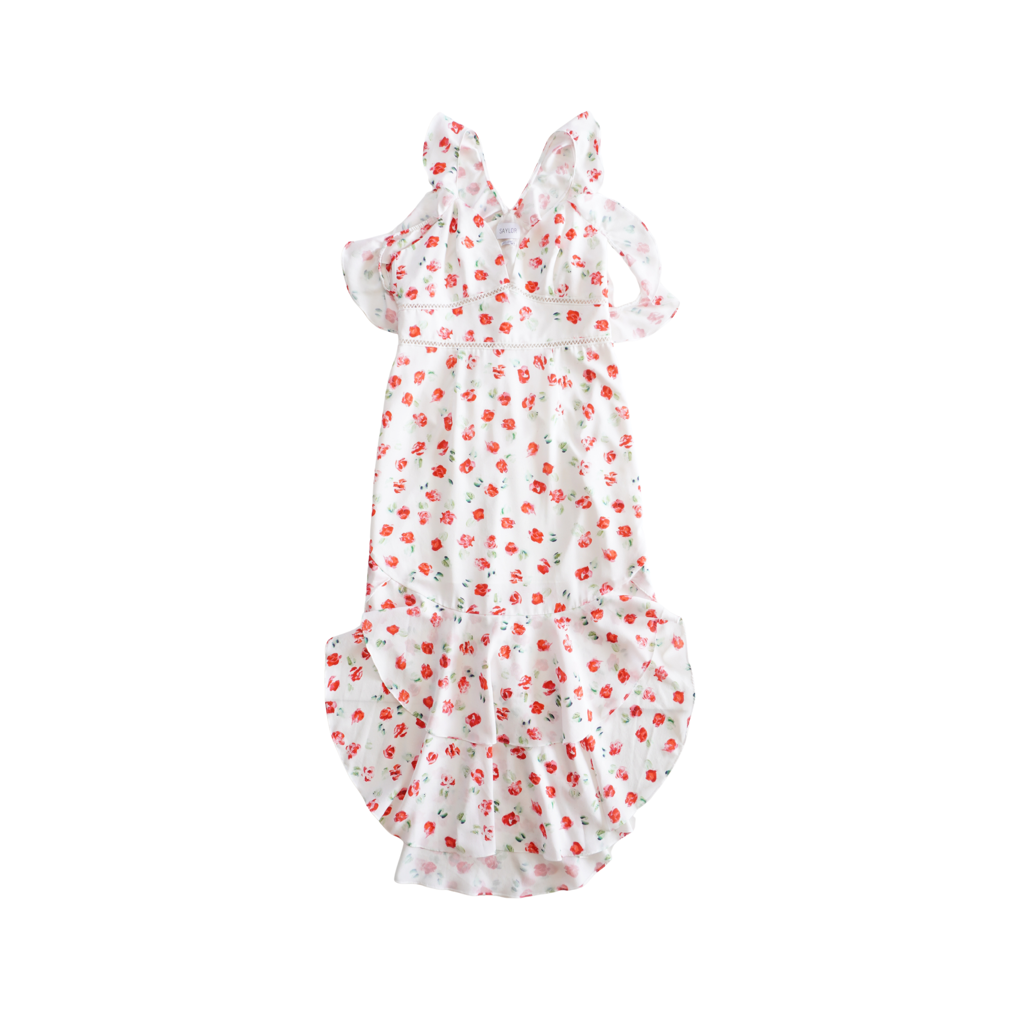 Saylor 'Kristin' v-neck midi dress in white with red and green floral print. Features ruffle straps, lace cutouts, and a high-low hem.