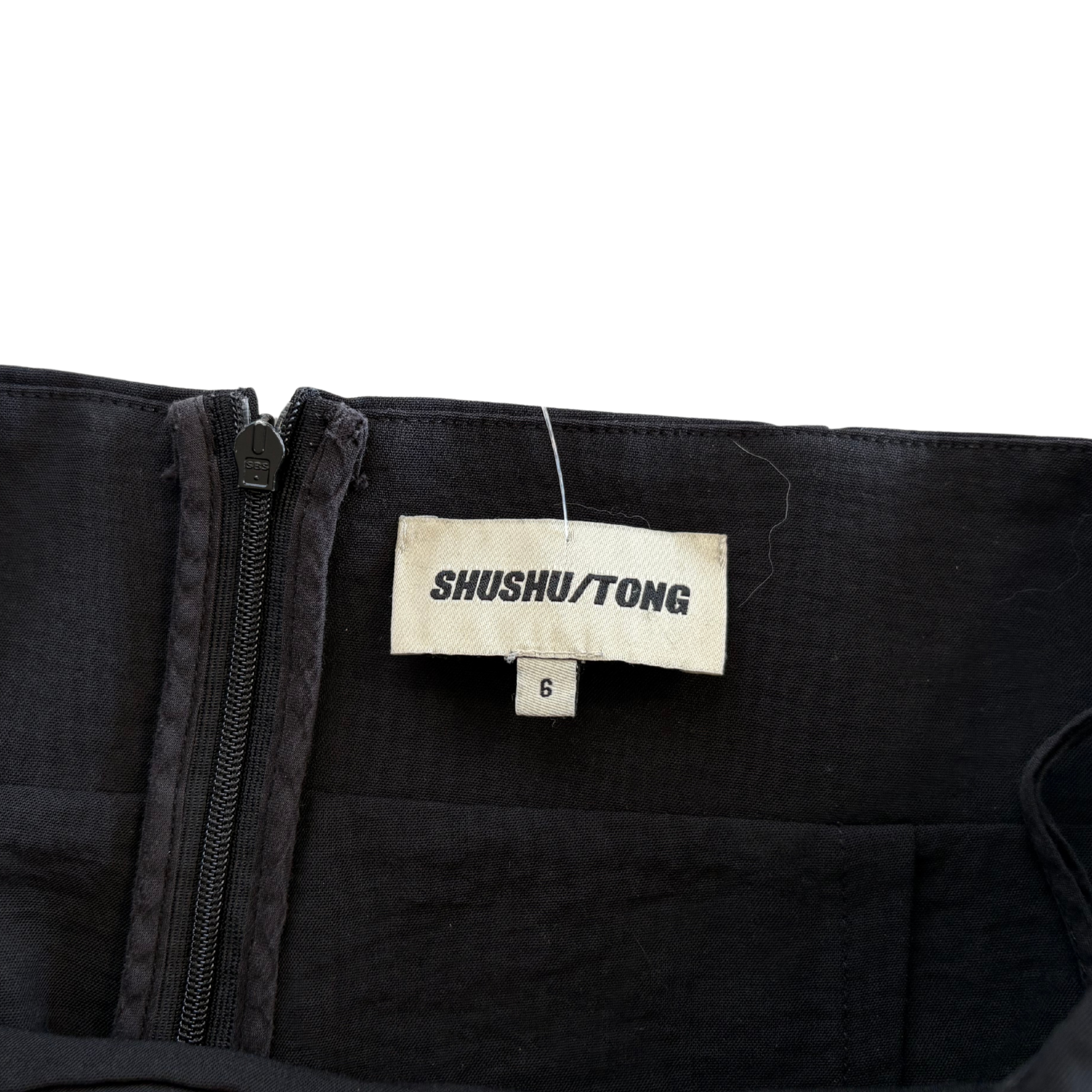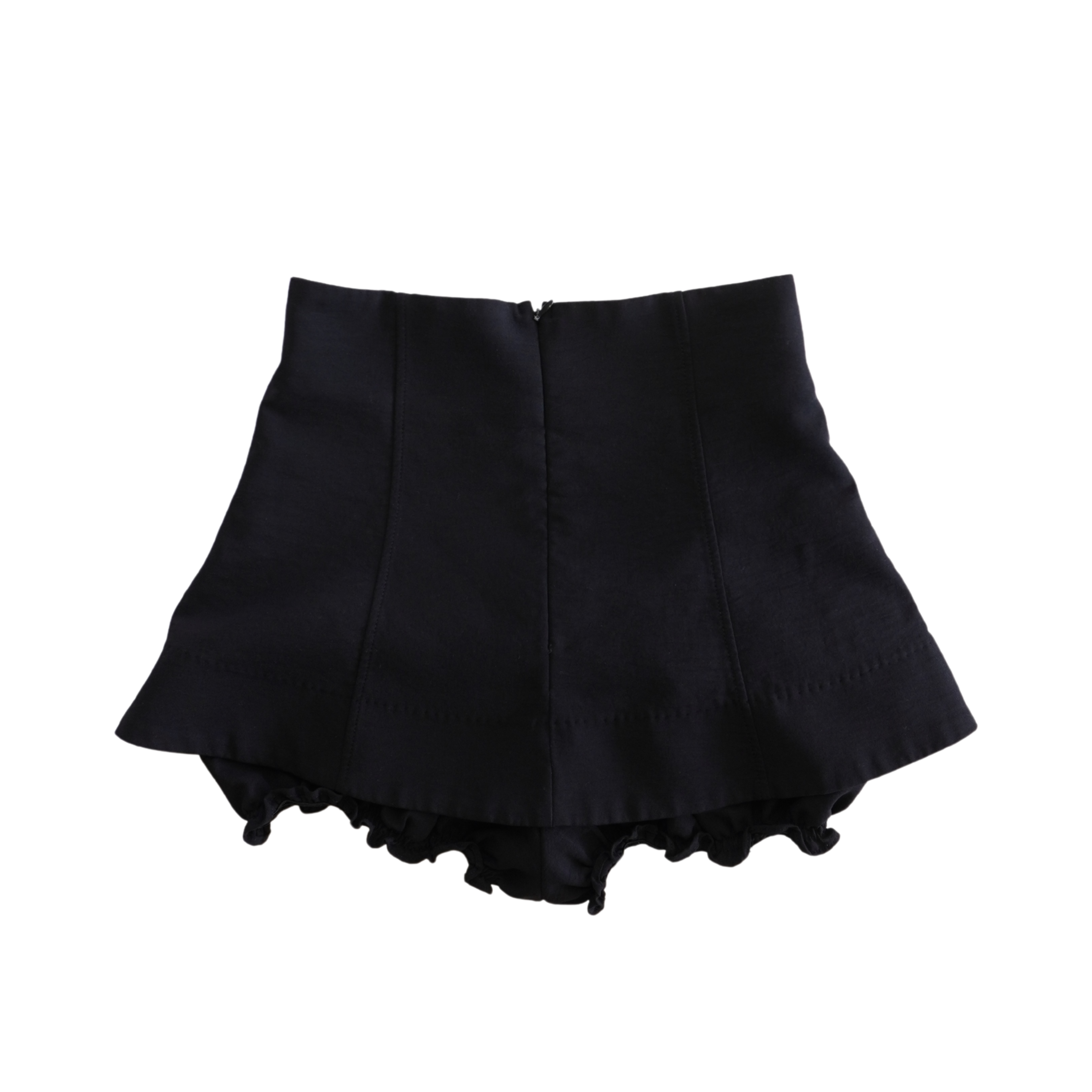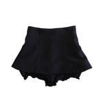 Shu Shu Tong high-waisted mini skort in black with two front panel details and bloomer shorts attached underneath.