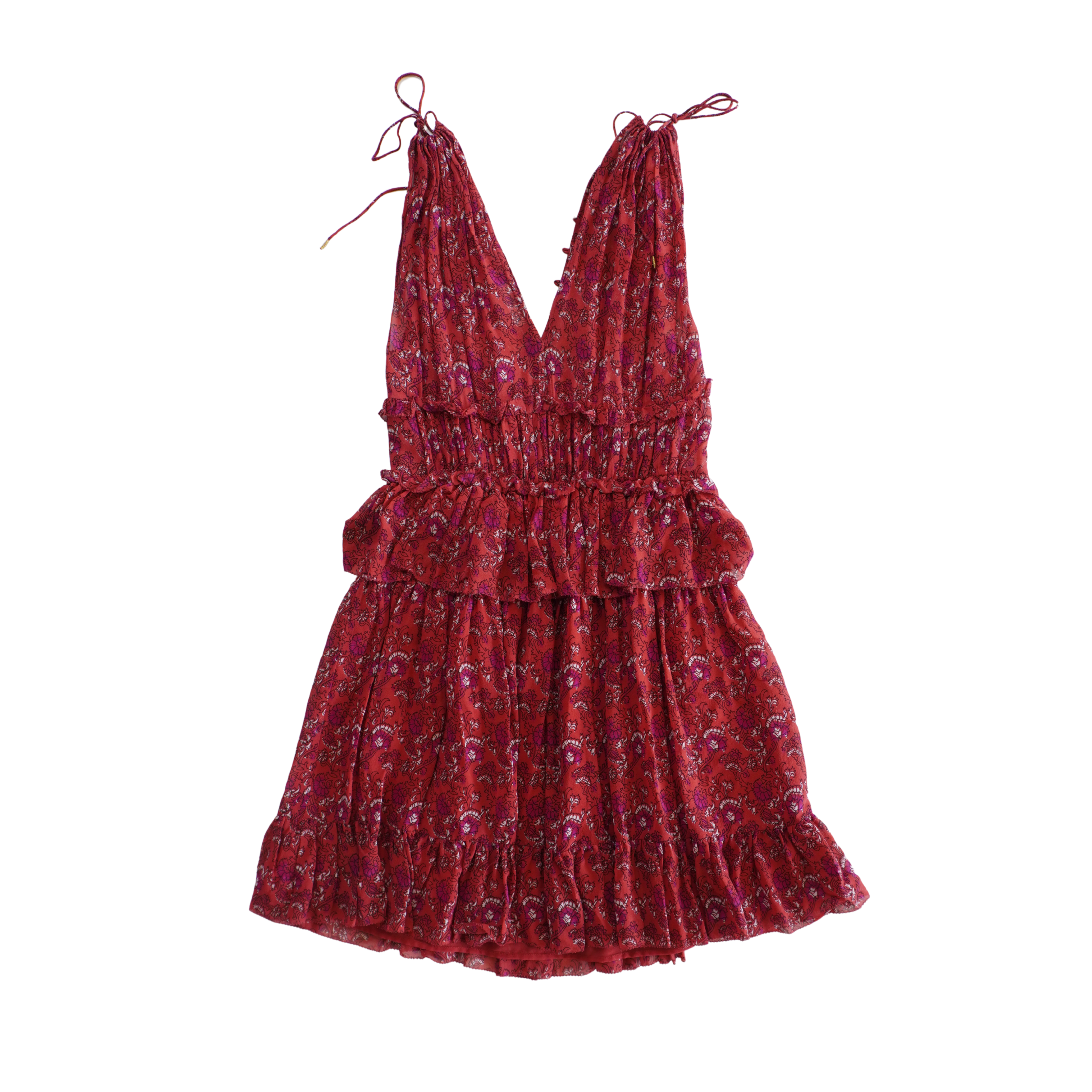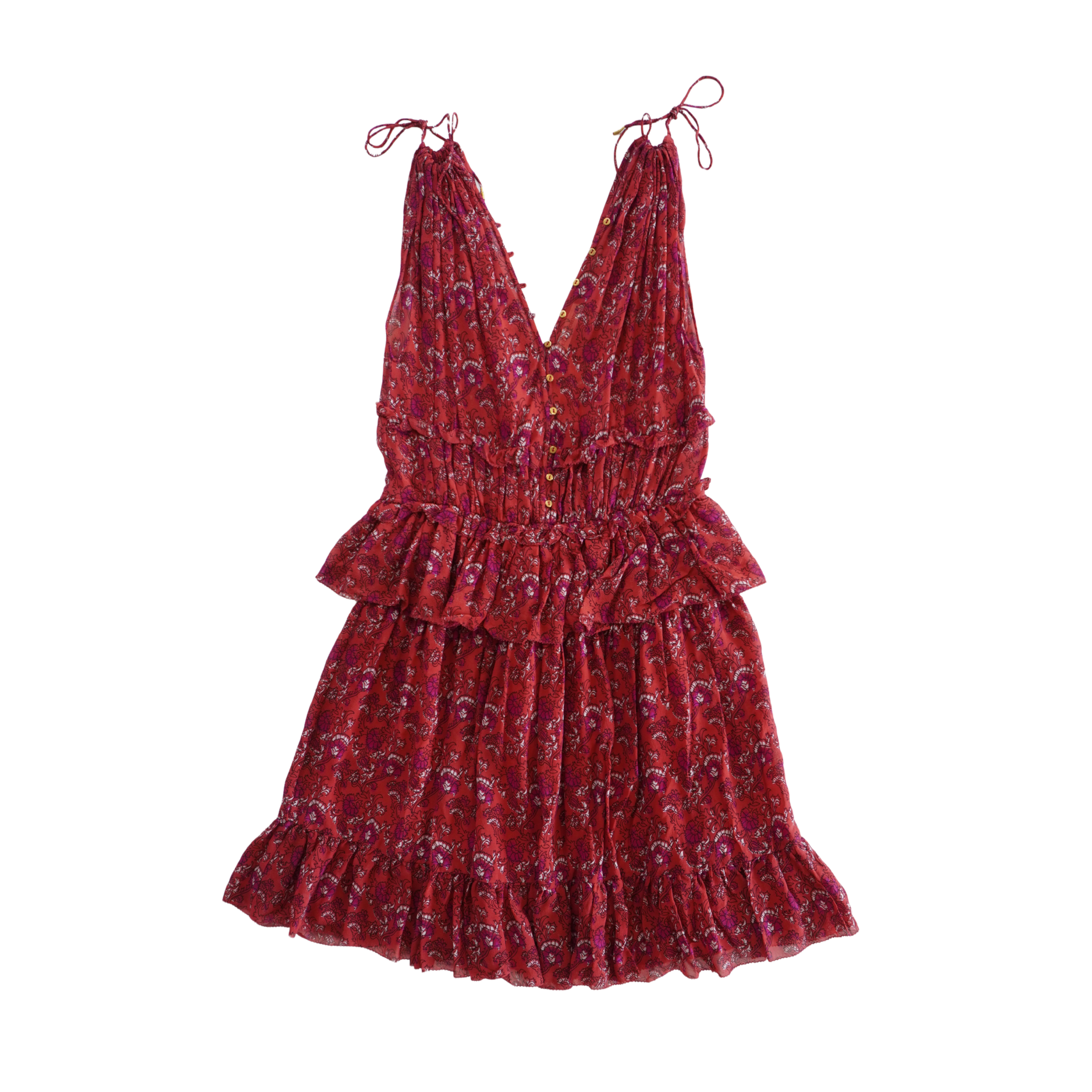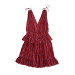 Ulla Johnson 'Noelle' dress in red silk with an all-over purple, black and white floral print, small gold buttons down the centre, tie straps, a shirred elastic waistband, and a tiered ruffle skirt.