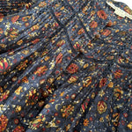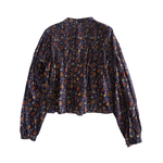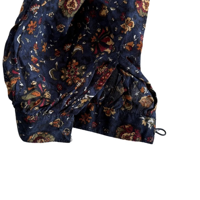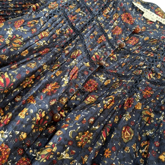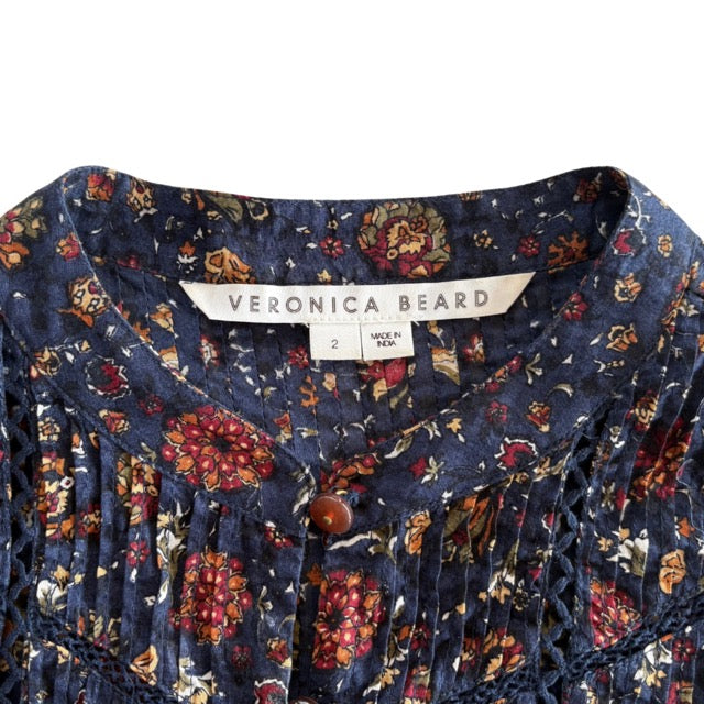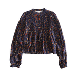 Veronica Beard 'Sherwood' balloon-sleeve blouse in navy all-over floral print with pleating to the top half of the shirt and on the top of the sleeves. Featuring a front crochet cutouts and a button-down closure with brown loop buttons.