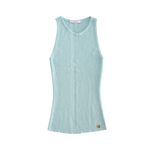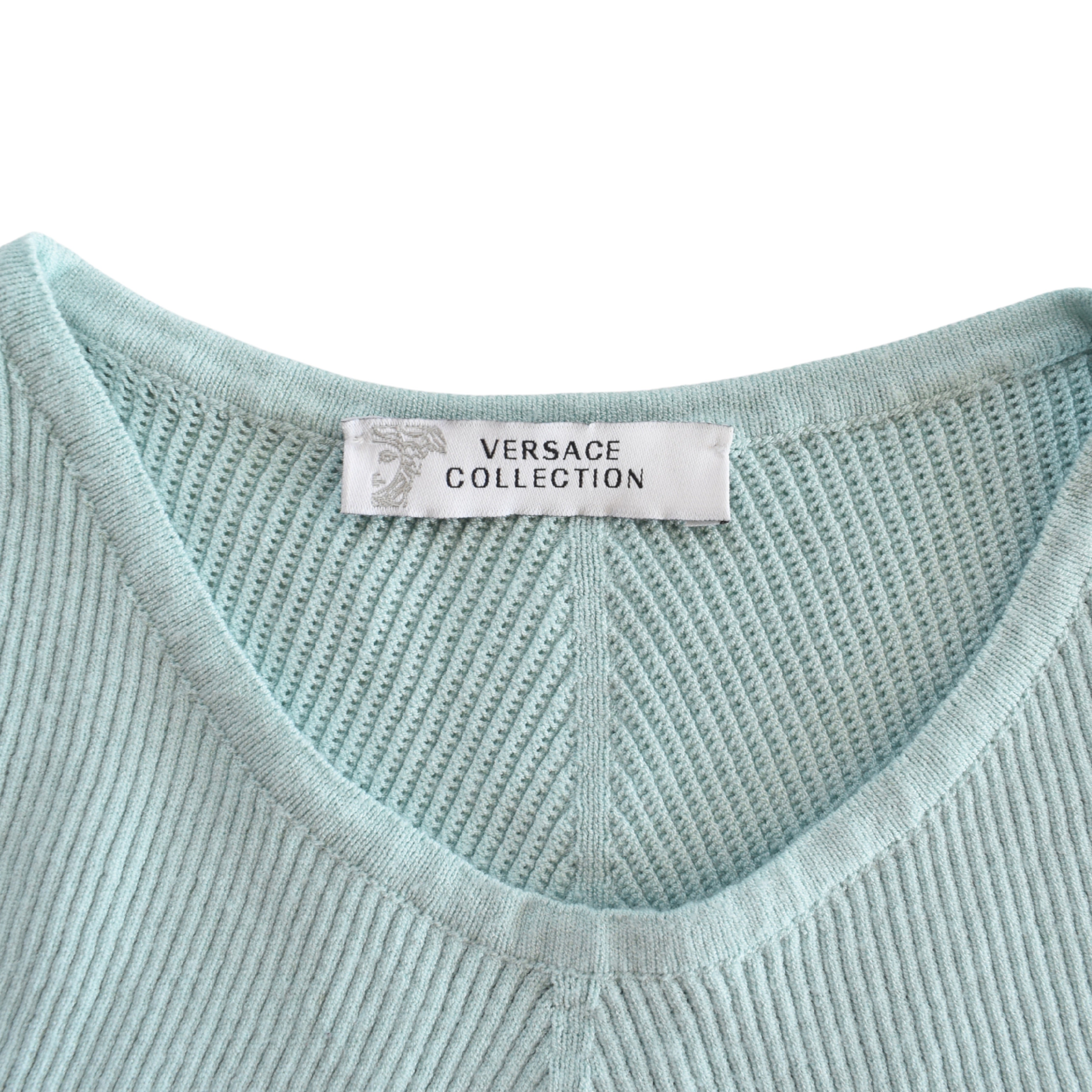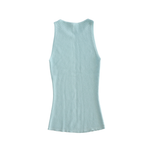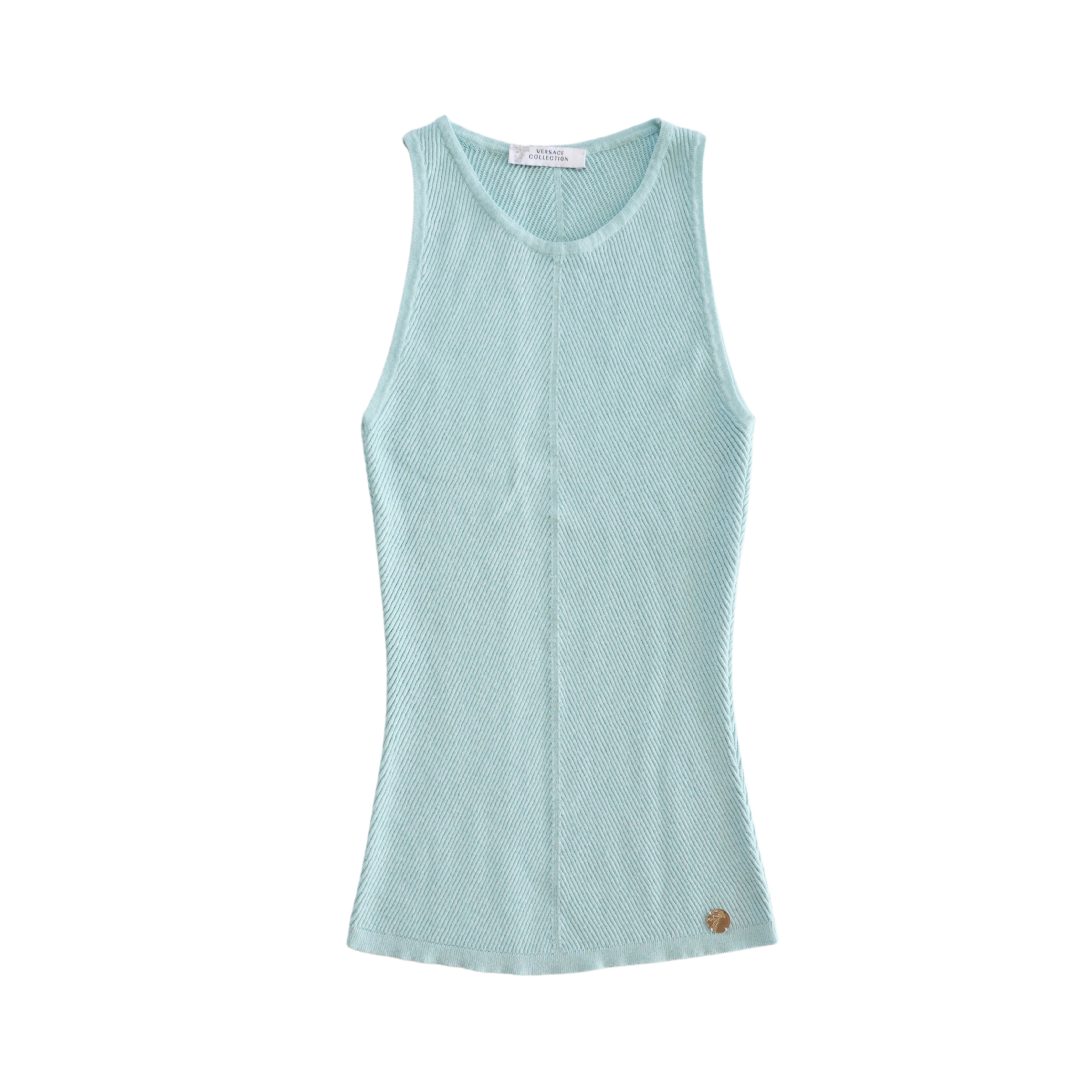 Versace tank top in mint blue ribbed knit with a small gold Medusa charm on the hem.