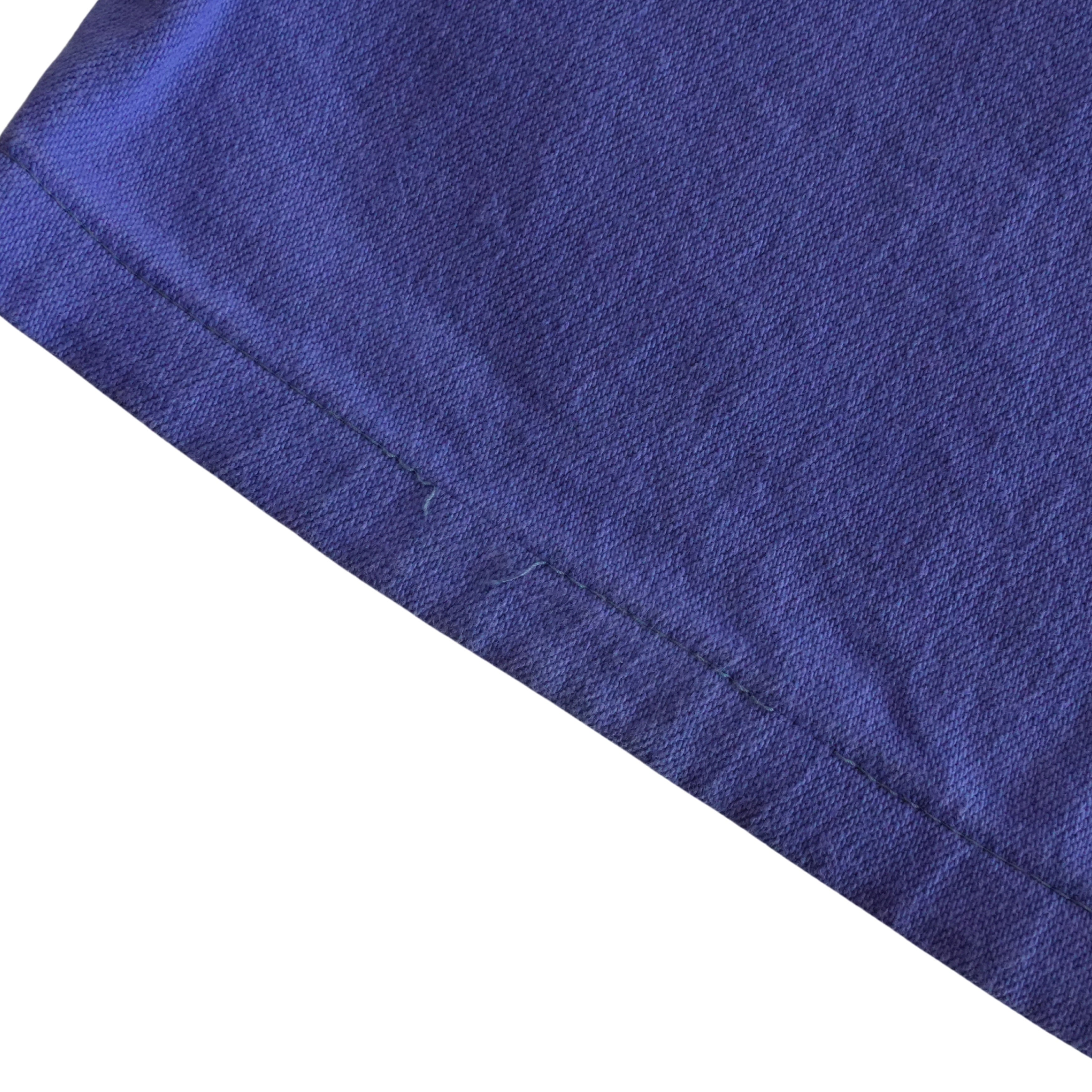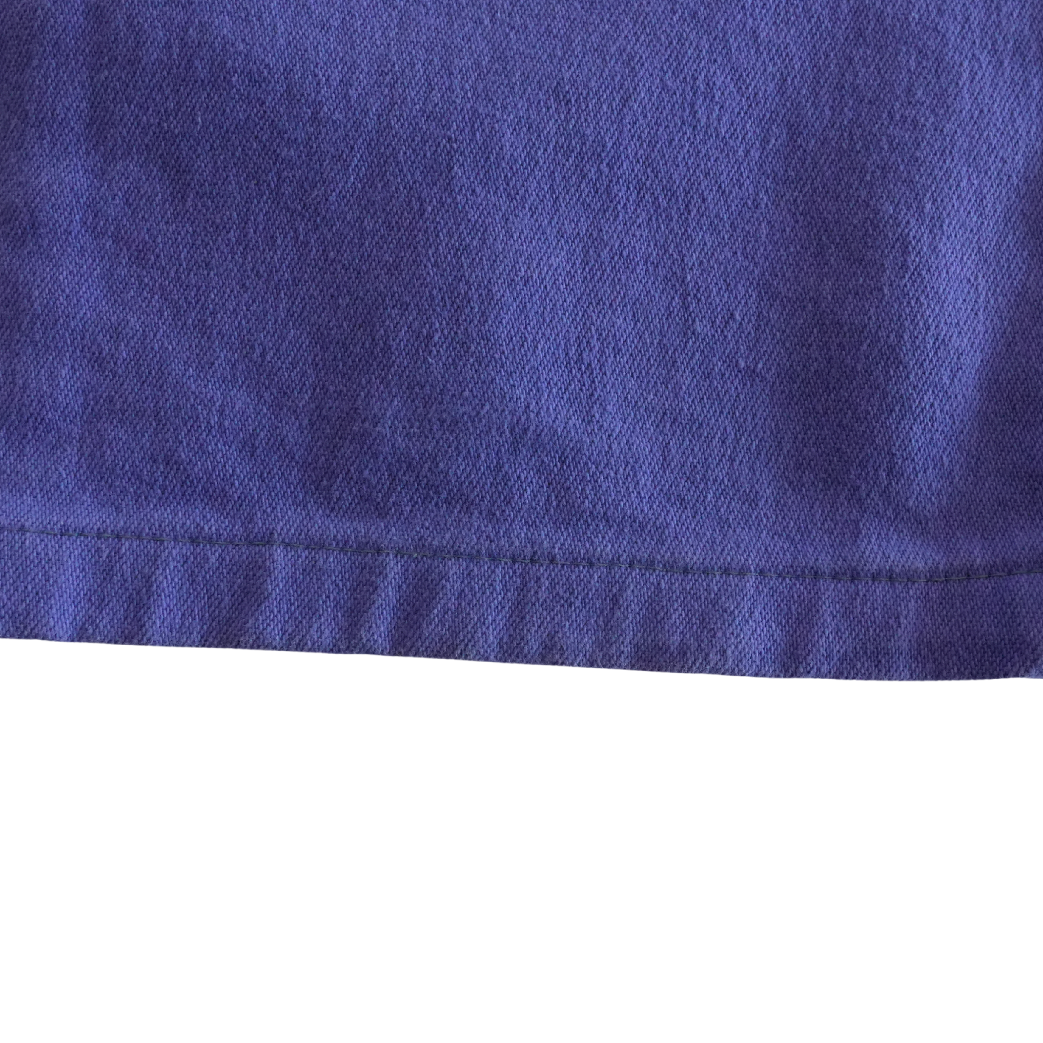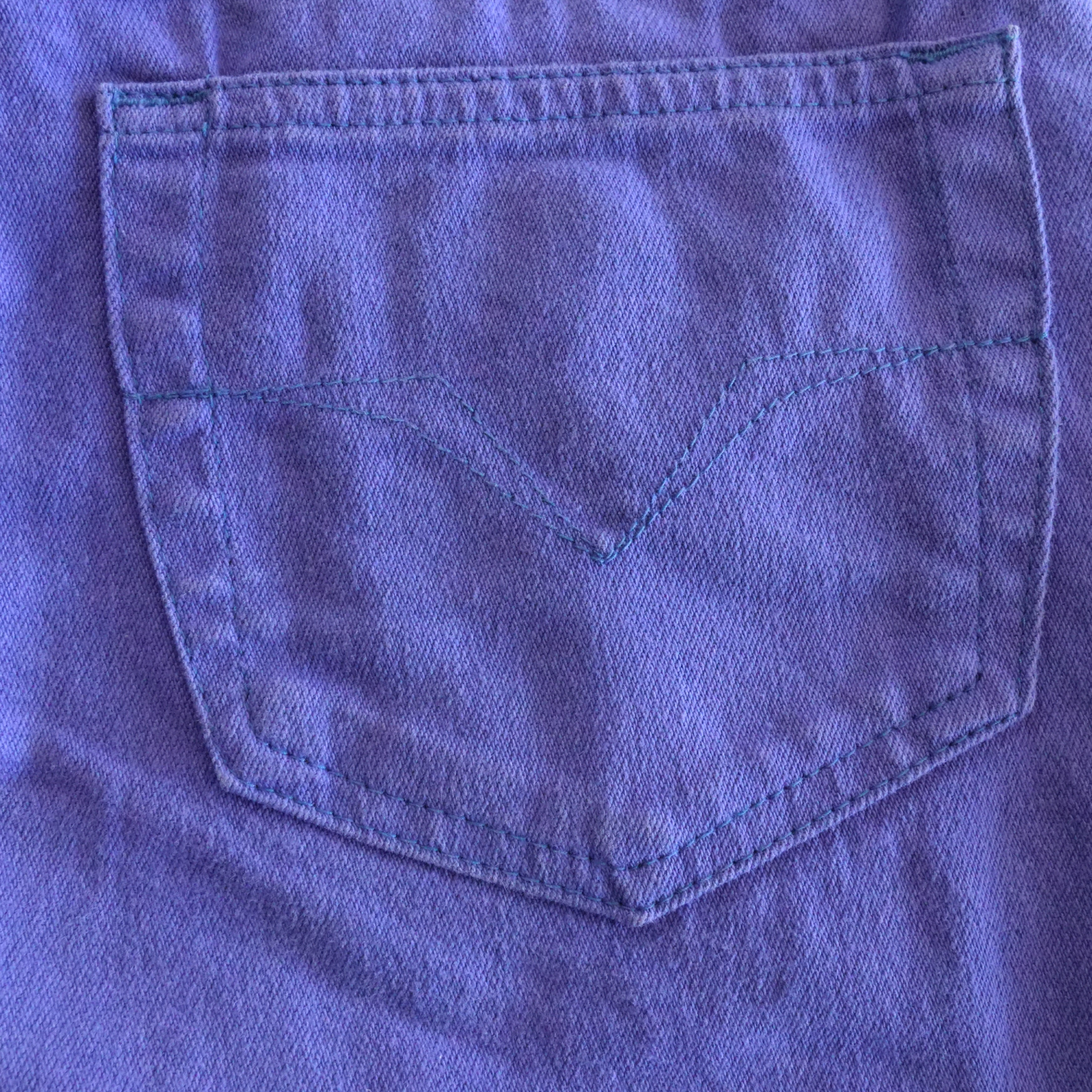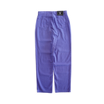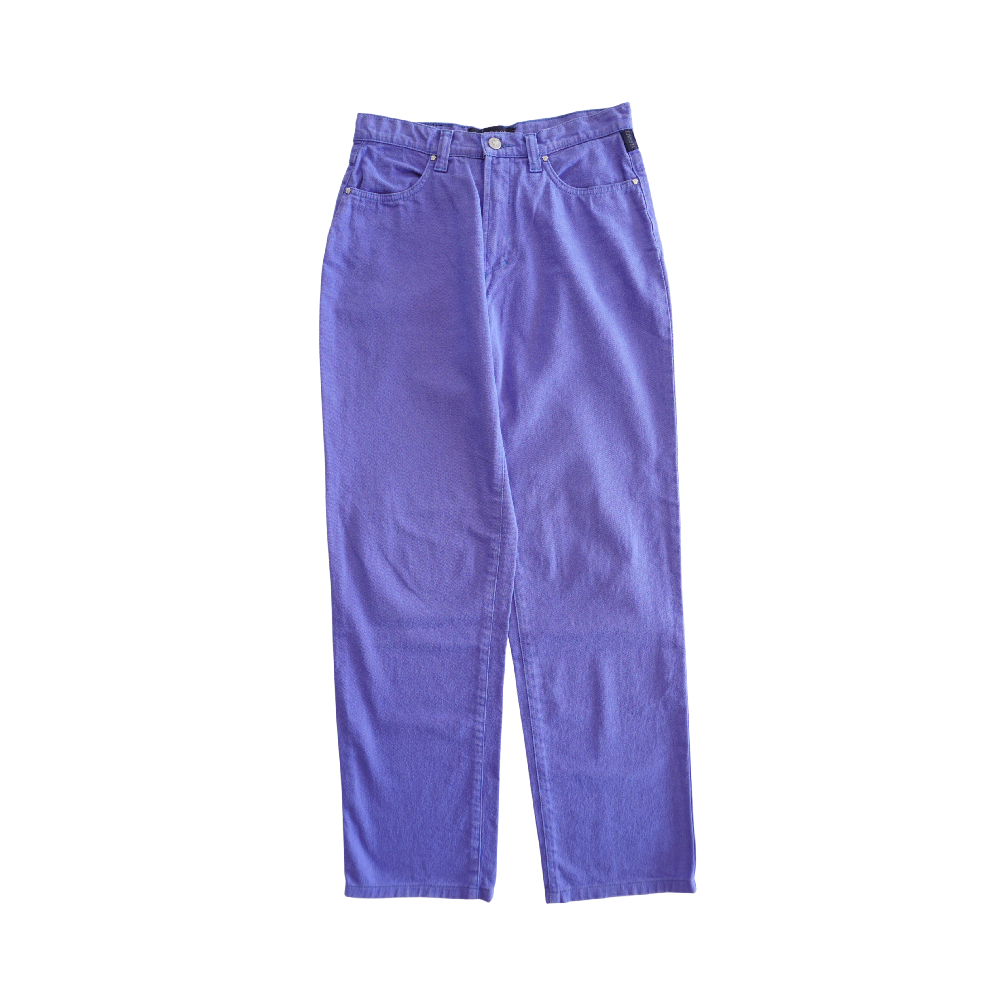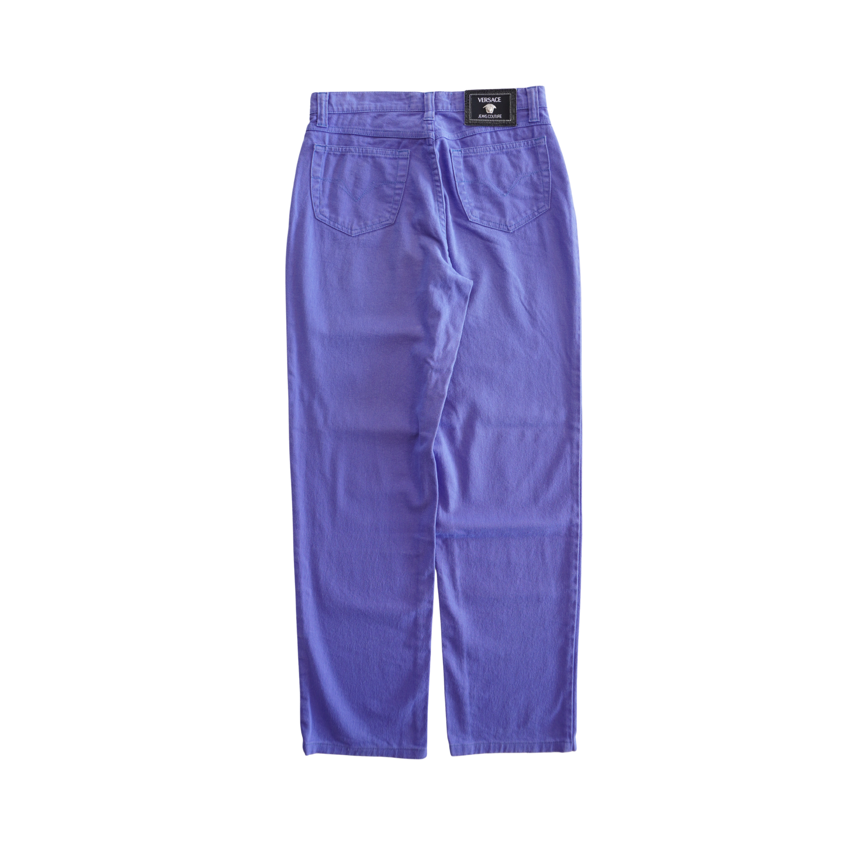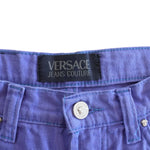Versace straight-legged jeans in purple denim with four-pocket styling and zipper fly.