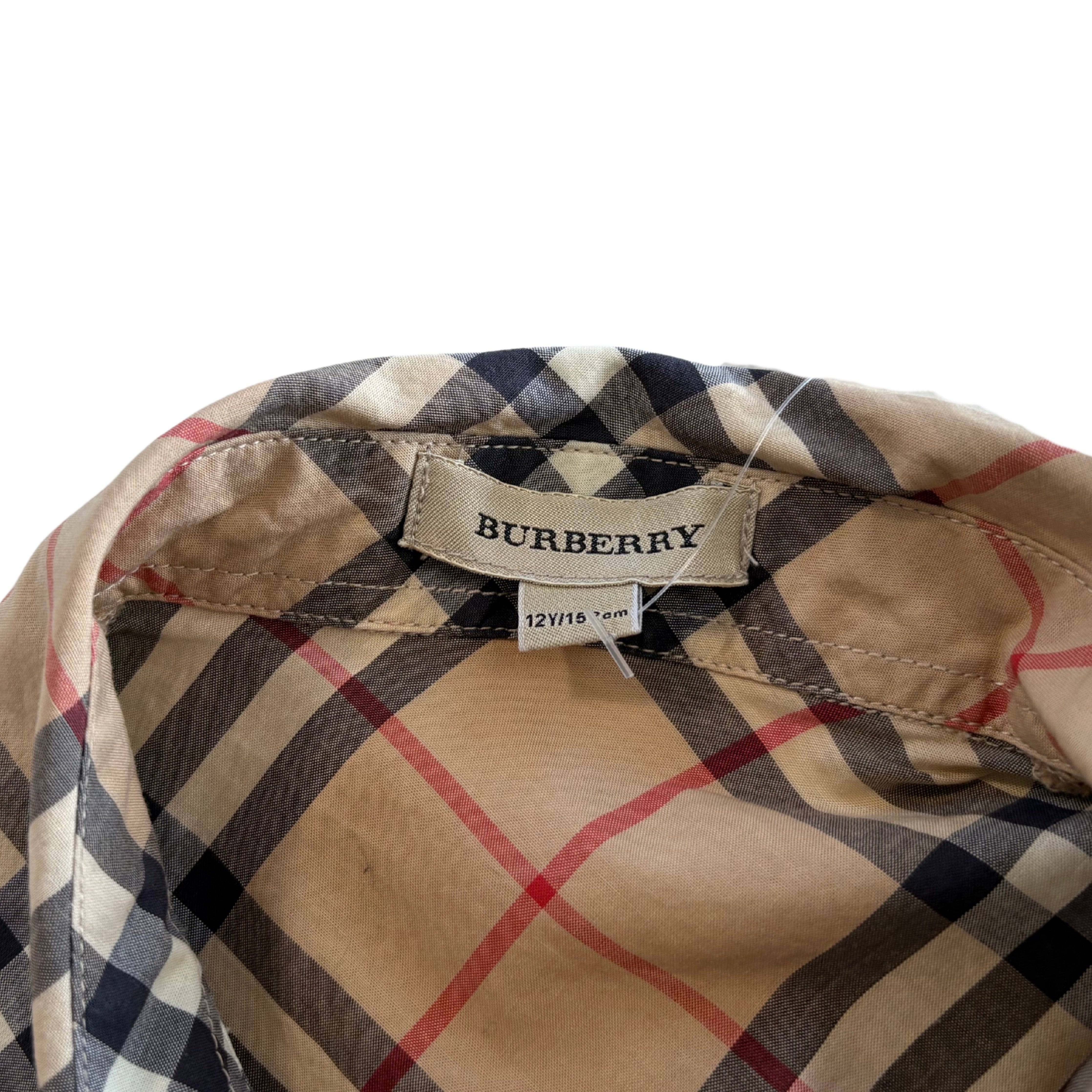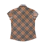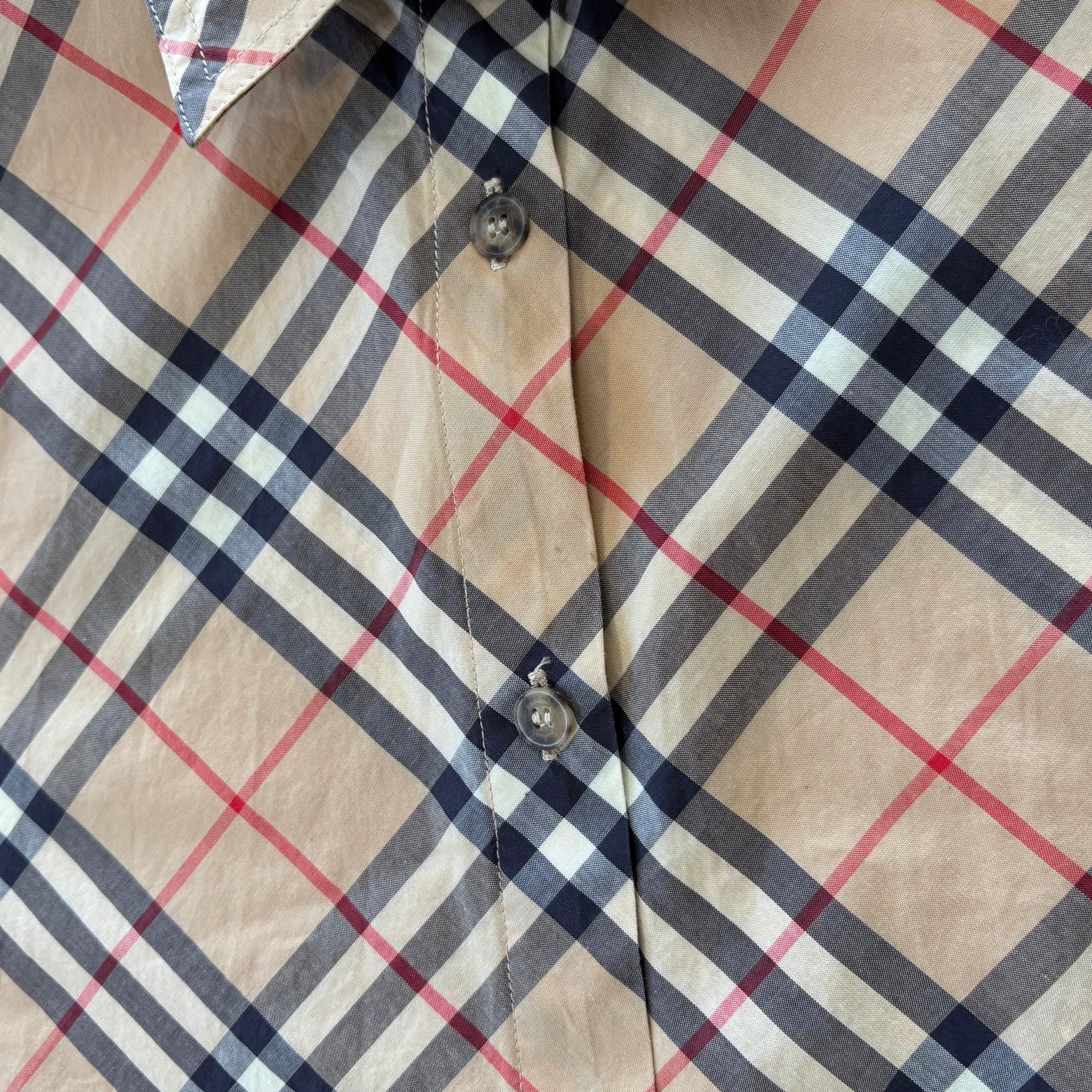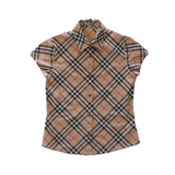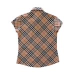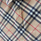 Burberry short-sleeve button-down shirt in beige novacheck printed cotton with tortoise buttons and a point collar.