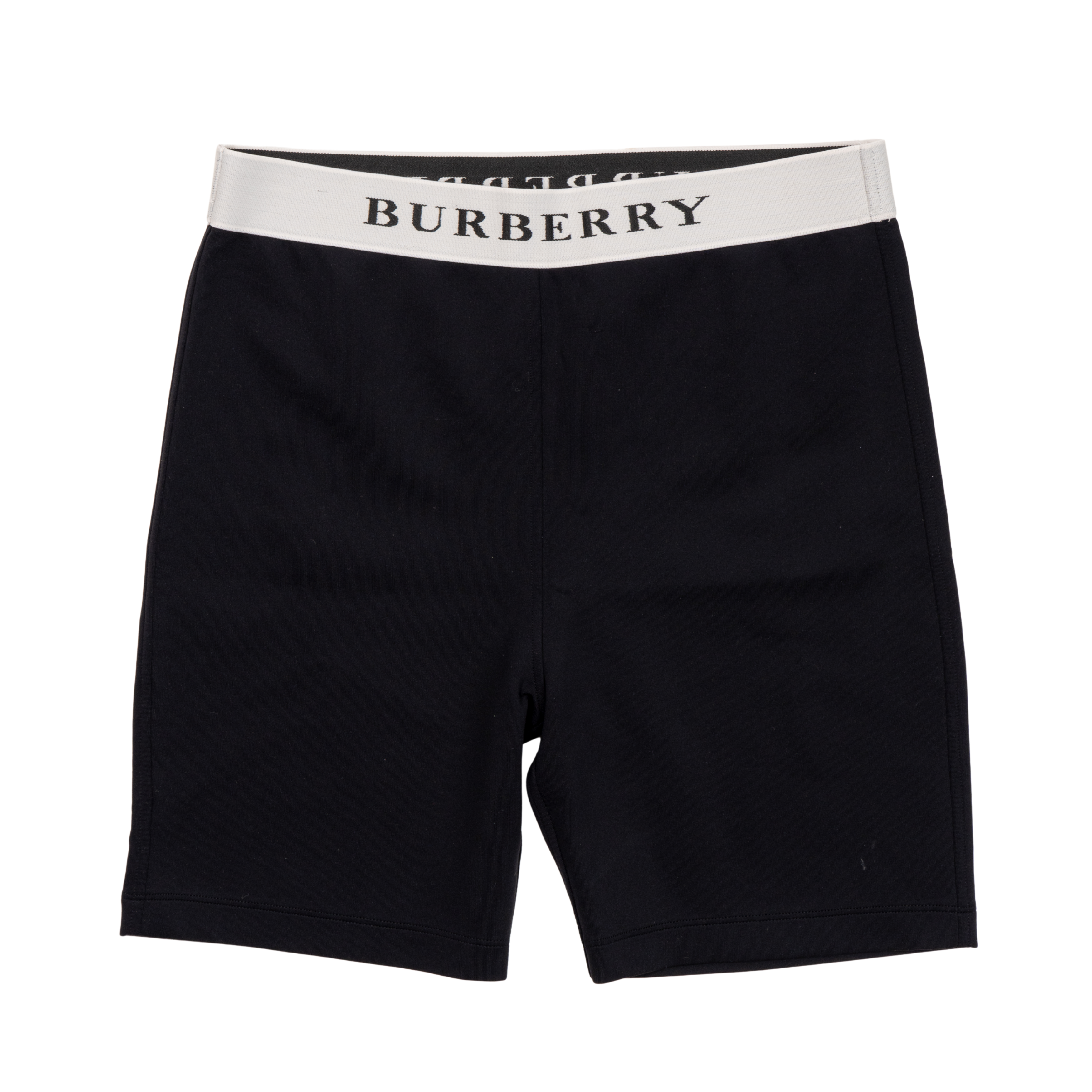 Burberry Logo bike shorts in black with a white logo waistband. Features a high waisted cut, a 6" inseam, and seams down the sides and centre.
