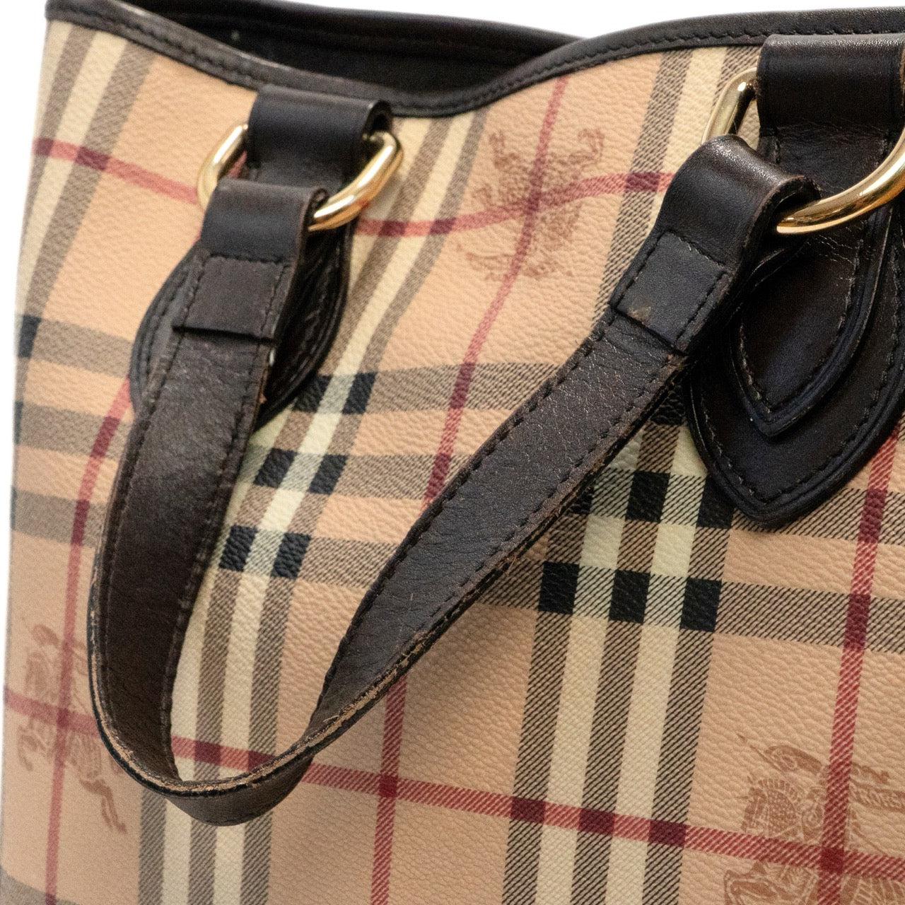 Burberry handbag in beige novacheck coated canvas with dual top handles in brown leather with gold D-rings and brown leather trim. Featuring snap button closure opening to a brown leather canvas lining with single slip and zip pockets.