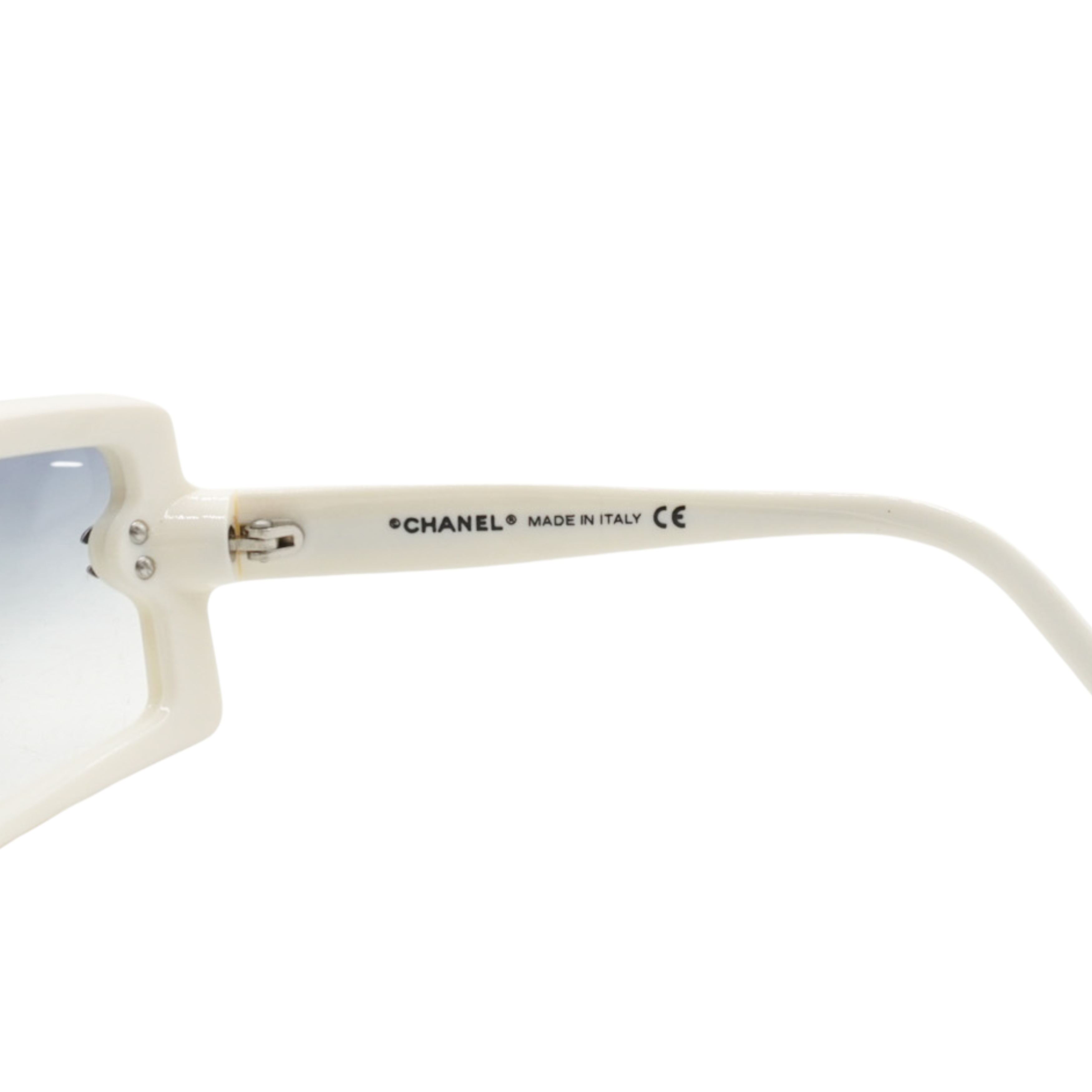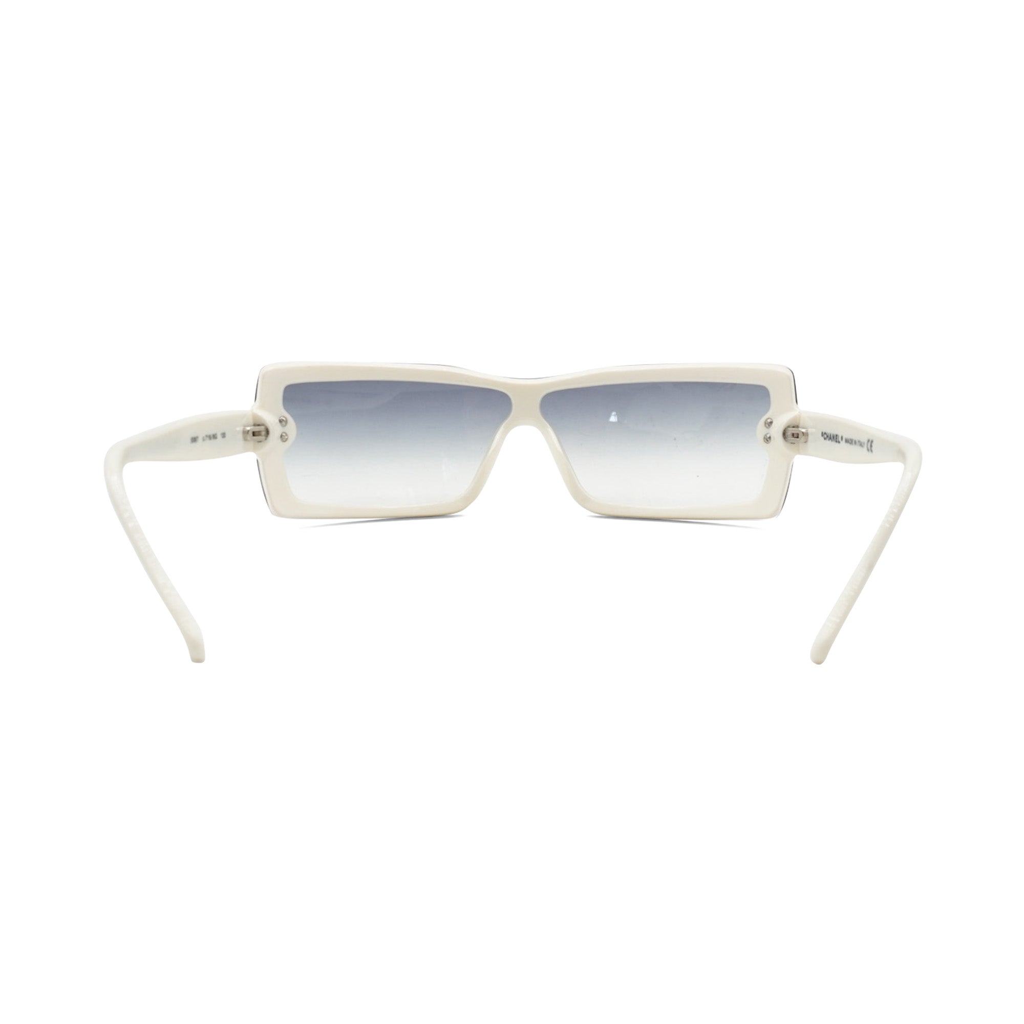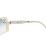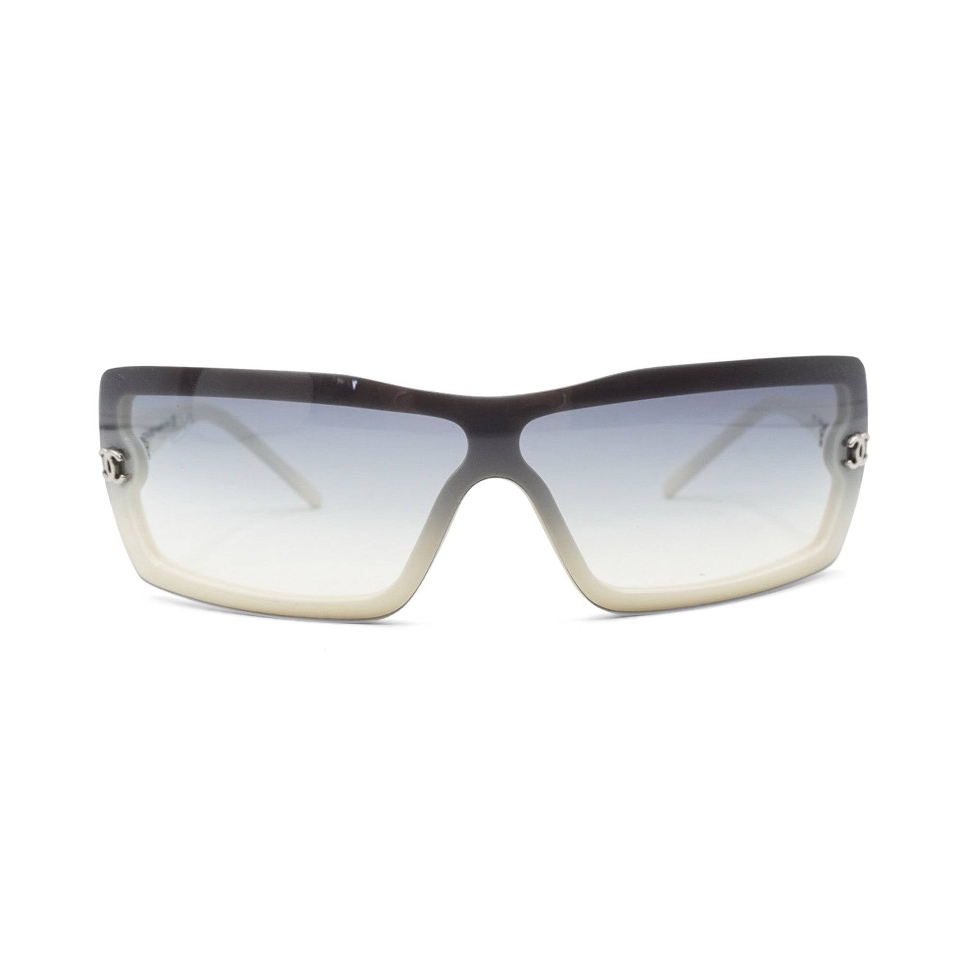 Chanel shield style sunglasses with white acetate arms and blue ombre lenses. Features small silver 'CC' logos on the sides, and skinny arms.