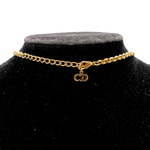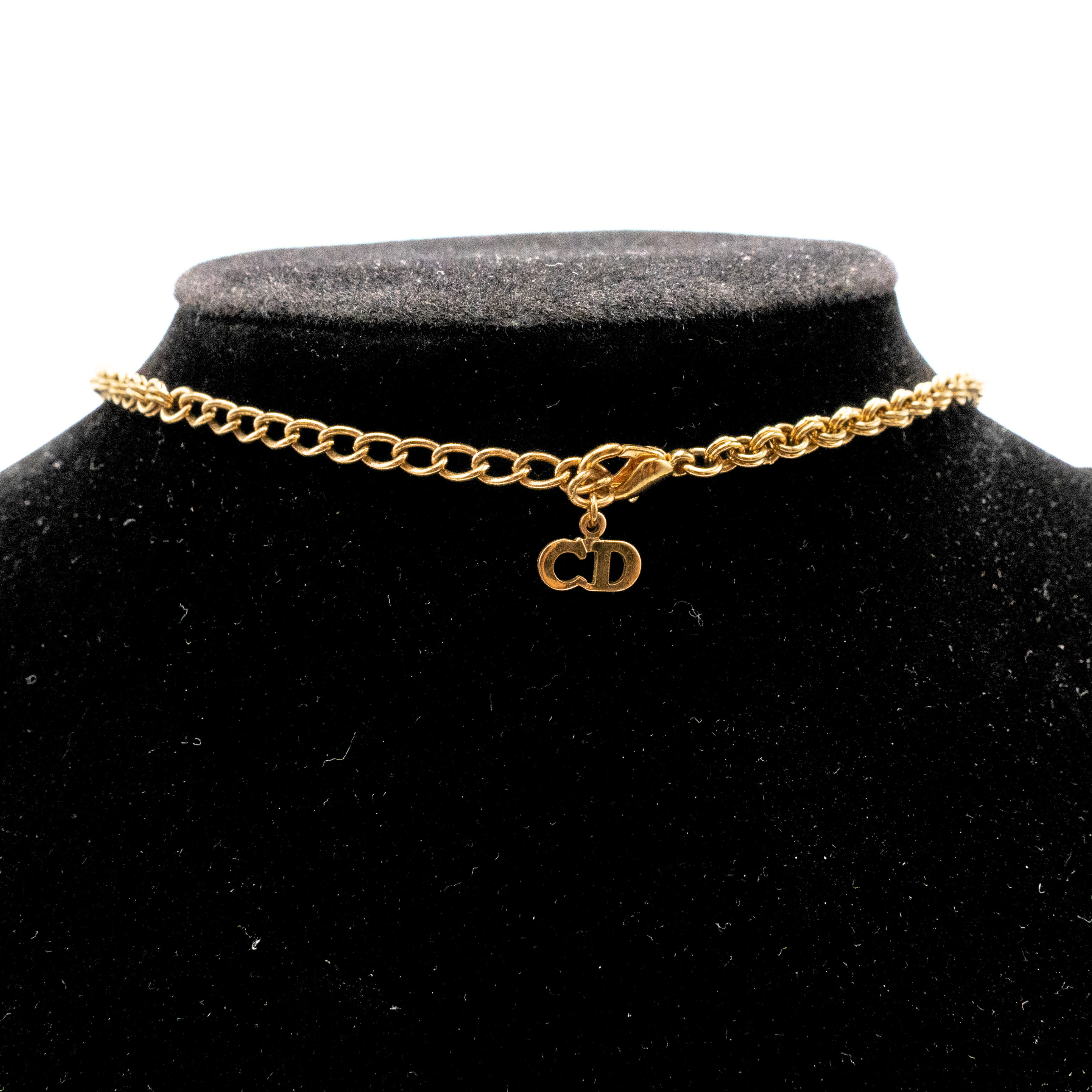 Christian Dior vintage necklace with gold CD logo in the centre with two rhinestones on either side of logo. Features circular gold chain links, adjustable length, and a small logo by the clasp.