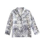 Christian Dior 'Chez Moi' long-sleeve button-down pyjama shirt in white and navy silk twill with all-over Toile de Jouy motif pattern. Featuring two front patch pockets, notched collar and black piping.