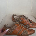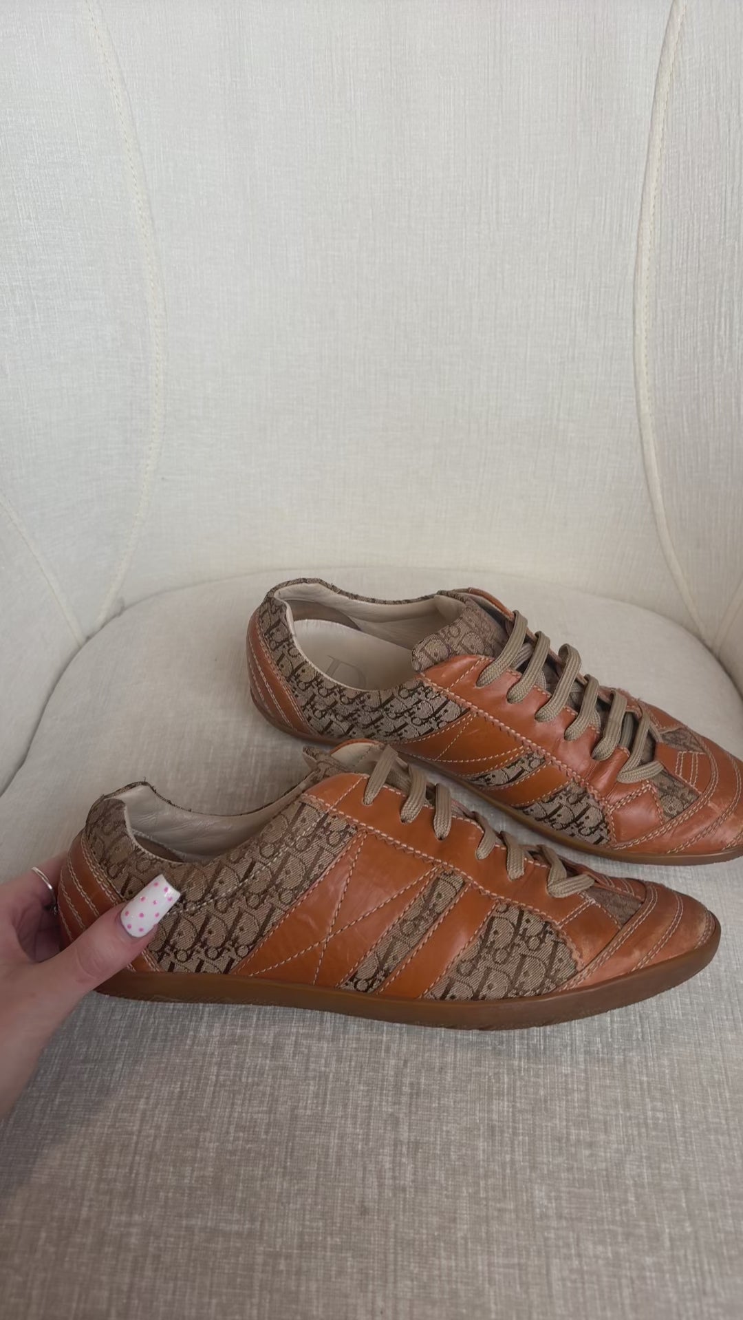 Christian Dior vintage sneakers in beige diorissimo printed canvas with tan brown leather panels throughout, beige laces, and a flat sole.