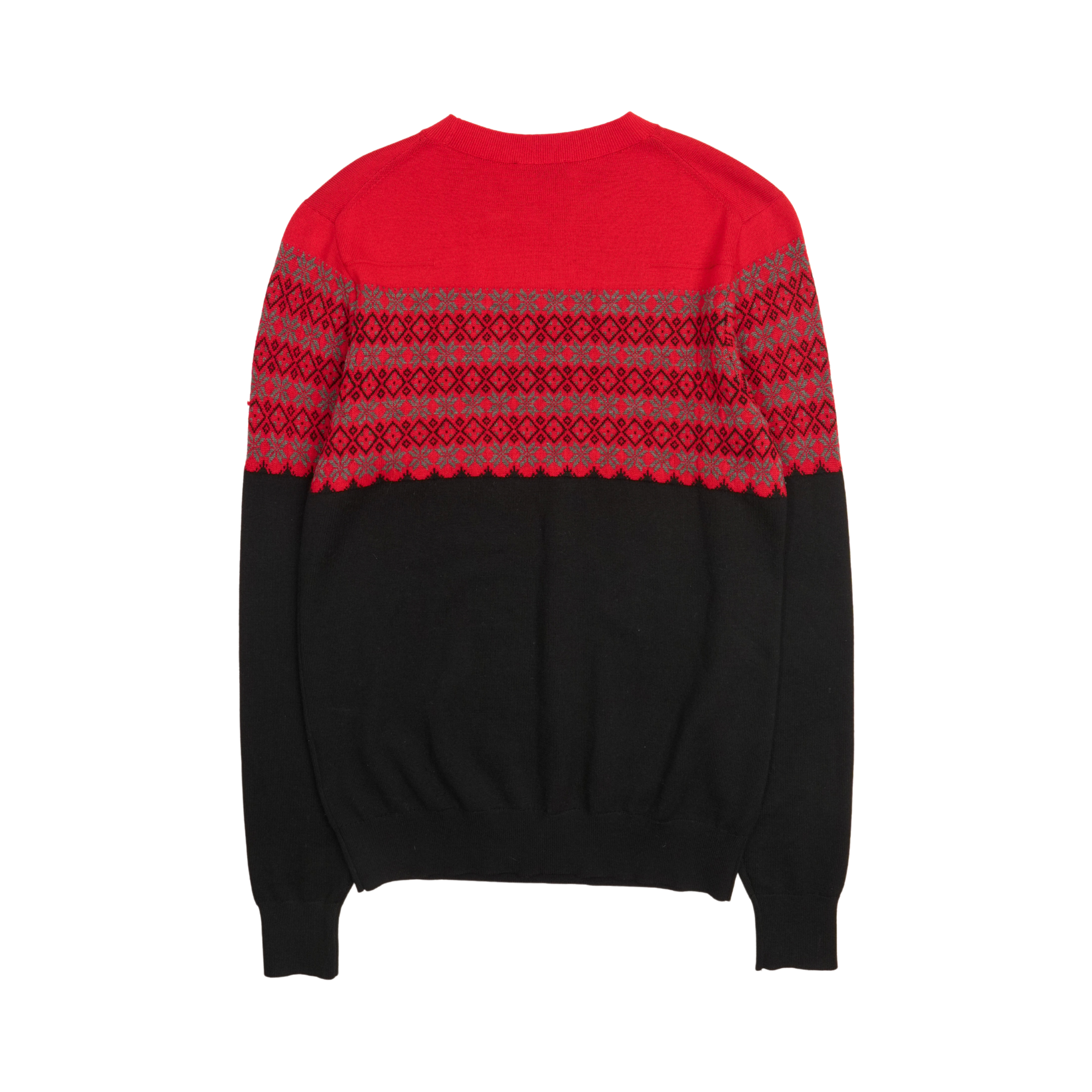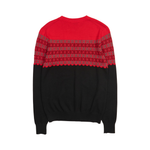 Christian Dior pullover sweater in black and red wool with a grey knit snowflake pattern across the chest and sleeves.