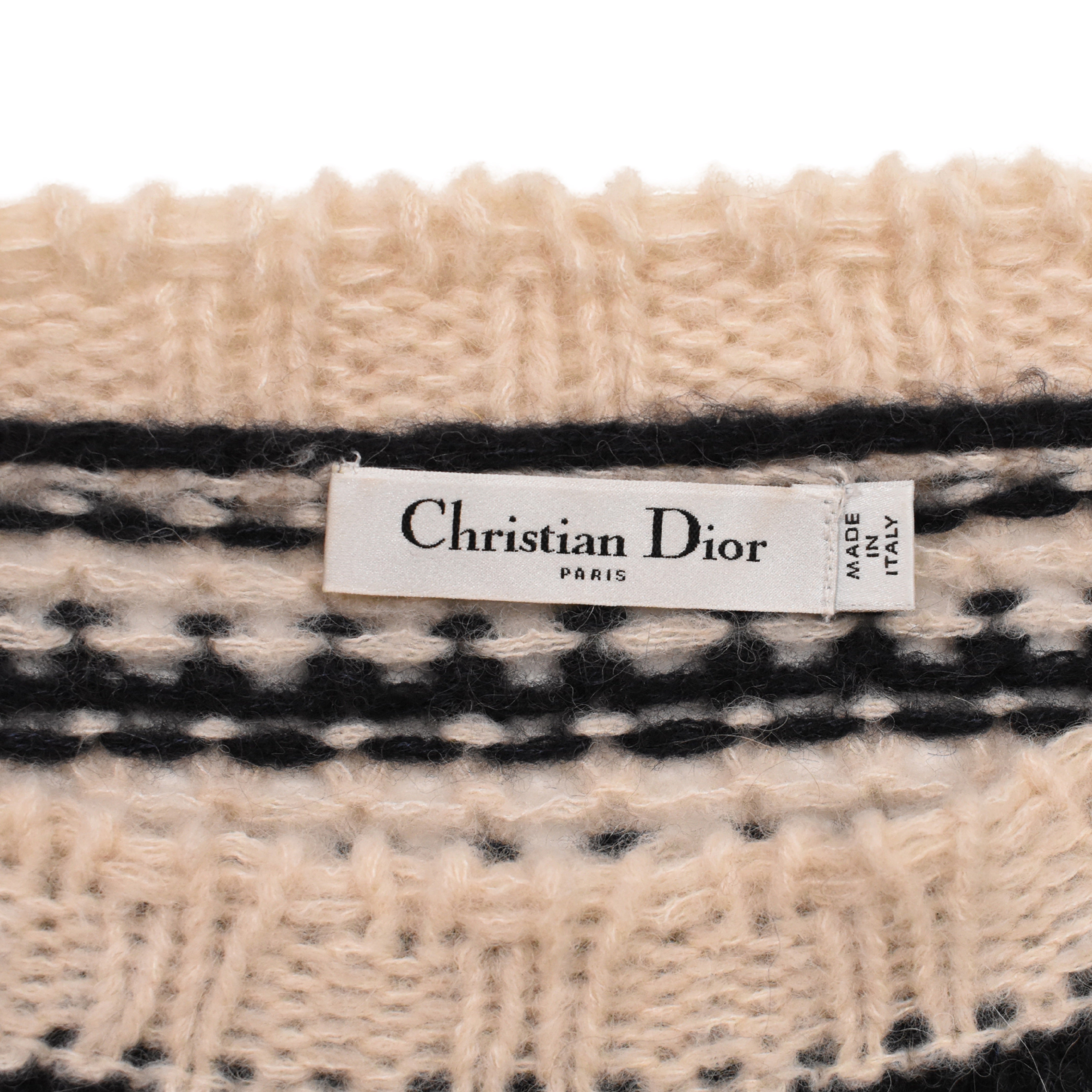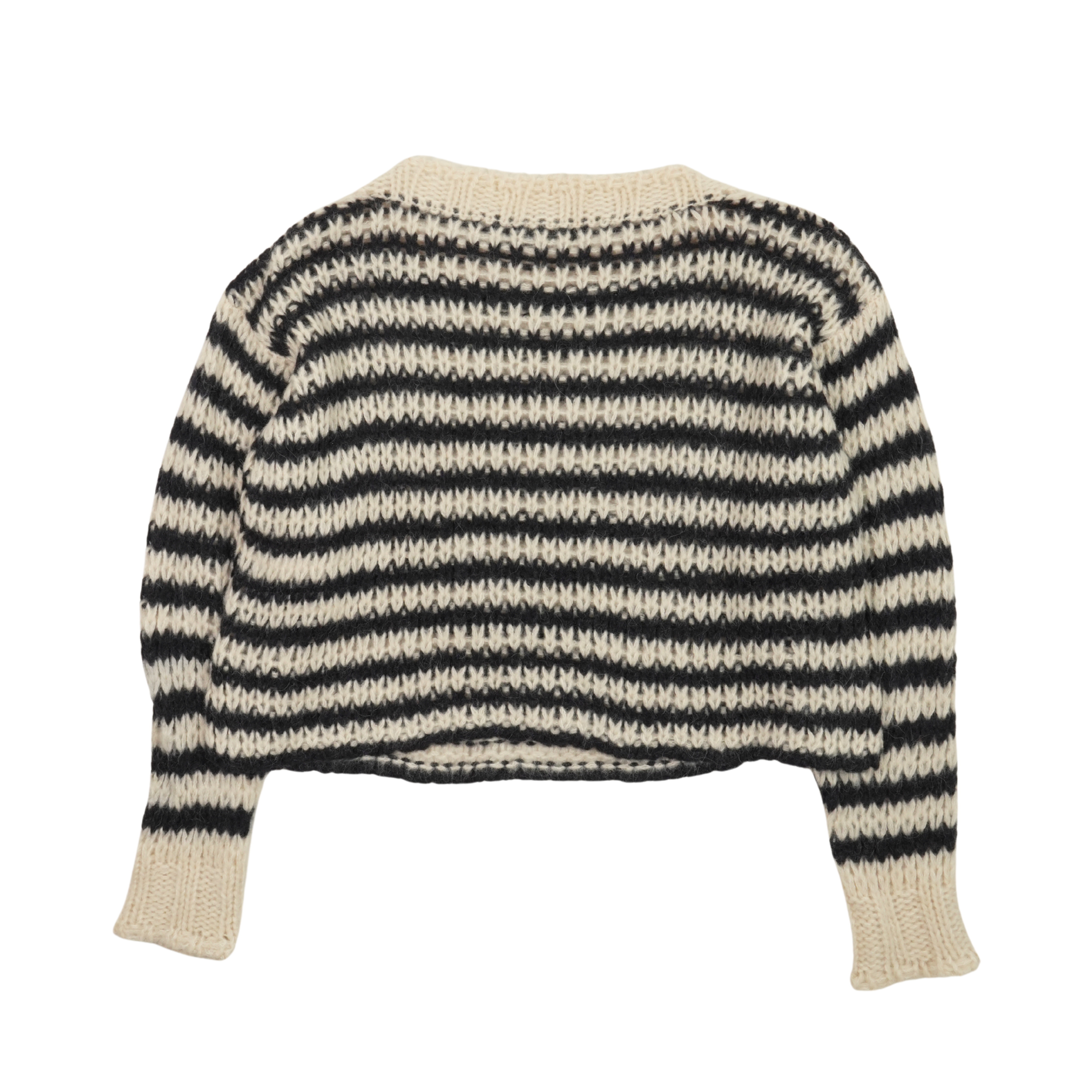 Christian Dior cropped sweater in a black and white striped knit blend with a boat neckline, a subtle crop, and gold anchor buttons at the shoulder.