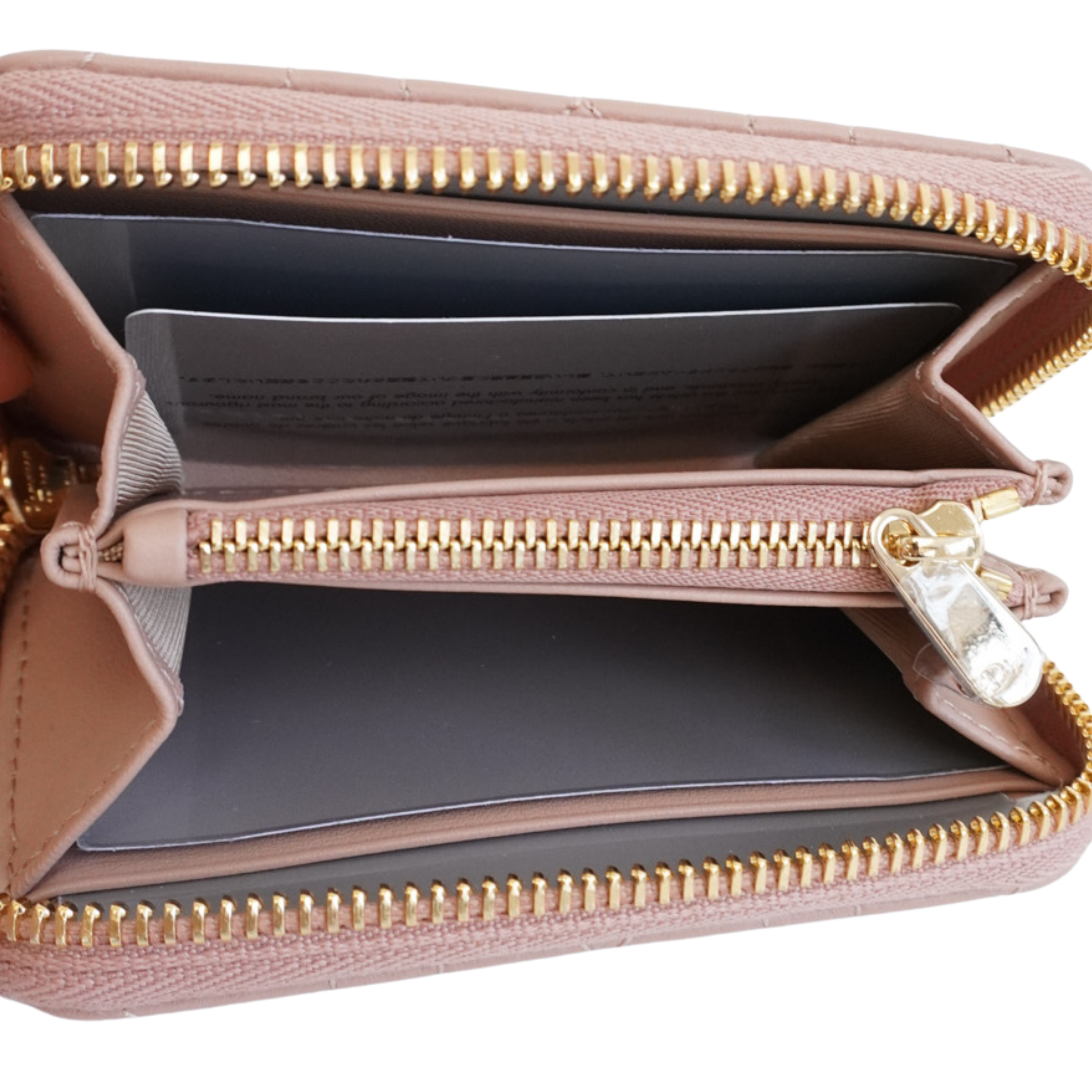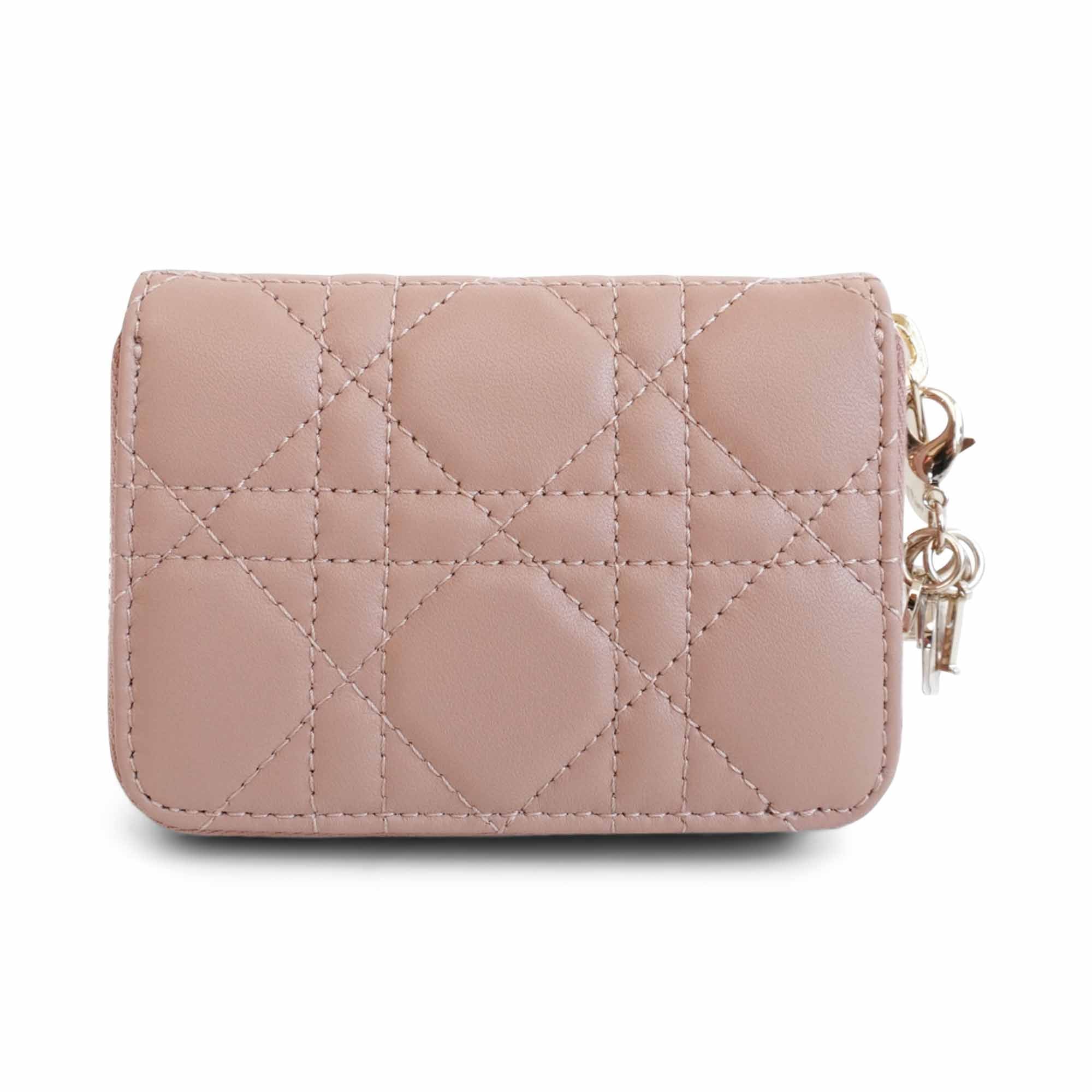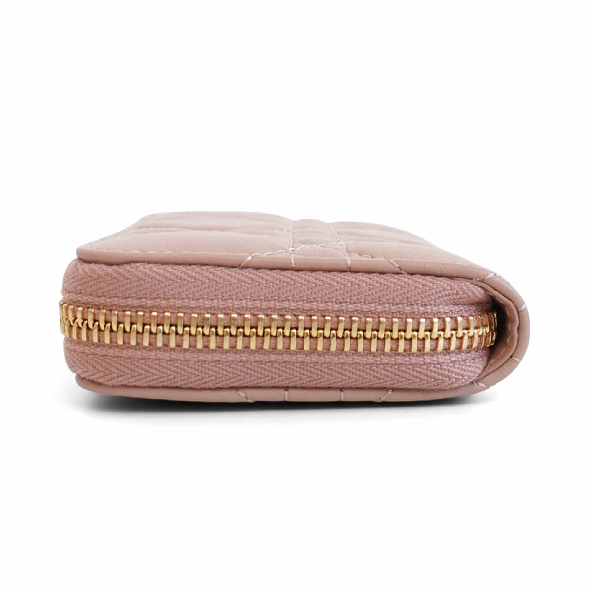 Christian Dior 'Voyageur' compact zip wallet in blush pink cannage quilted leather with gold hardware and removable logo charm. The interior is lined with leather and features 4 card slots and a zip pocket for coins.