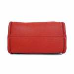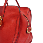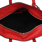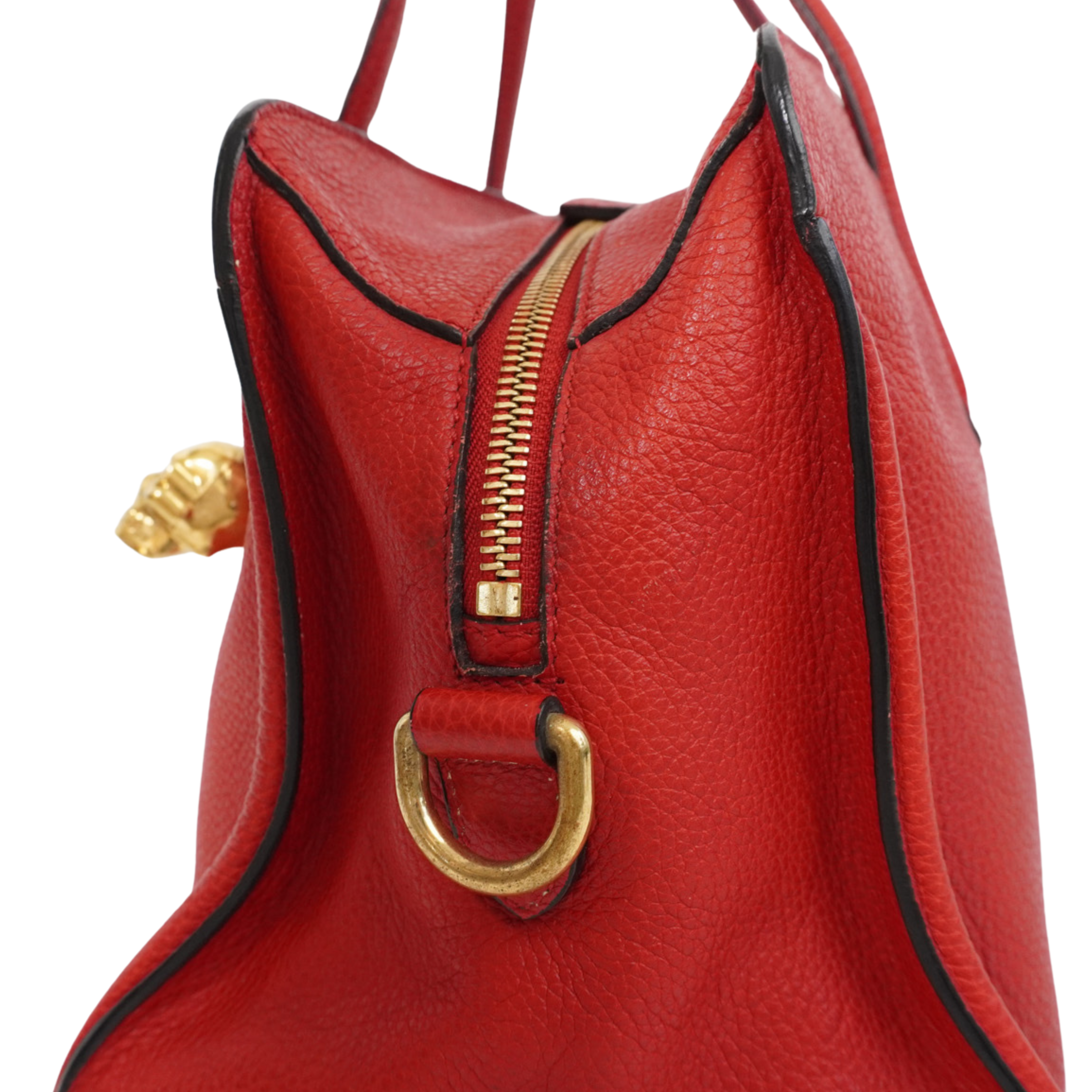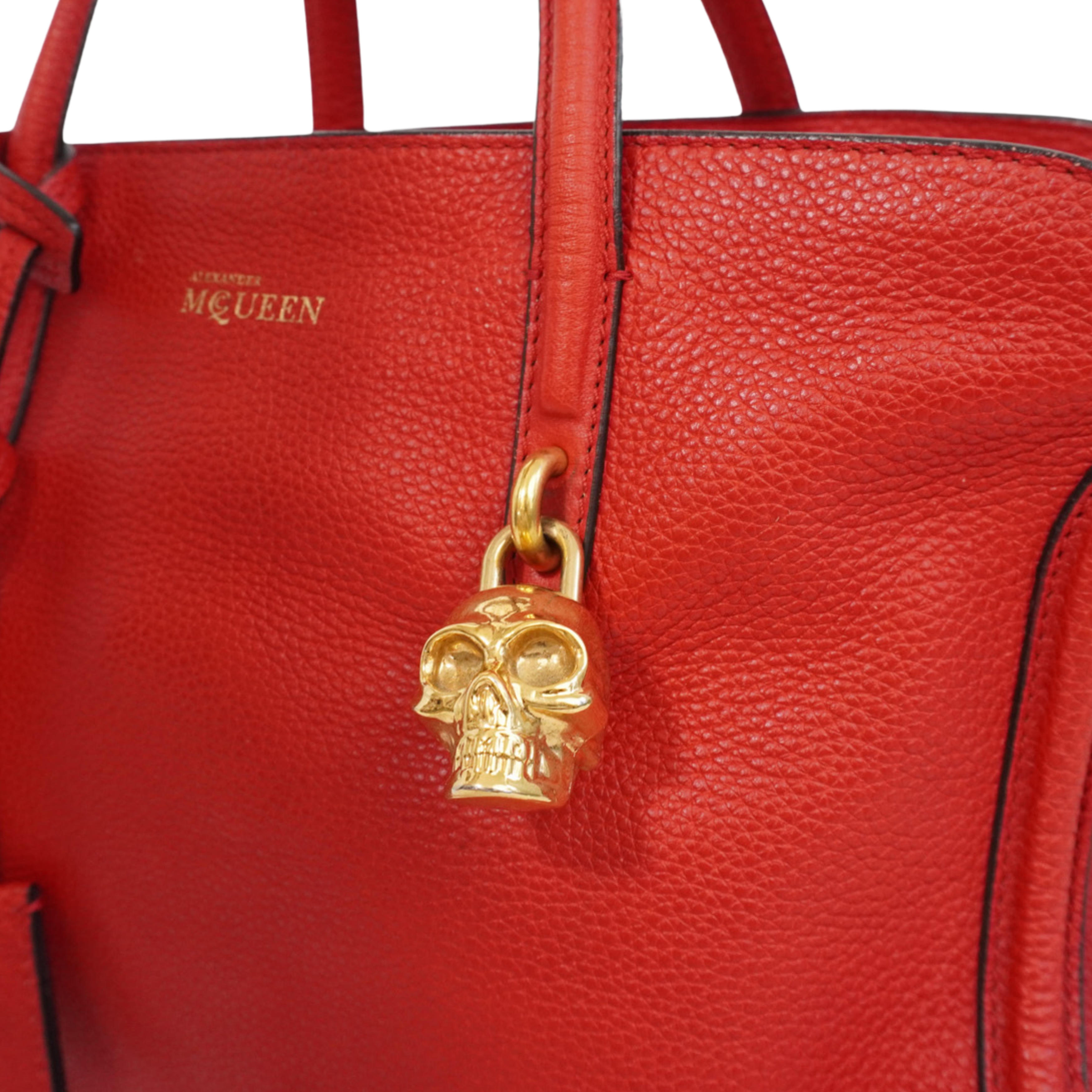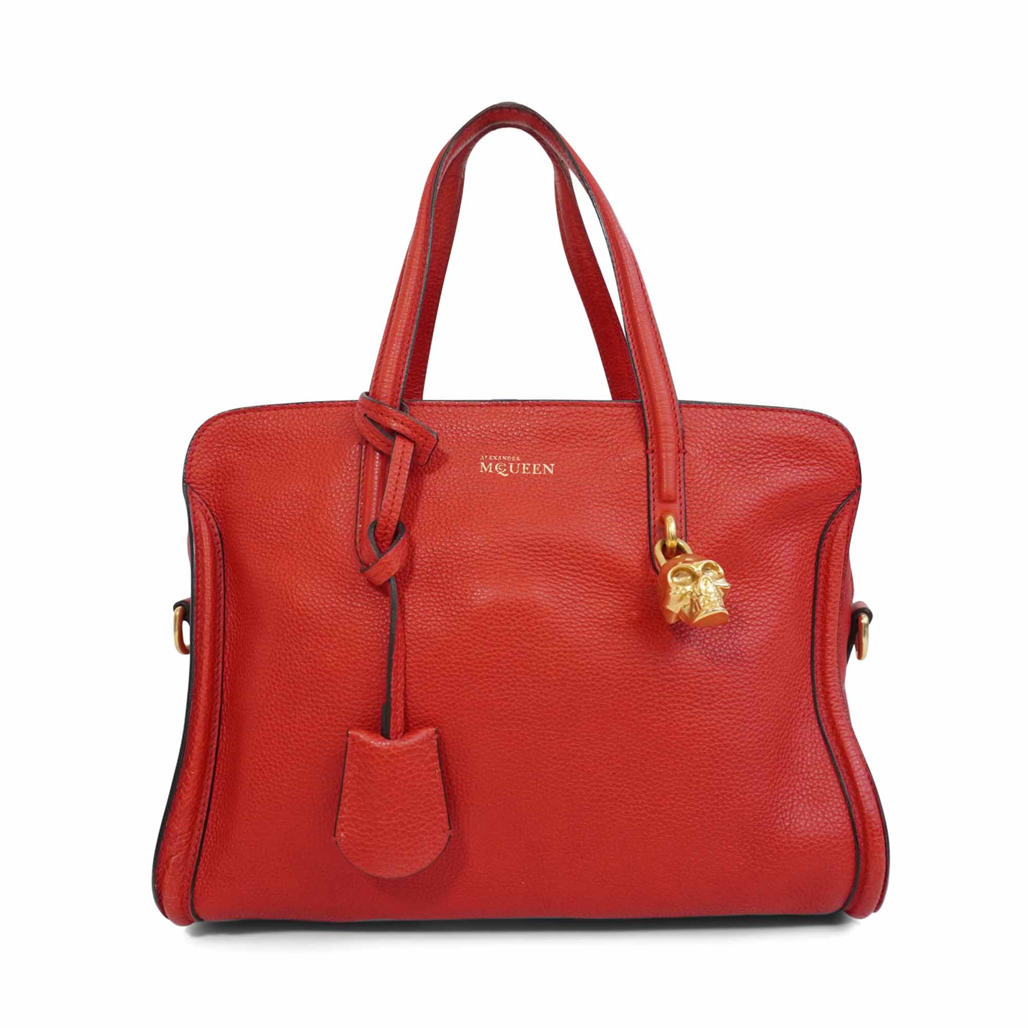 Alexander McQueen 'Skull Padlock' handbag in red pebbled leather with black trim throughout, dual top handles, an adjustable crossbody strap, and a signature skull padlock with matching key clochette. The bag has a top zip opening in gold hardware revealing a black canvas interior with zip and slip pockets.