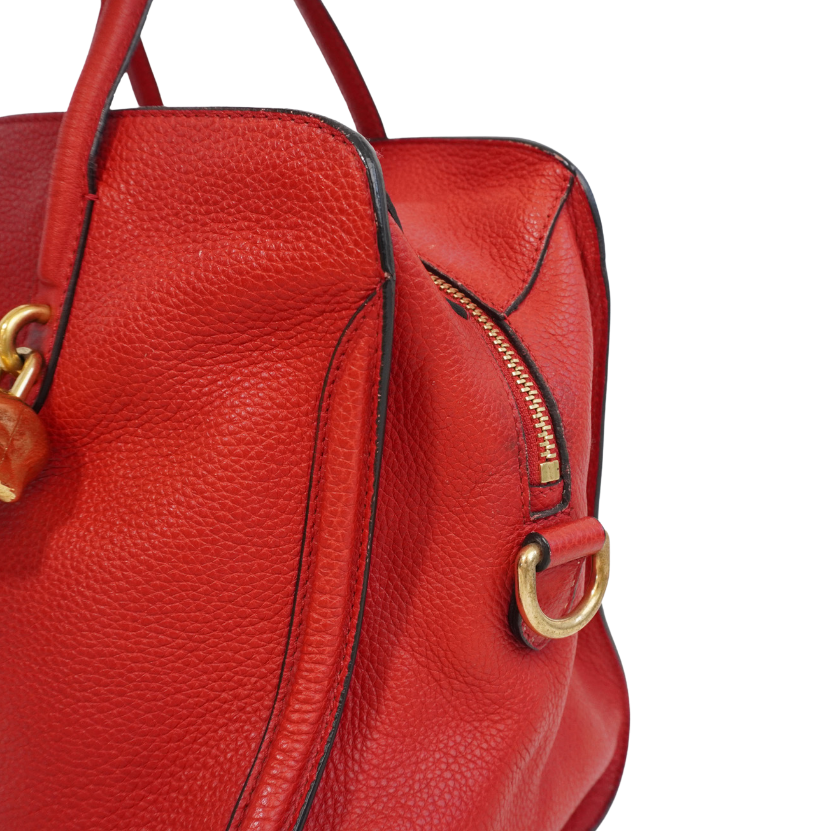 As is. Warping throughout leather especially at sides and trim, significant wear to handles, wear to black trim, light scuffing throughout exterior, hairline scratching and light tarnishing in metal hardware.