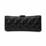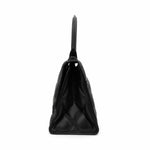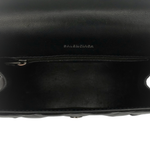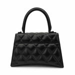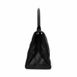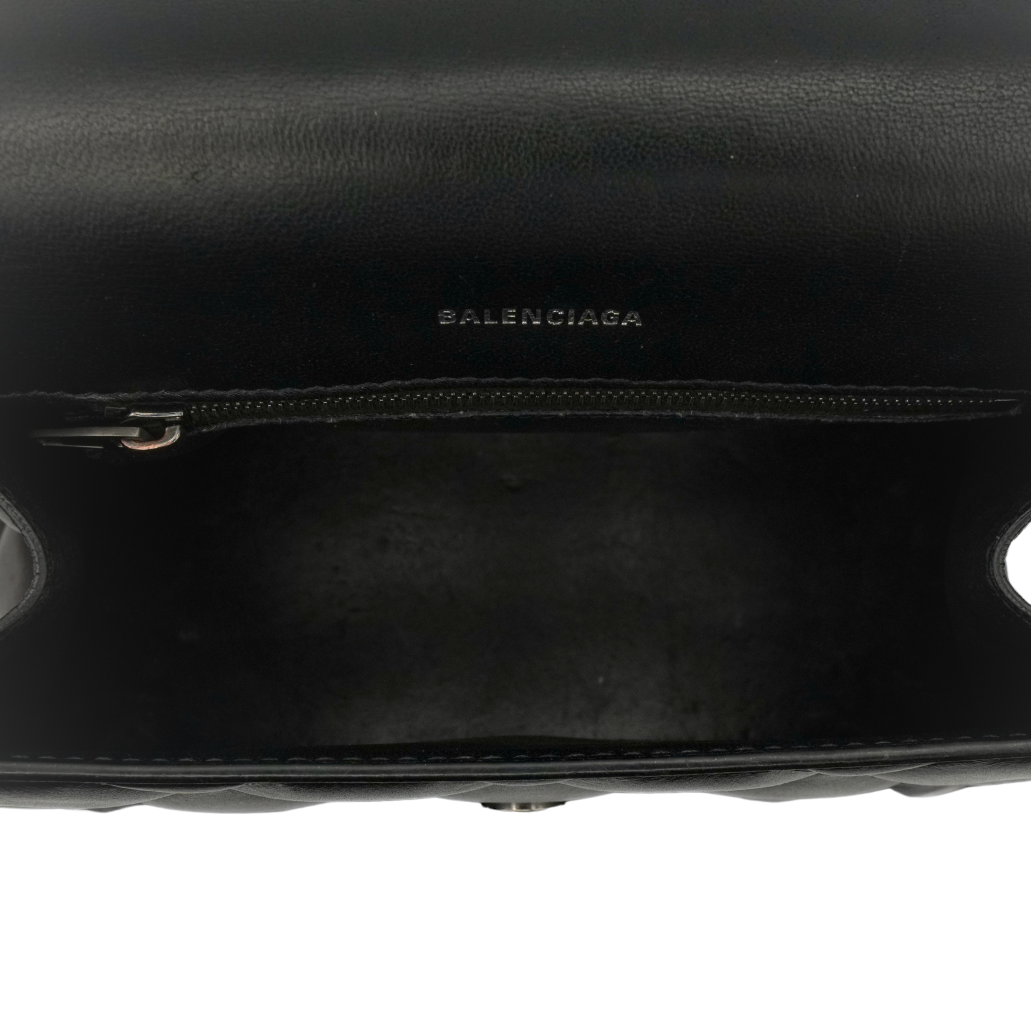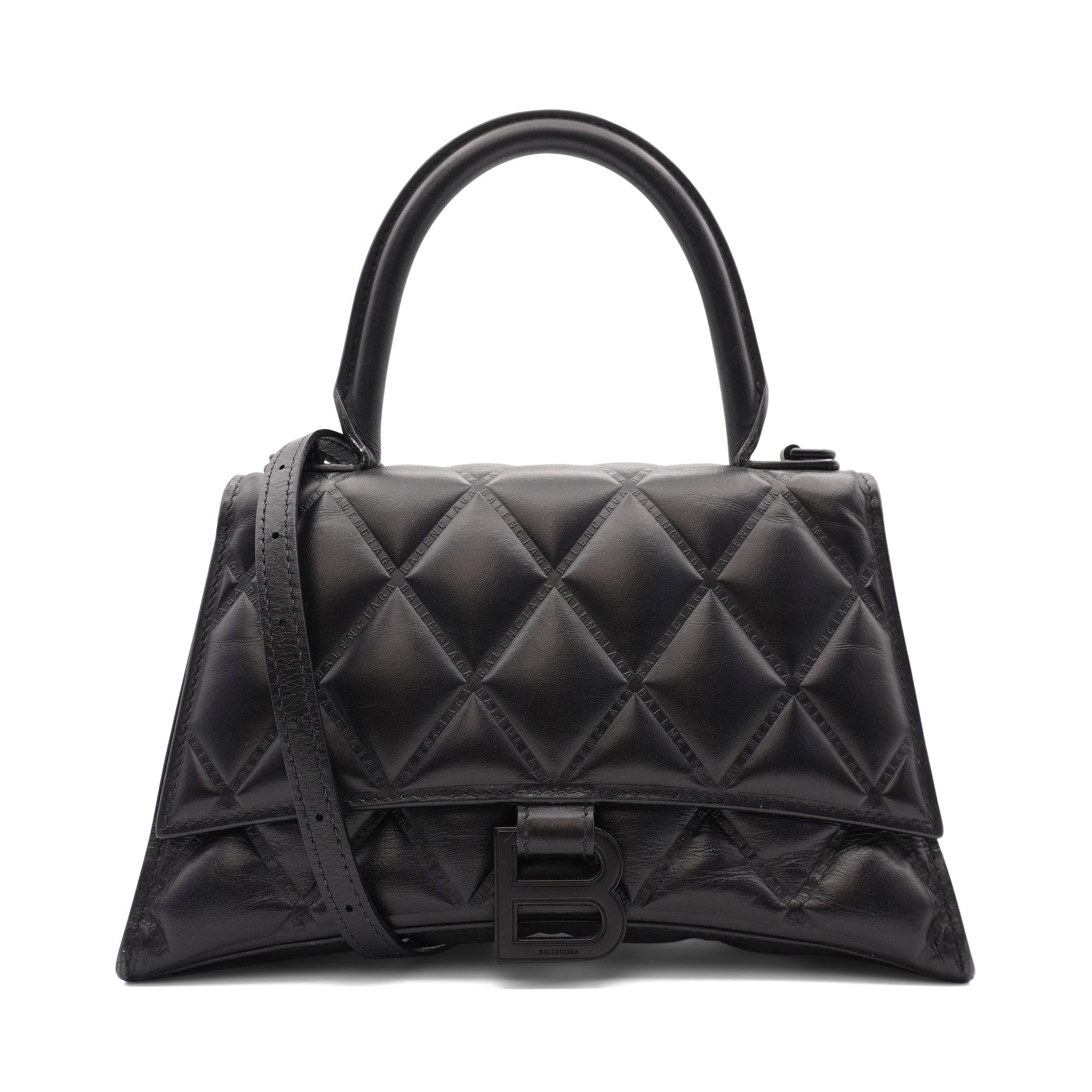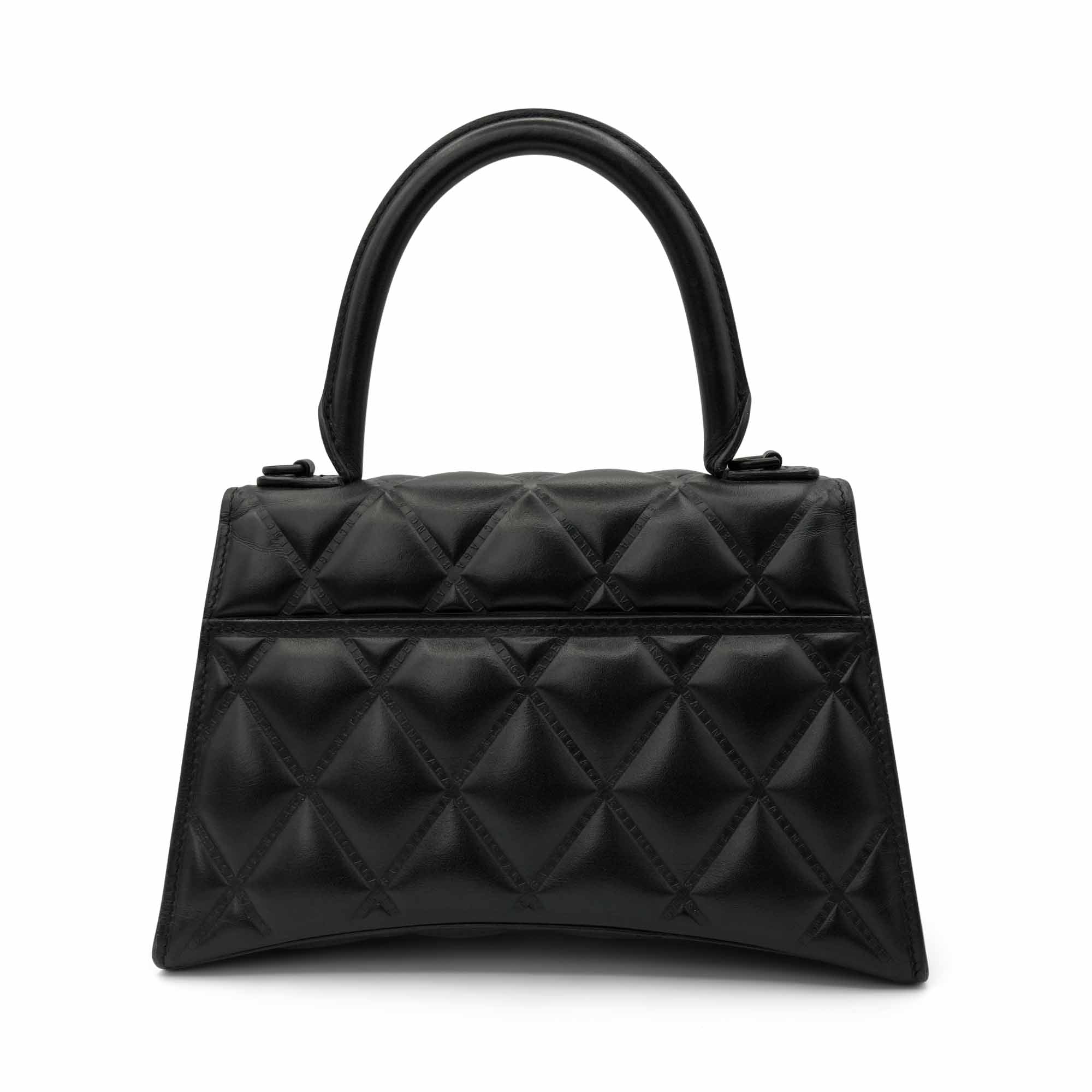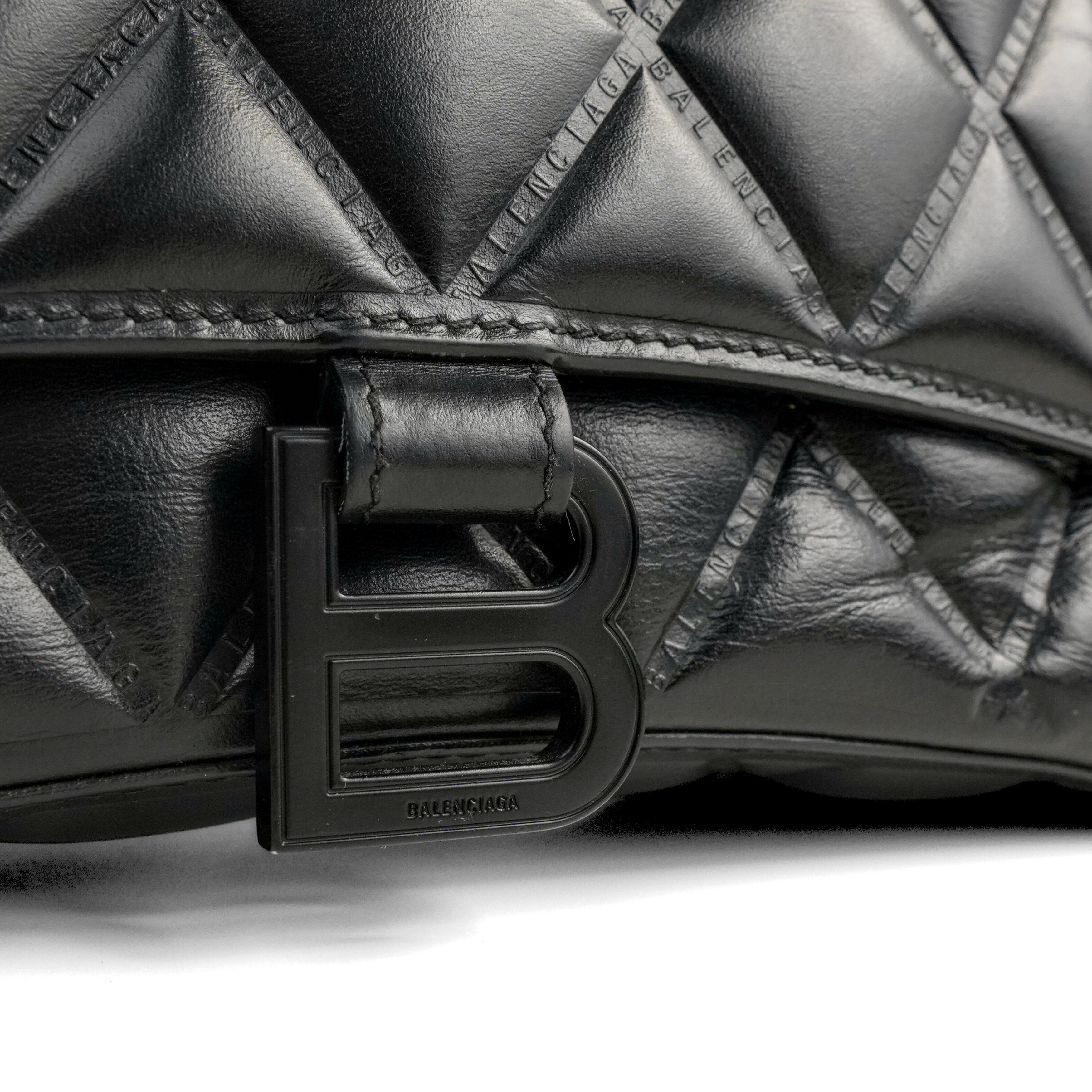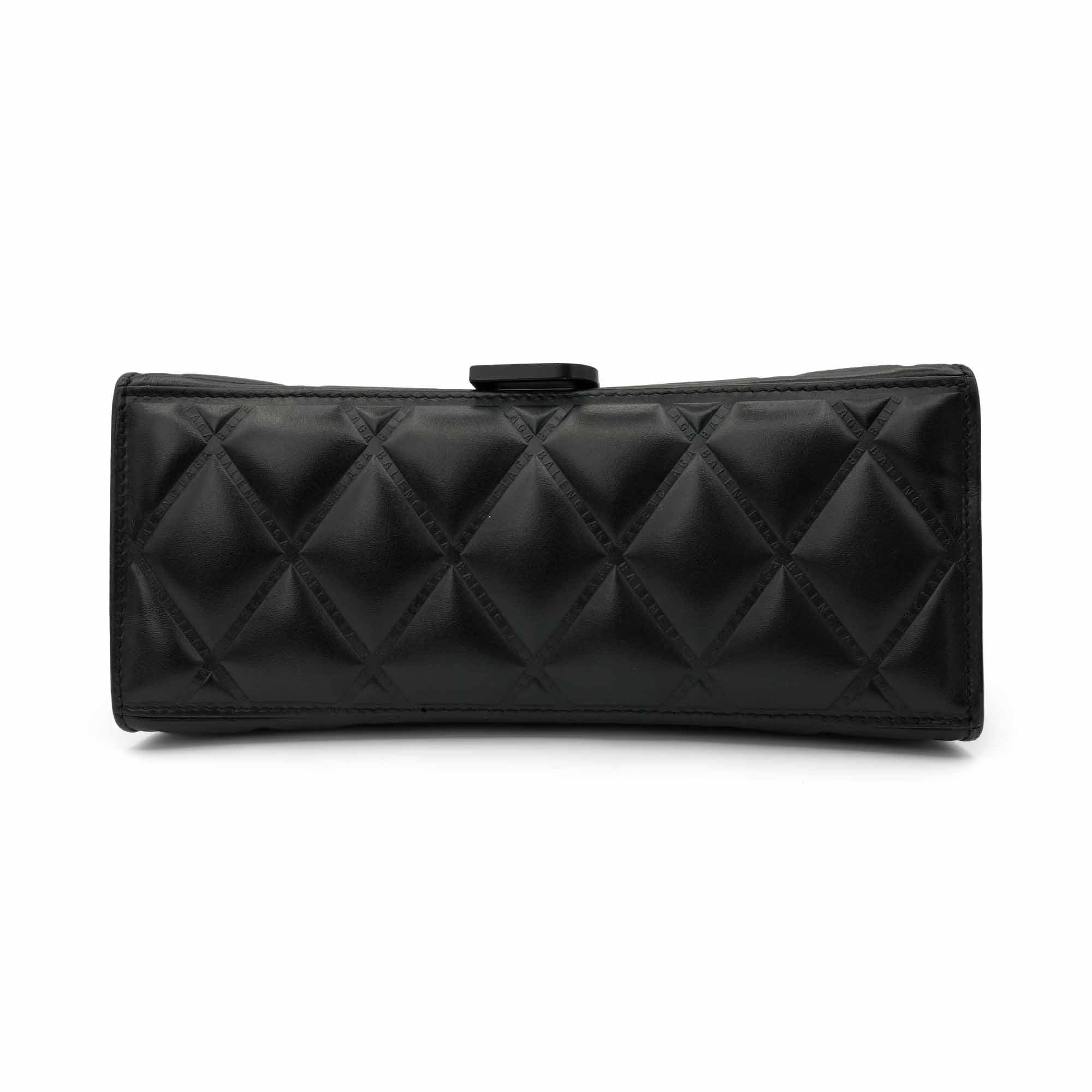 Balenciaga 'Medium Hourglass' handbag in black quilted leather with embossed logo monogram in the quilting, a tonal 'B' charm and magnetic button closure. Features a curved base, structured top handle, and removable crossbody strap. The interior is fully lined in black leather and has a single slip pocket.