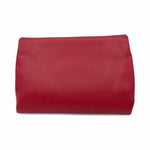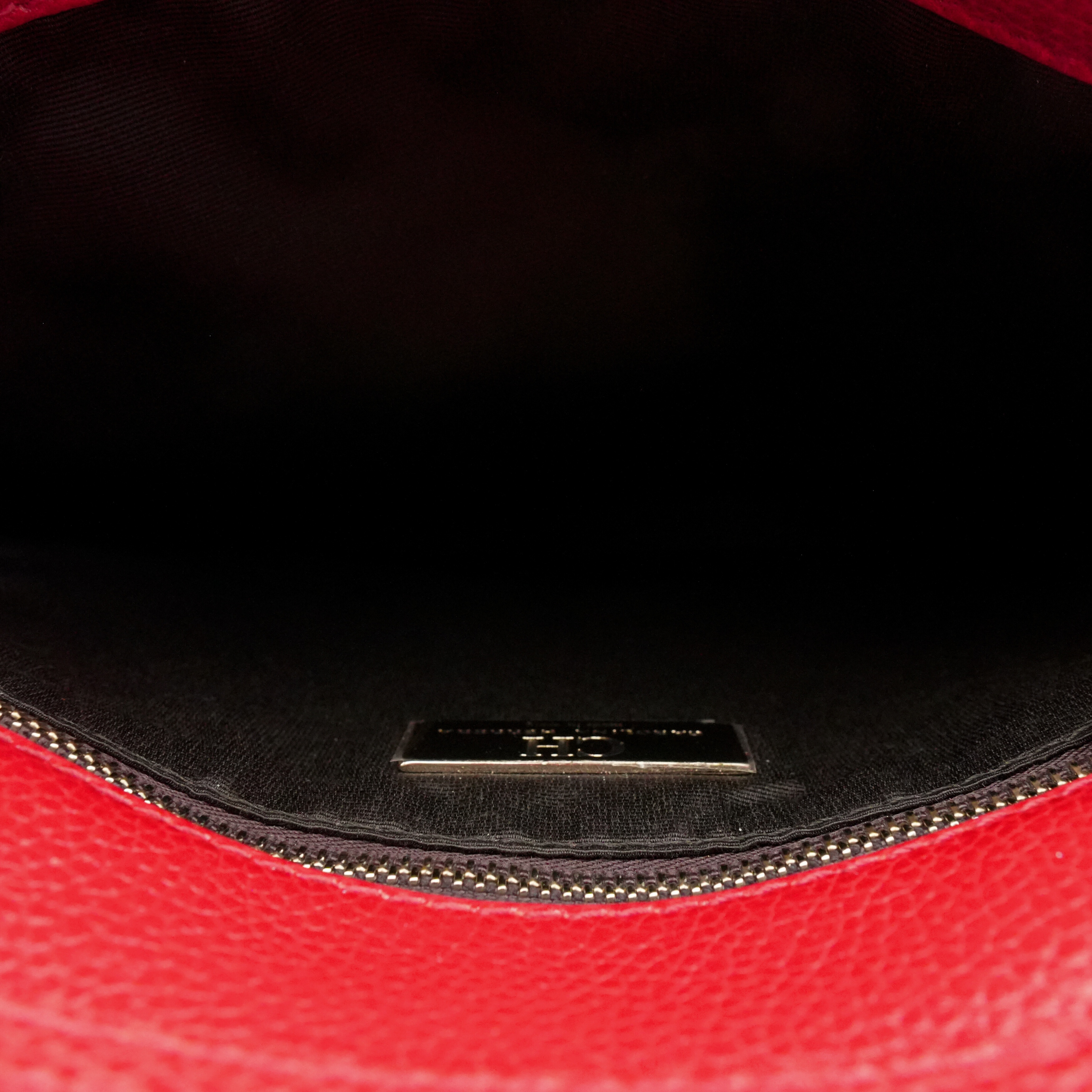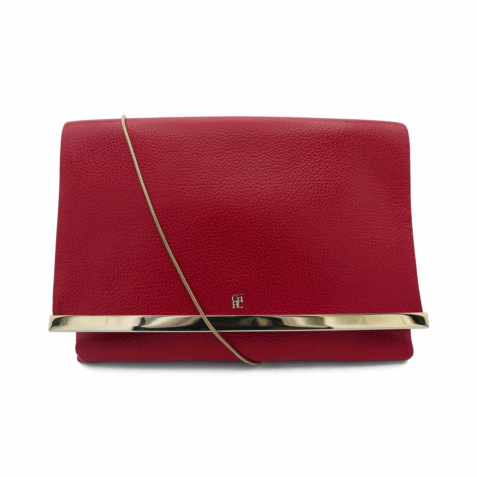 Carolina Herrera flap crossbody bag in red leather with thin snakeskin chain in gold hardware and gold bar trim with snap button closure. Interior features black canvas lining and slip pocket.