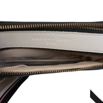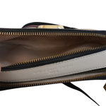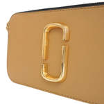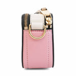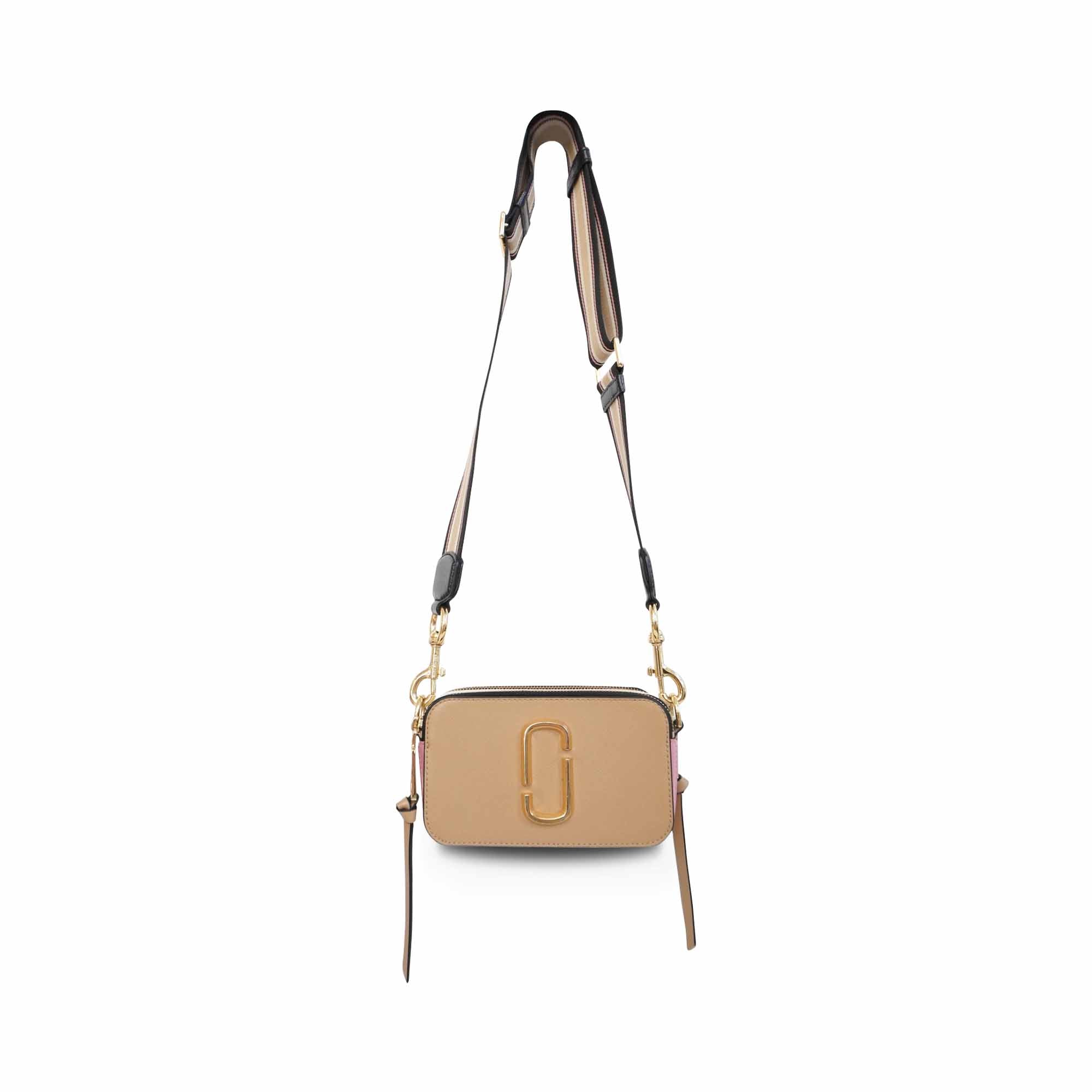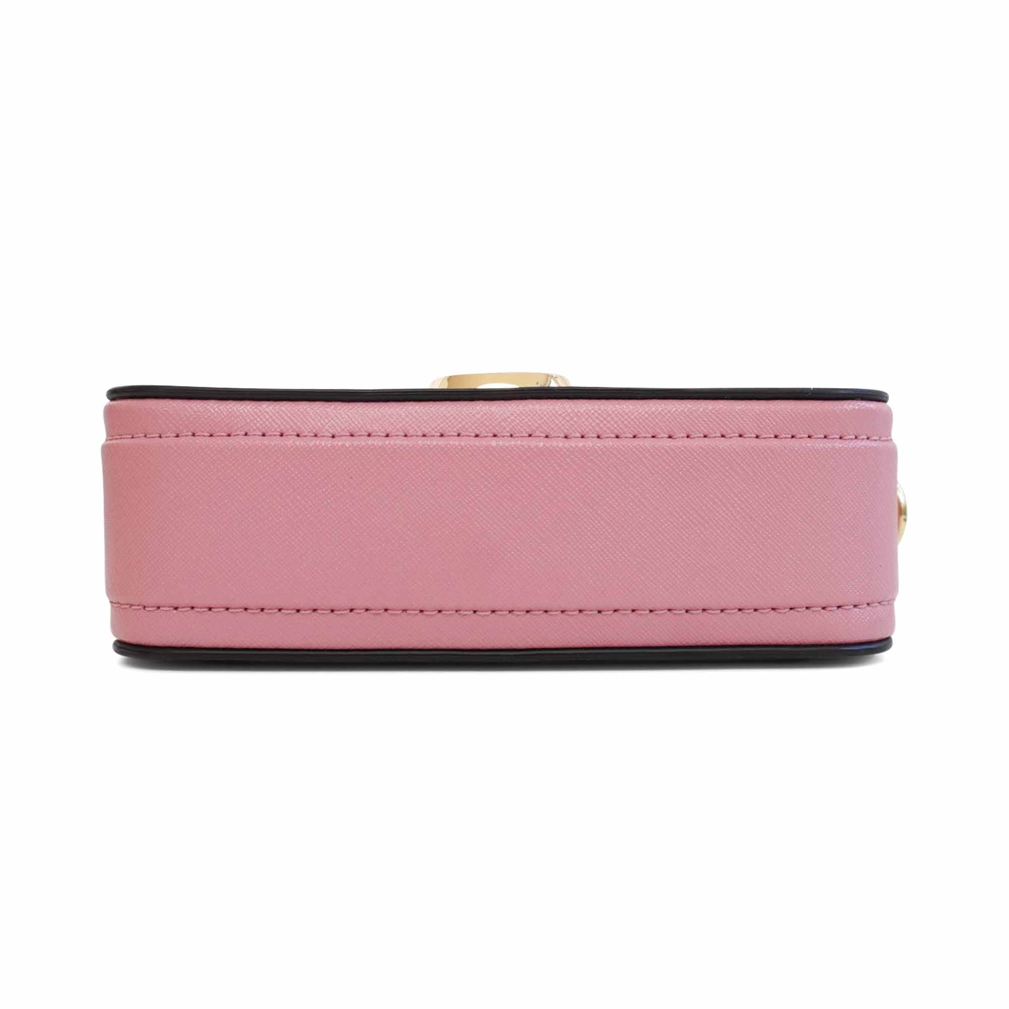 Marc Jacobs 'The Snapshot' camera bag in beige, pink, and white patent saffiano leather with gold hardware and a removable striped crossbody strap. Features two zip pockets with canvas lining and a slip pocket on the back.