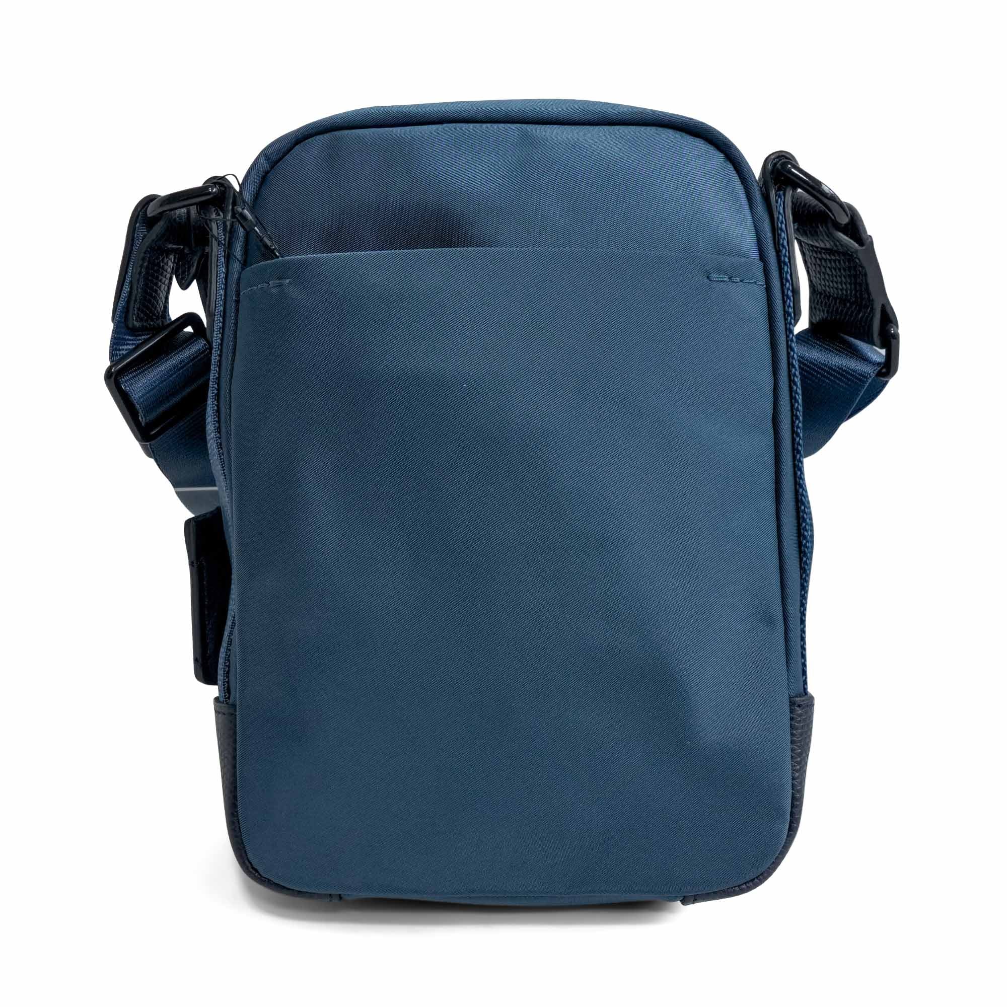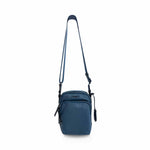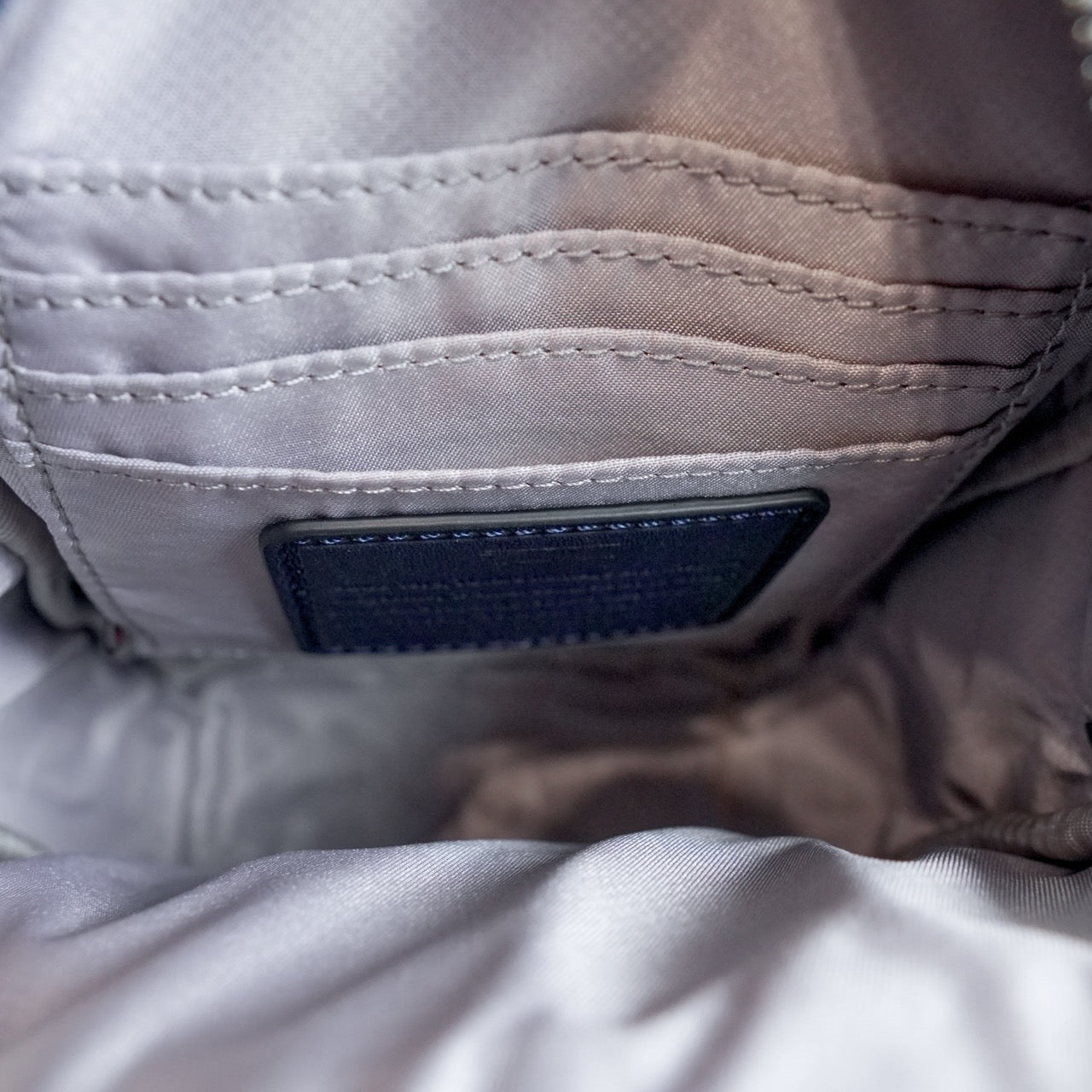 Tumi 'Ruma' crossbody bag in steel blue nylon with navy leather trim, an adjustable canvas crossbody strap, a front zip pocket, and a main zip compartment with black hardware and a beige interior lining with several card pockets.