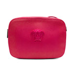 Versace 'Palazzo Medusa' crossbody camera bag in fuschia pink leather with tonal acetate 'Medusa' head emblem and gold hardware. Features adjustable crossbody strap, zipper closure, and an inner slip pocket.