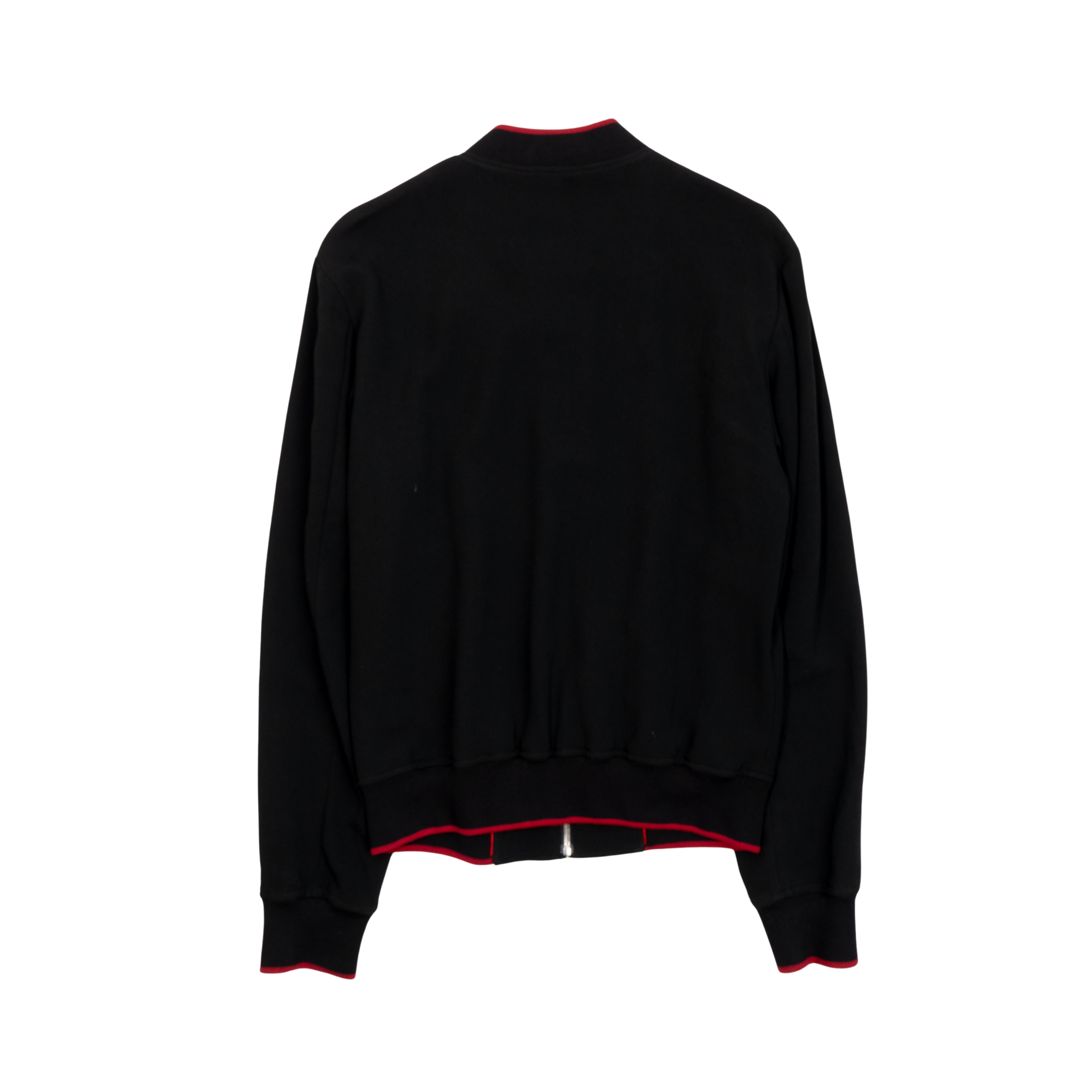 Dolce & Gabbana black bomber jacket with two side zip pockets, ribbed collar, cuffs and hem with red trim. Featuring red logo plaque on the chest and black and white polka dot mesh lining.