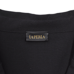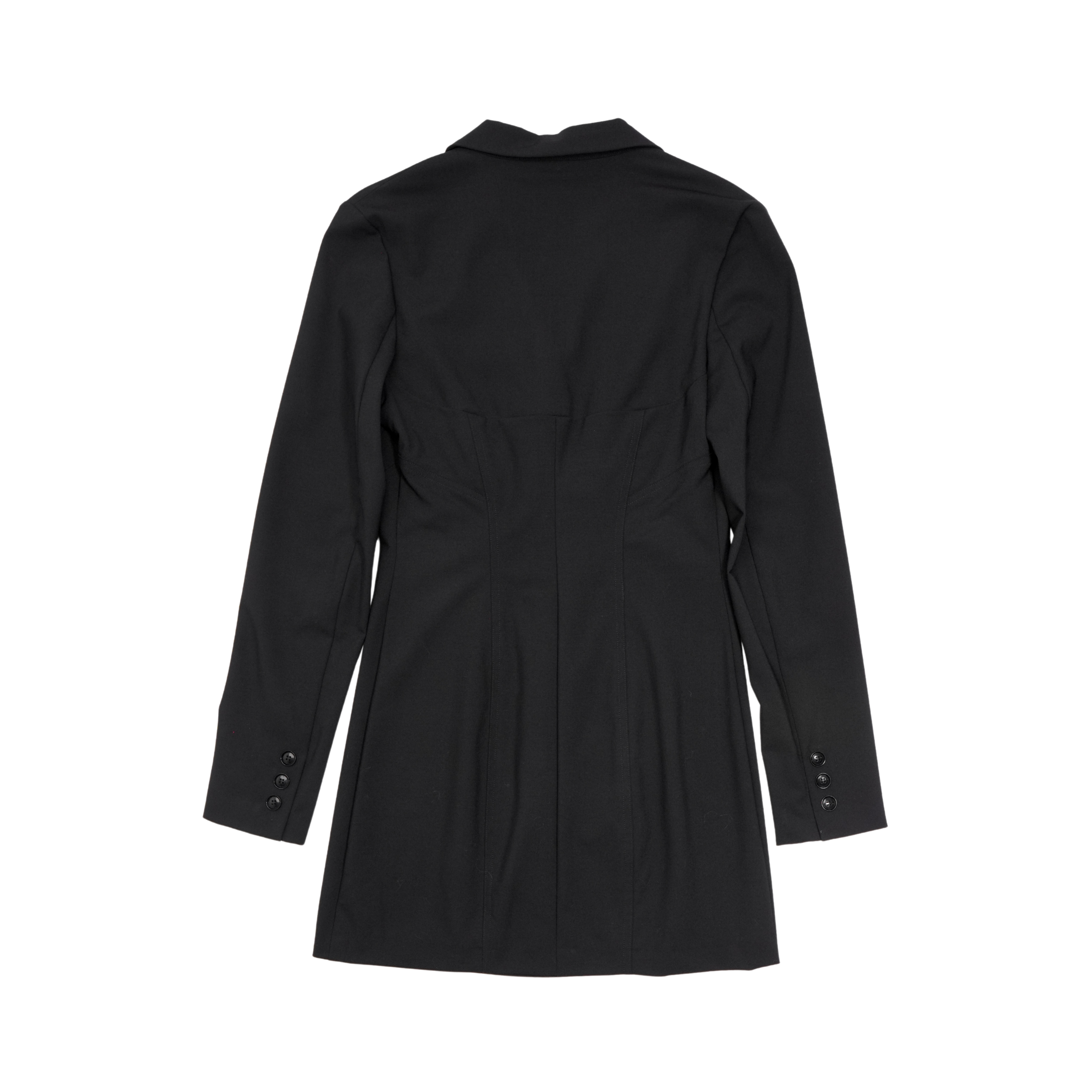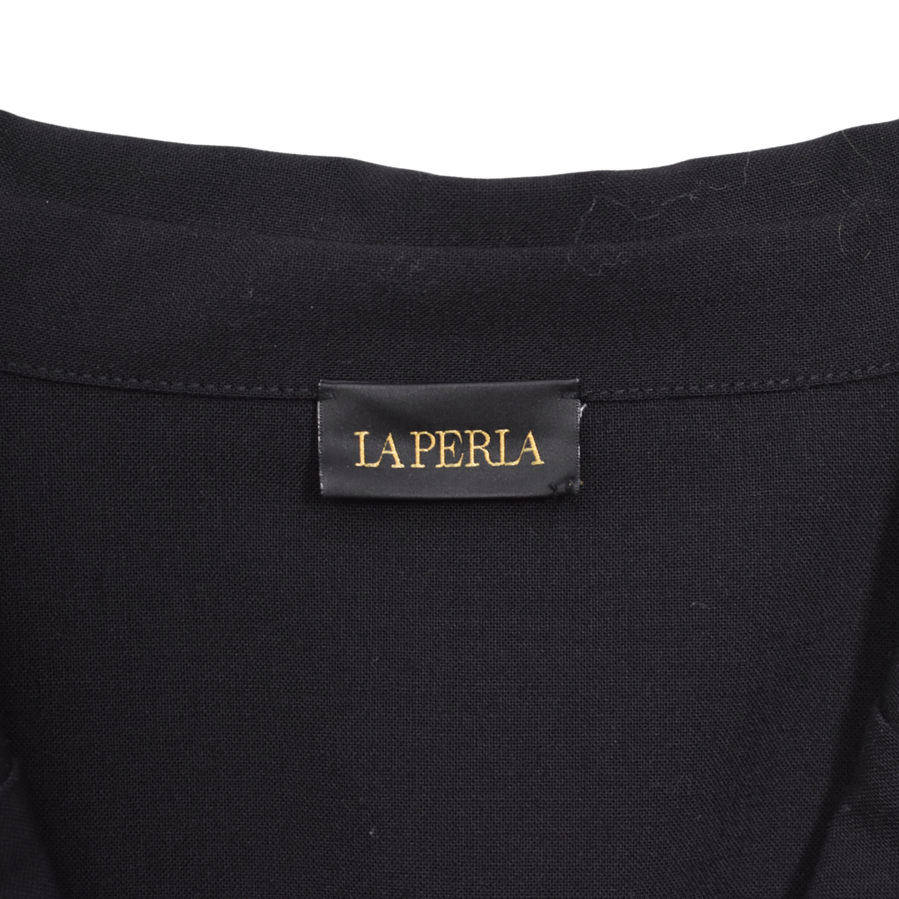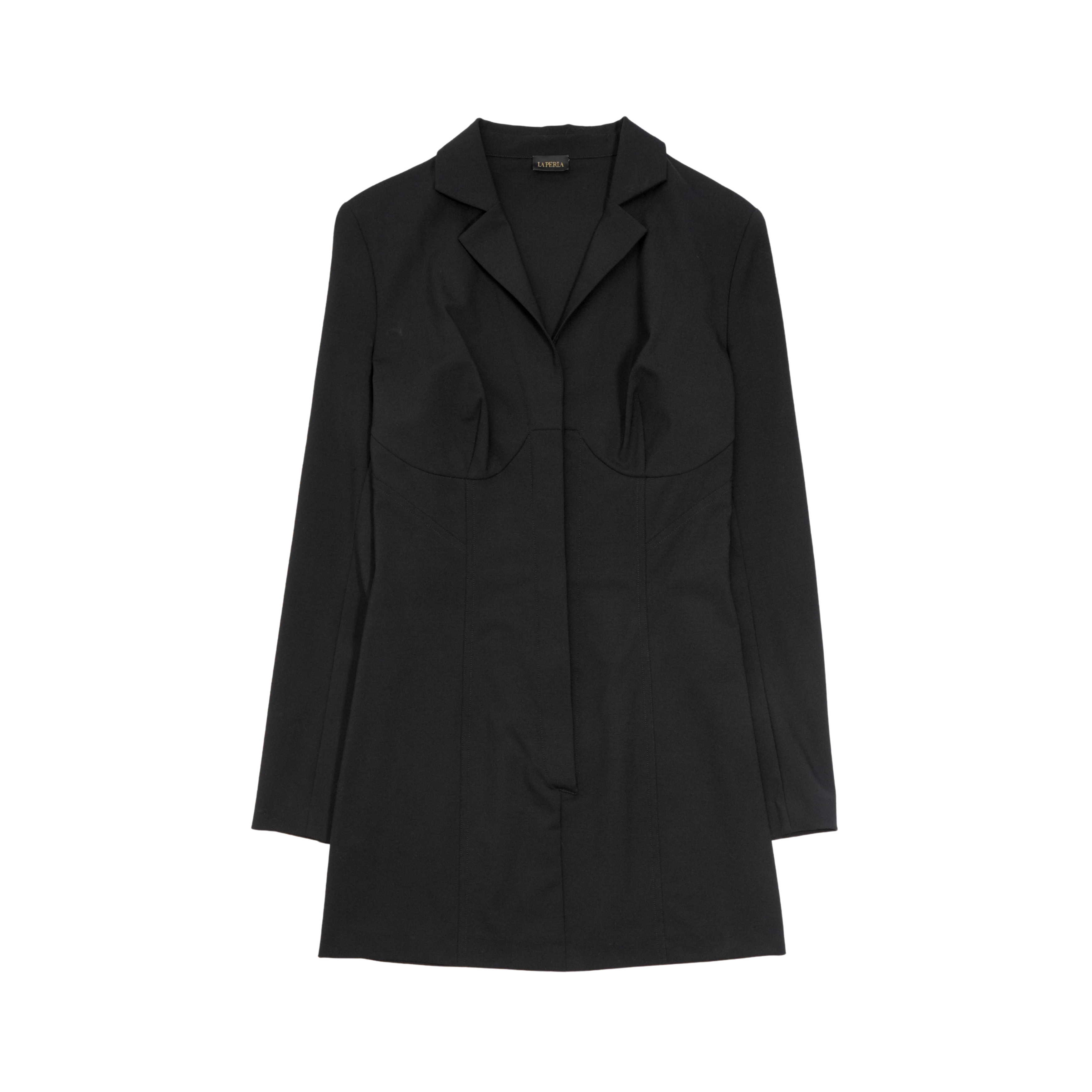 La Perla mini blazer dress in black with a hidden front button closure, a notch lapel collar, and a v-neckline.