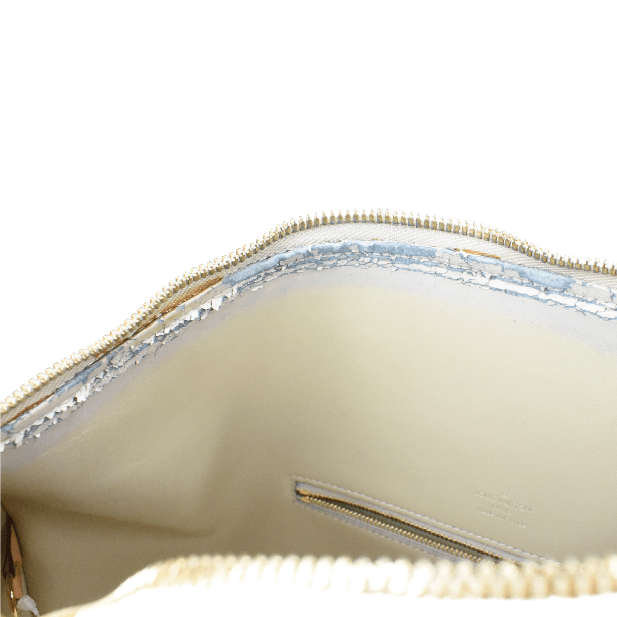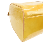 Fair. Water marks throughout vernis leather, stains on leather trim and handles, dirt and discolouration at base of bag espeically at corners, markings on inner lining, wear to inner trim.