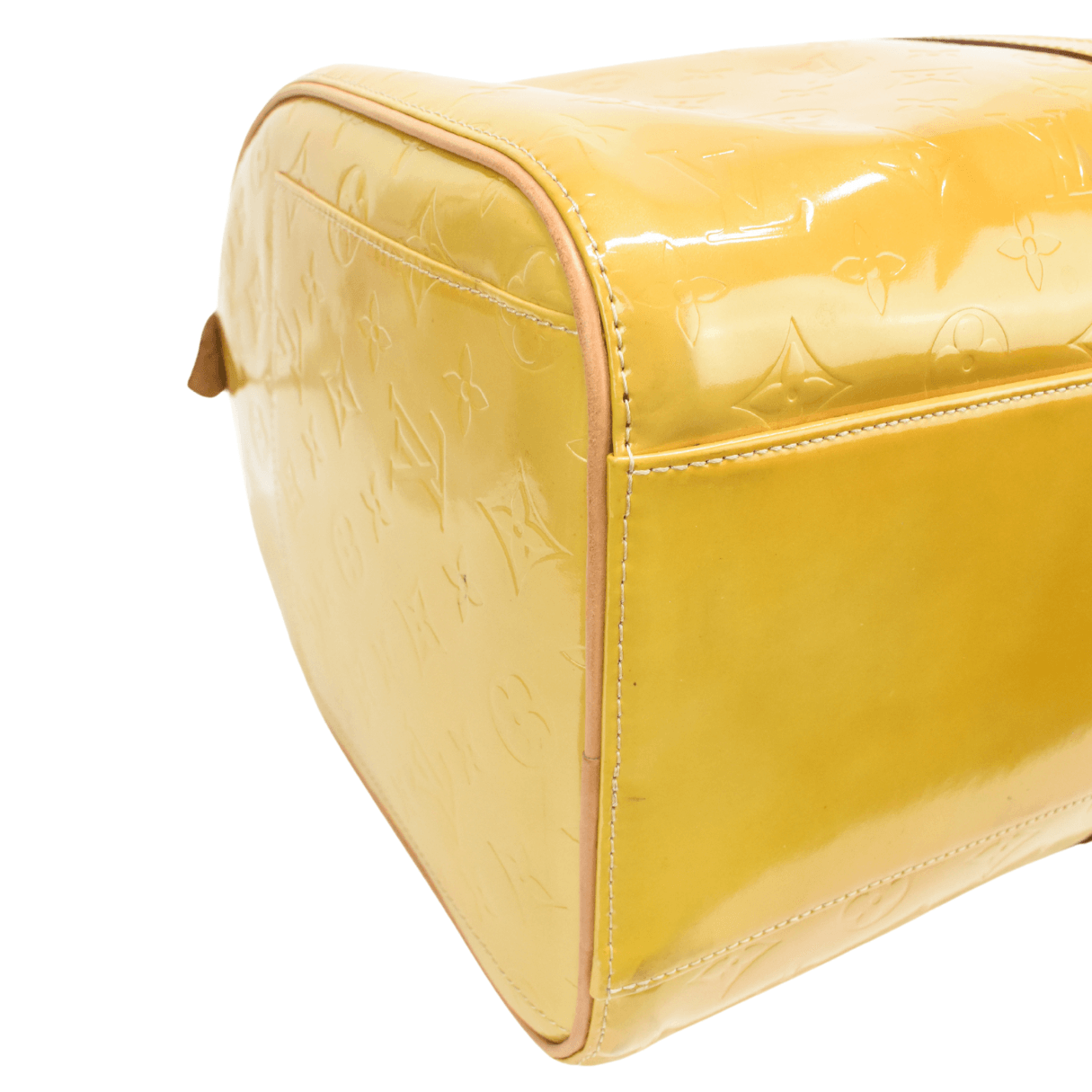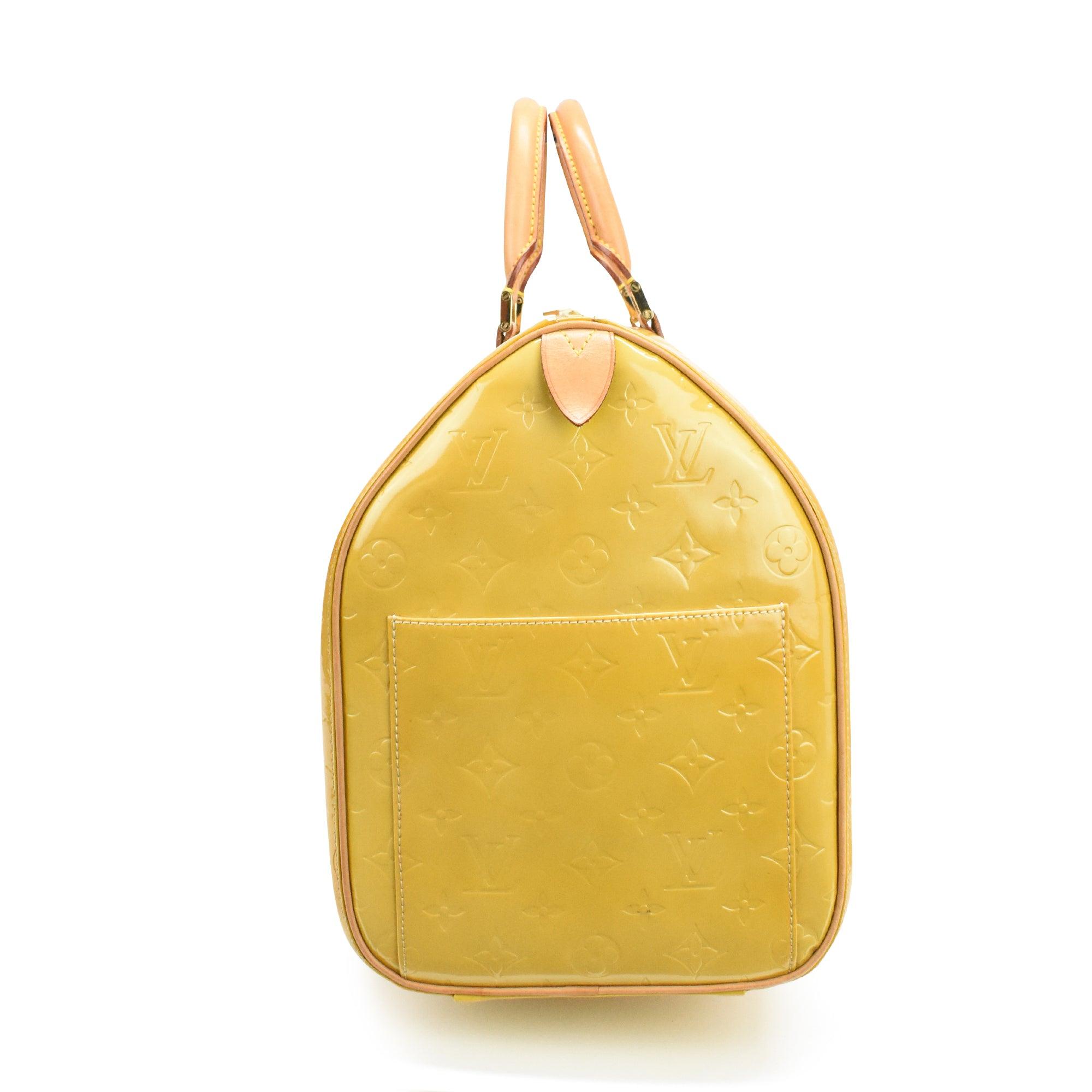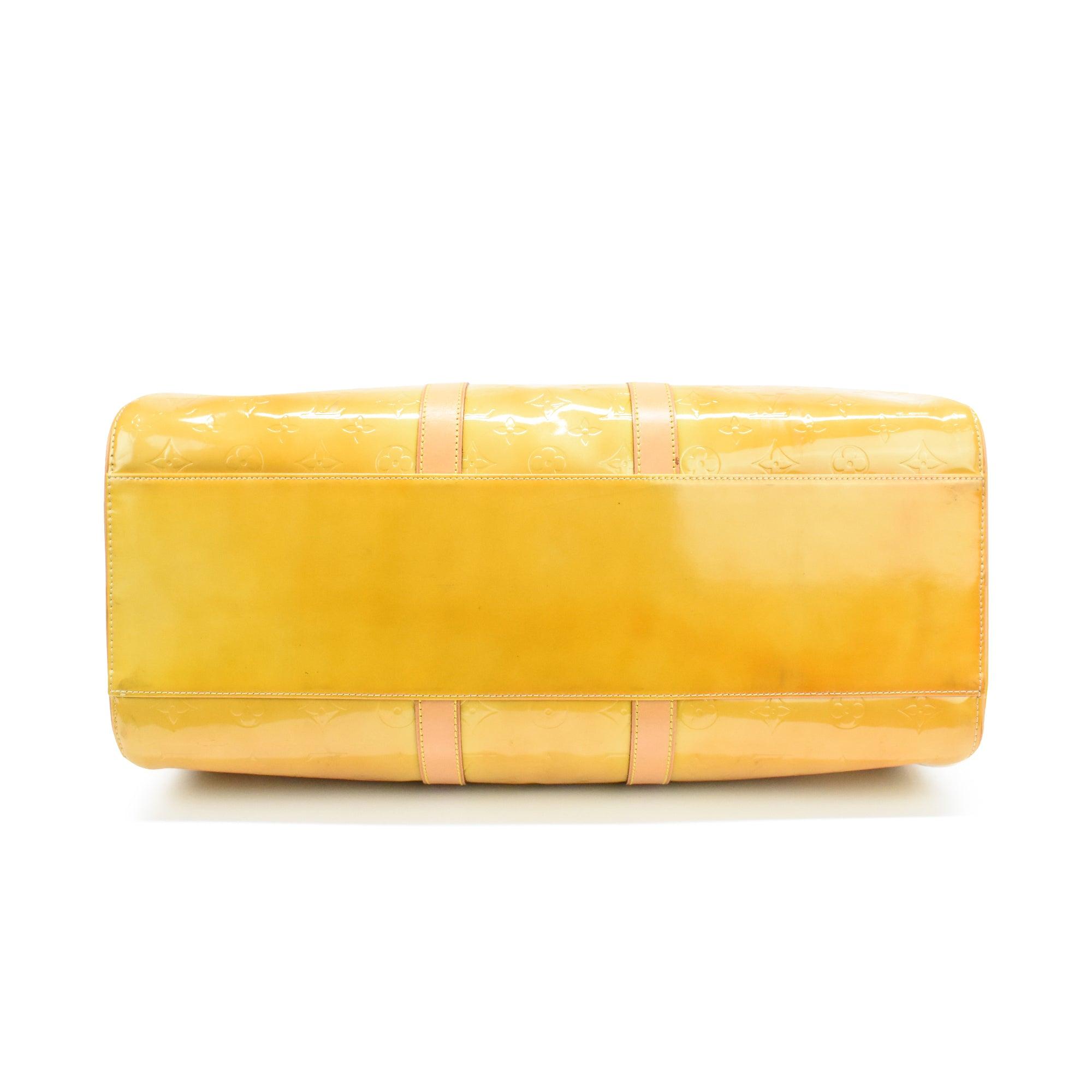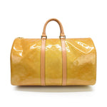 Louis Vuitton 'Mercer Keepall 50' in gold vernis patent leather with an all-over embossed monogram print, brown leather rolled handles, and a top-zip opening in gold hardware.