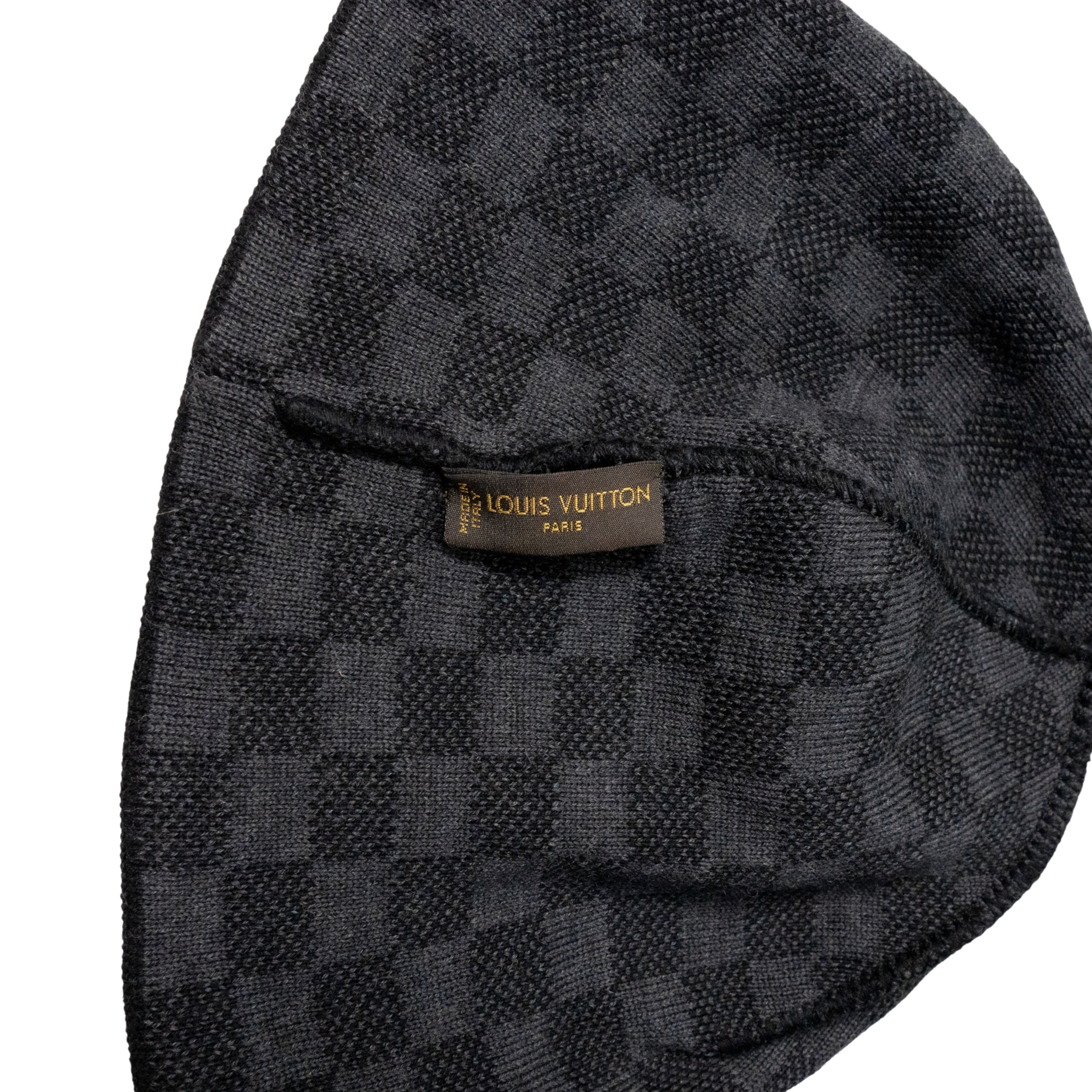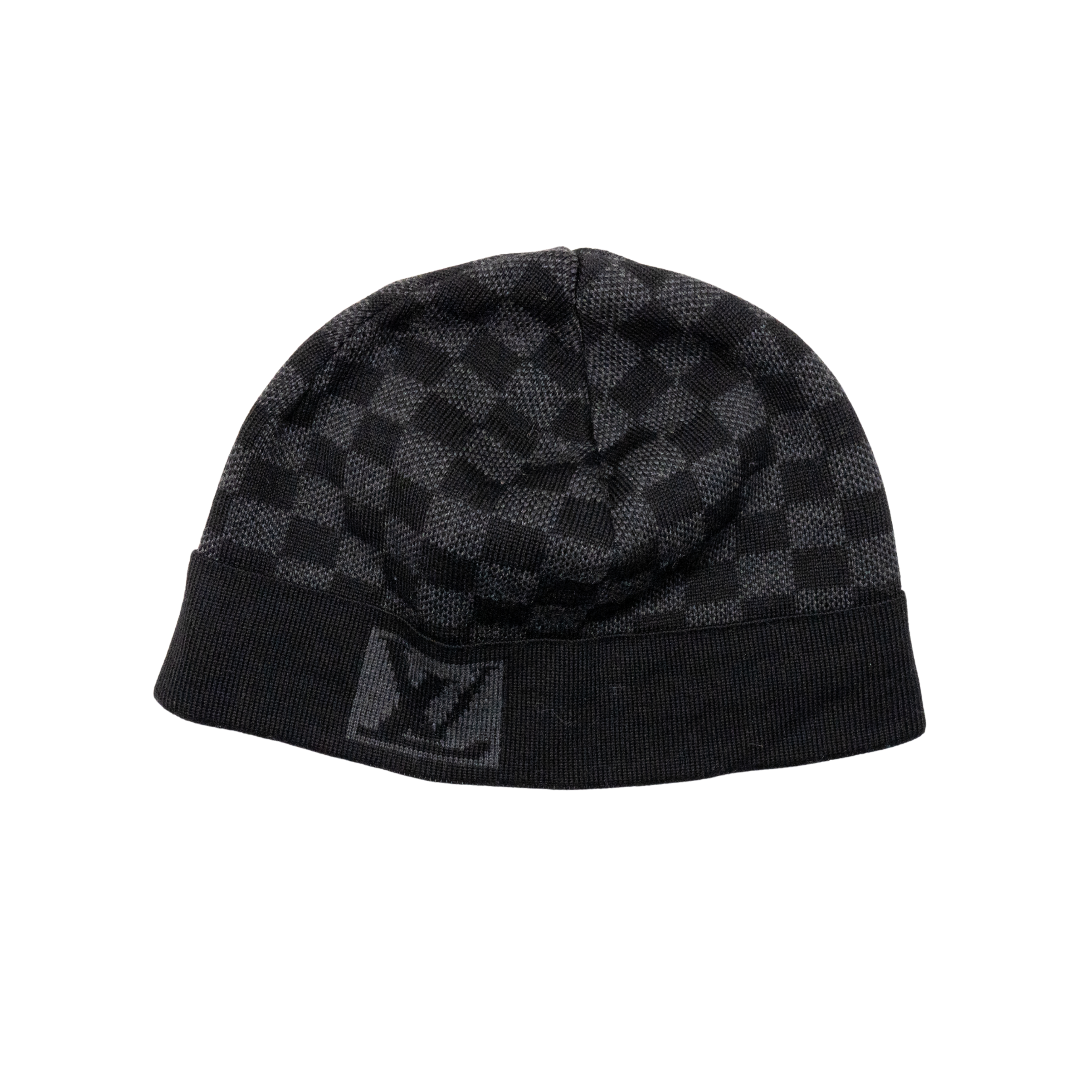 Louis Vuitton rolled beanie in black and grey 'damier' checkered print with a logo on the rolled panel.