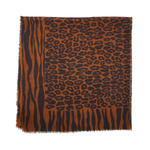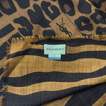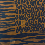 Yves Saint Laurent square scarf in brown wool with an all-over leopard and tiger print, a logo graphic, and short fringe around the edges.