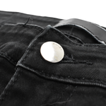 Amiri moto style skinny jeans in black denim. Features ribbed leather patches on thighs and silver zipper details on knees and down sides.