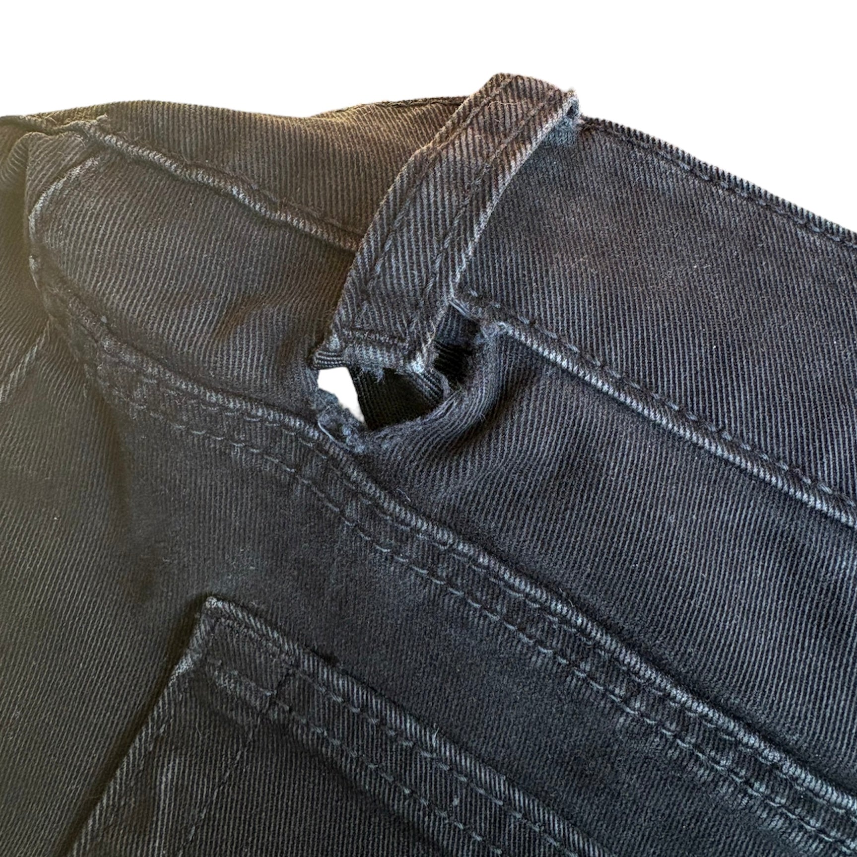 As is. Stains all over front of thighs, torn at back belt loop.