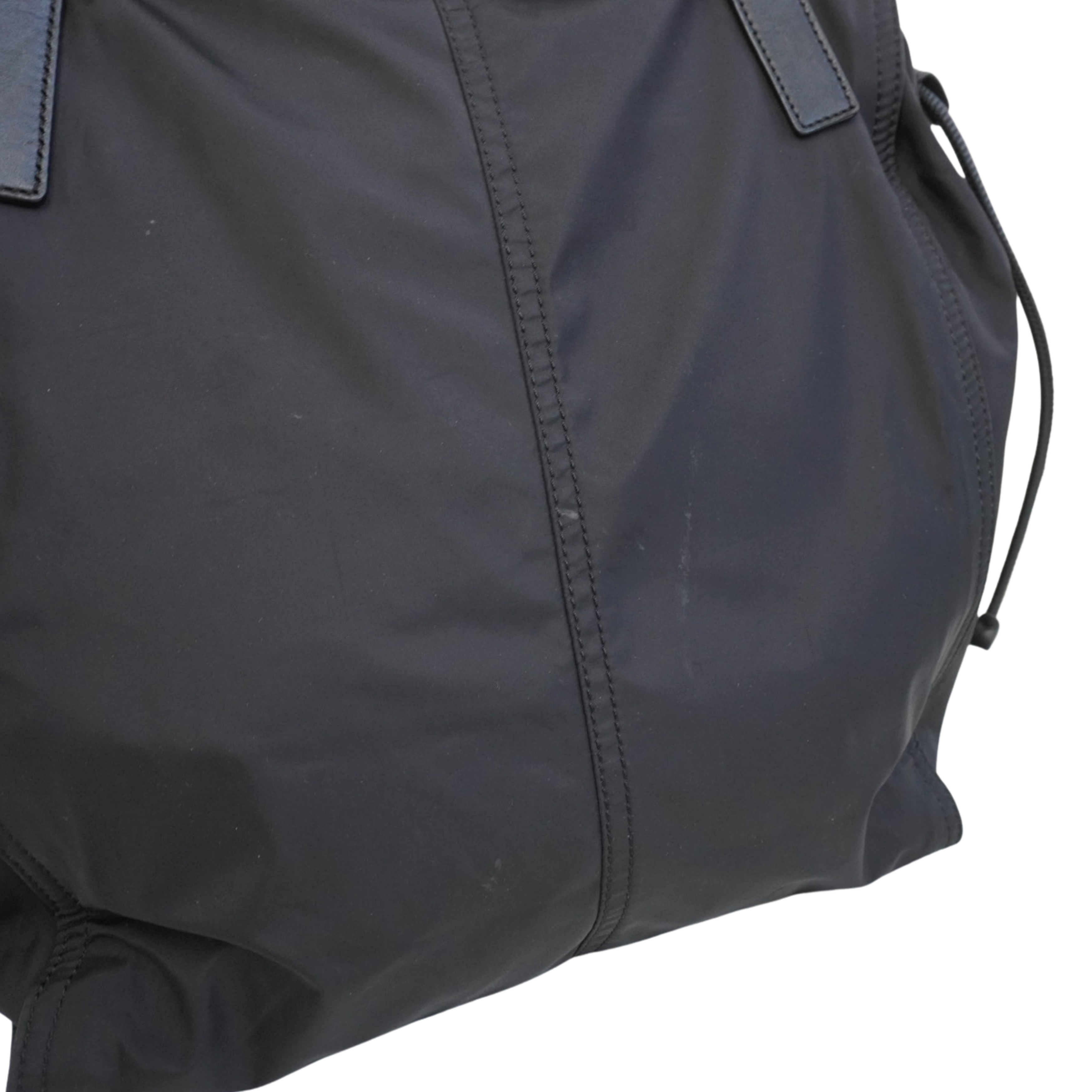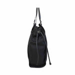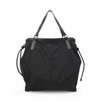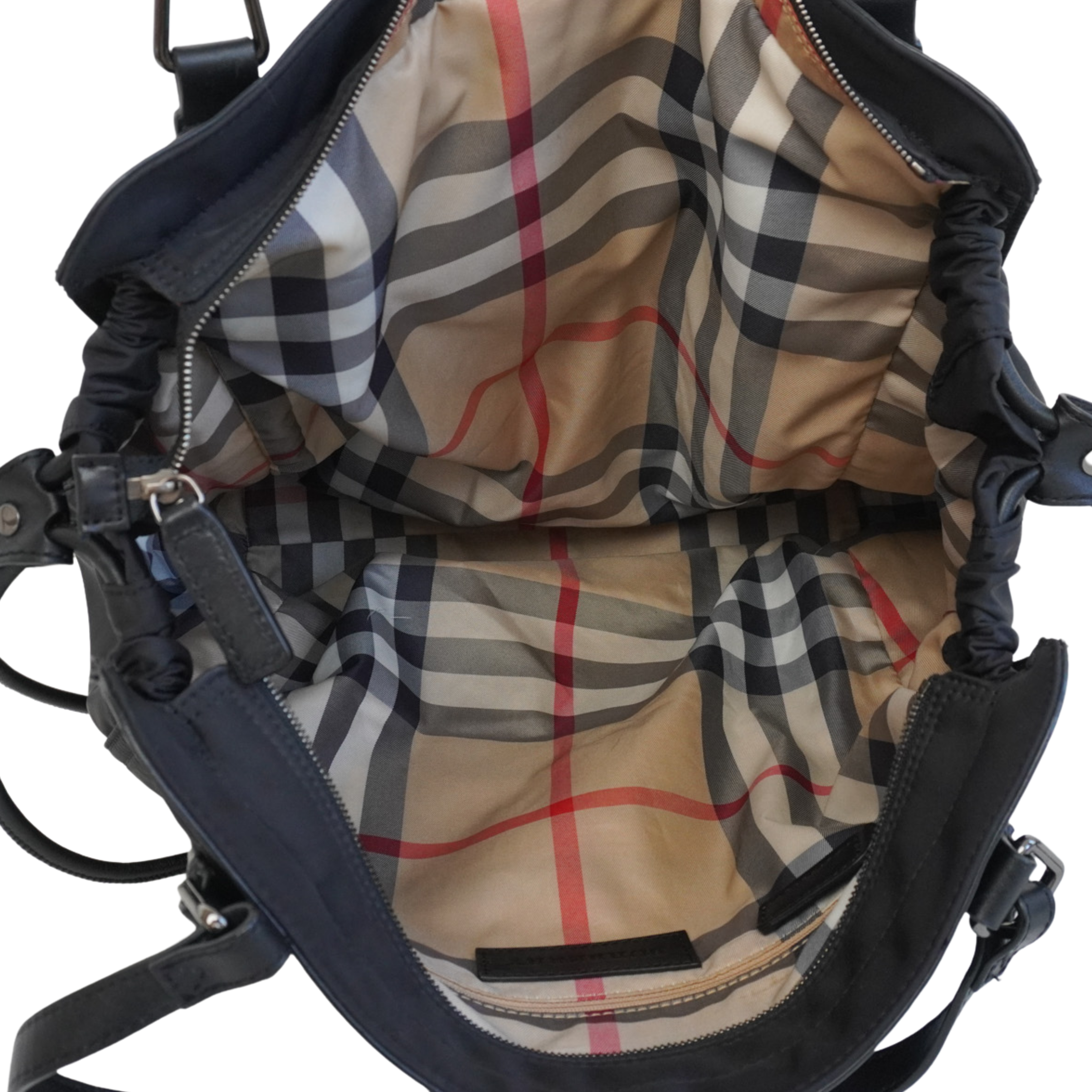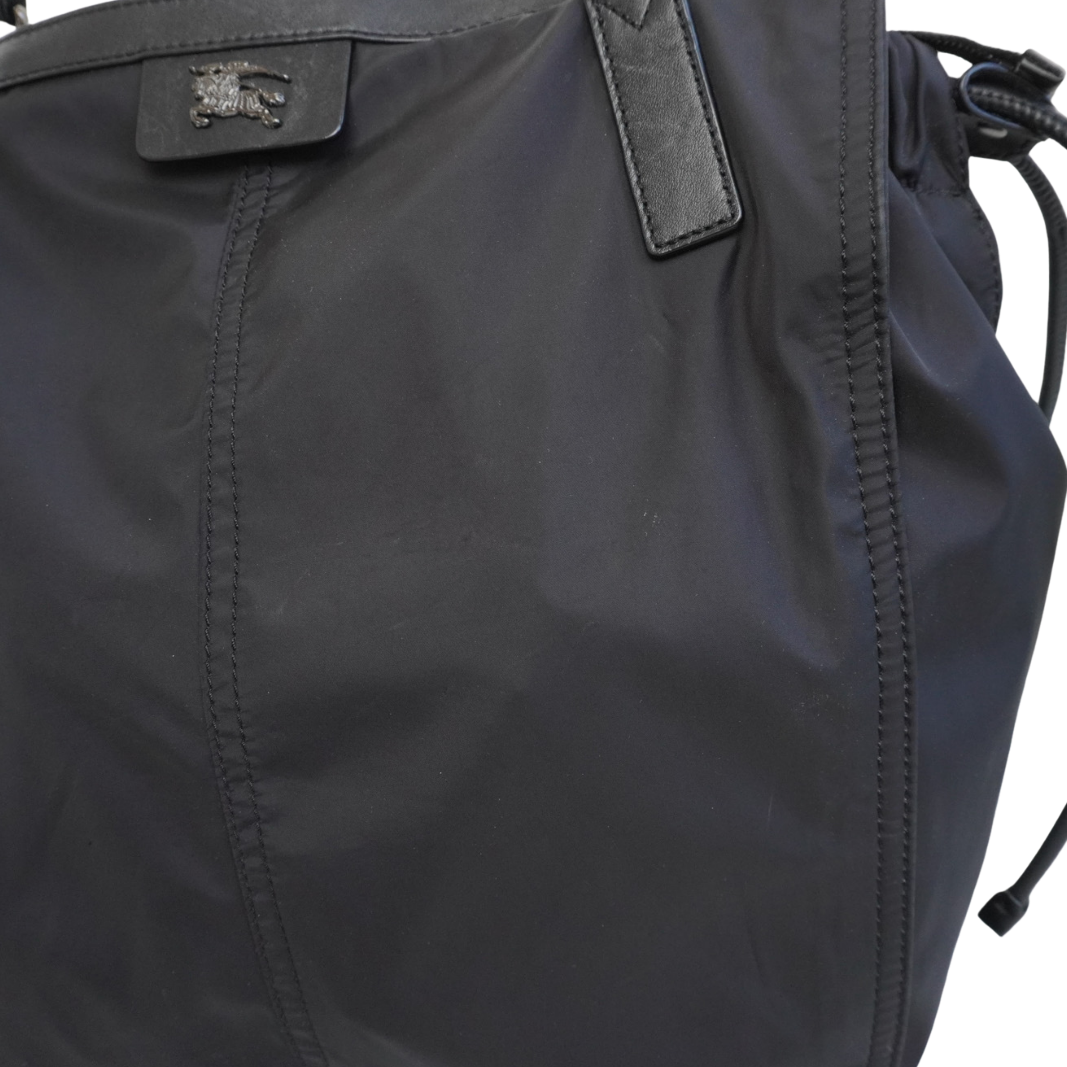 Burberry tote bag in black nylon with leather trim, dual flat shoulder straps, drawstring pulls at the sides, and a gunmetal Knight logo emblem. The bag has a top zip opening in gunmetal hardware revealing a beige novacheck interior lining with a zip pocket.