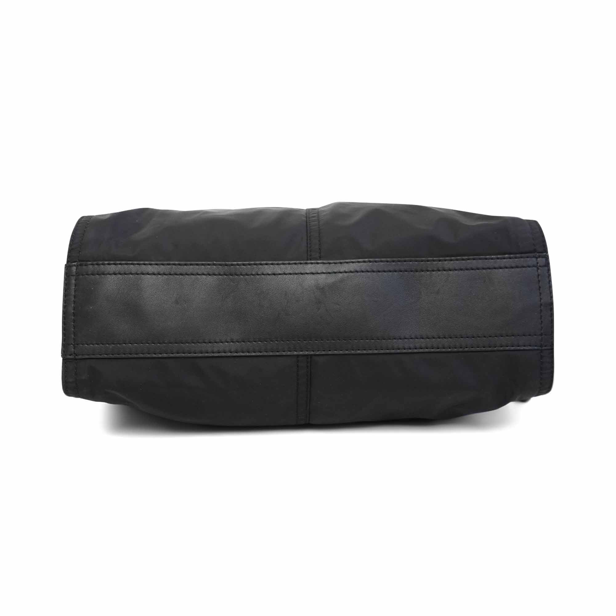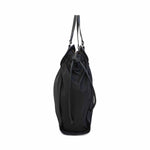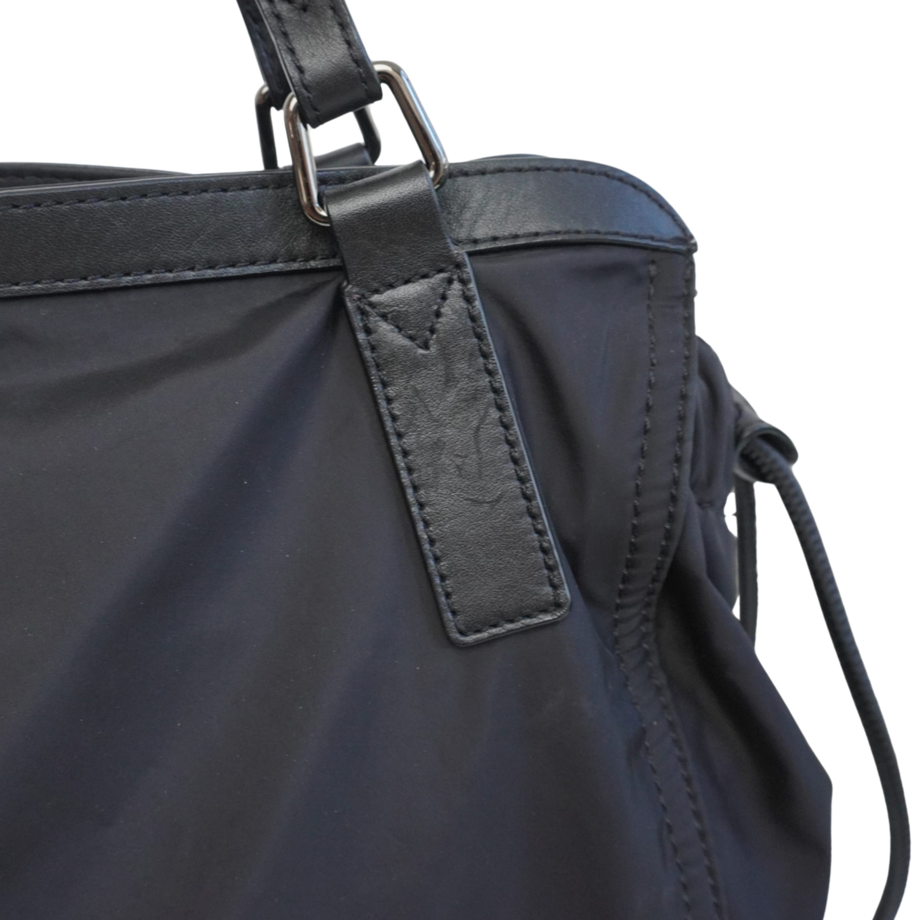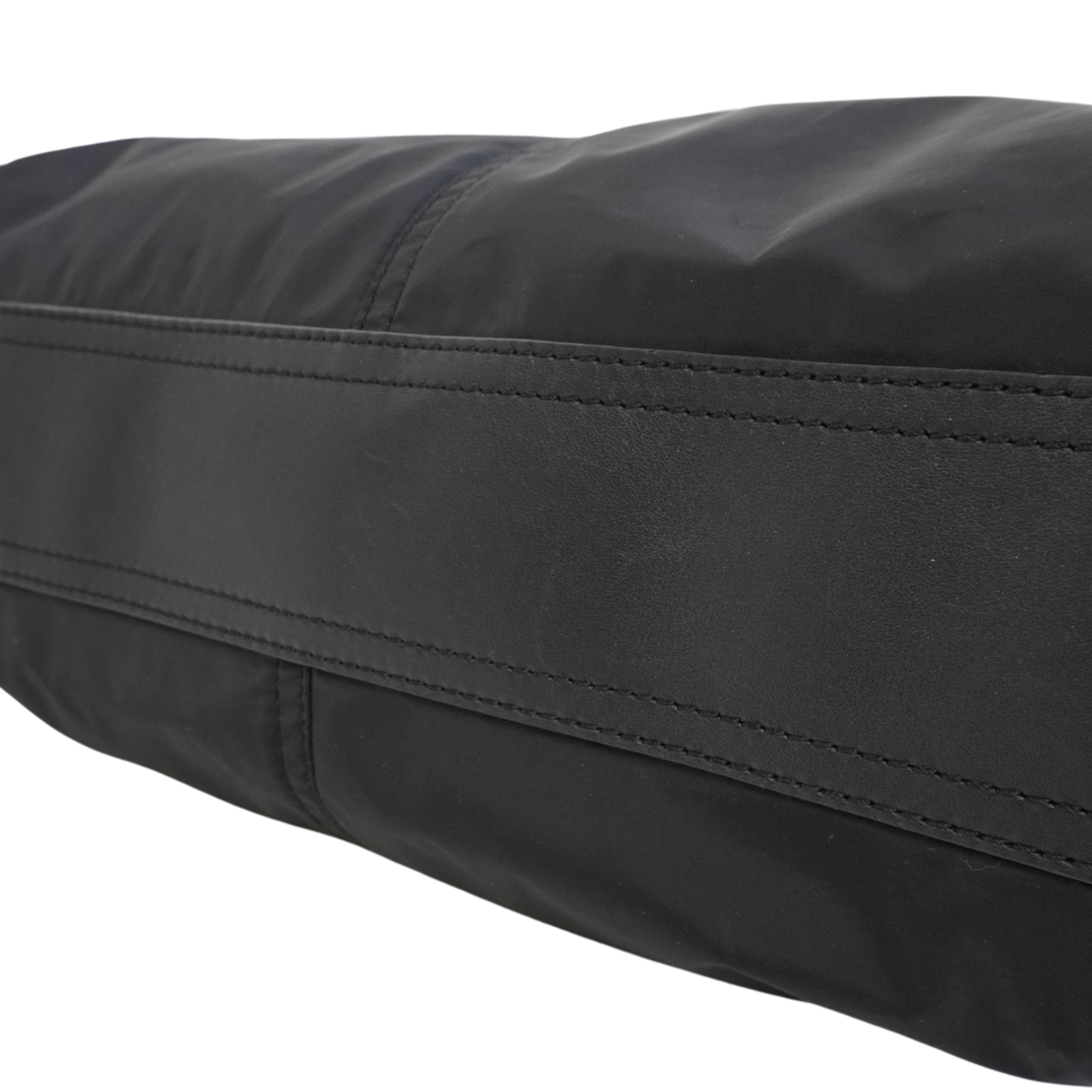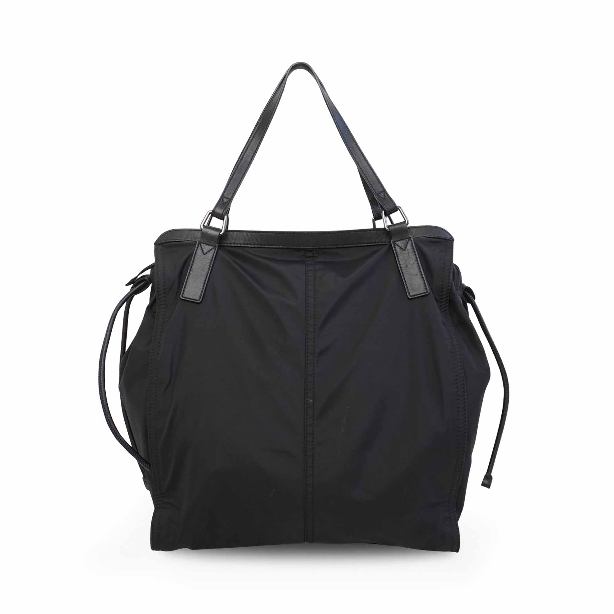 Burberry tote bag in black nylon with leather trim, dual flat shoulder straps, drawstring pulls at the sides, and a gunmetal Knight logo emblem. The bag has a top zip opening in gunmetal hardware revealing a beige novacheck interior lining with a zip pocket.