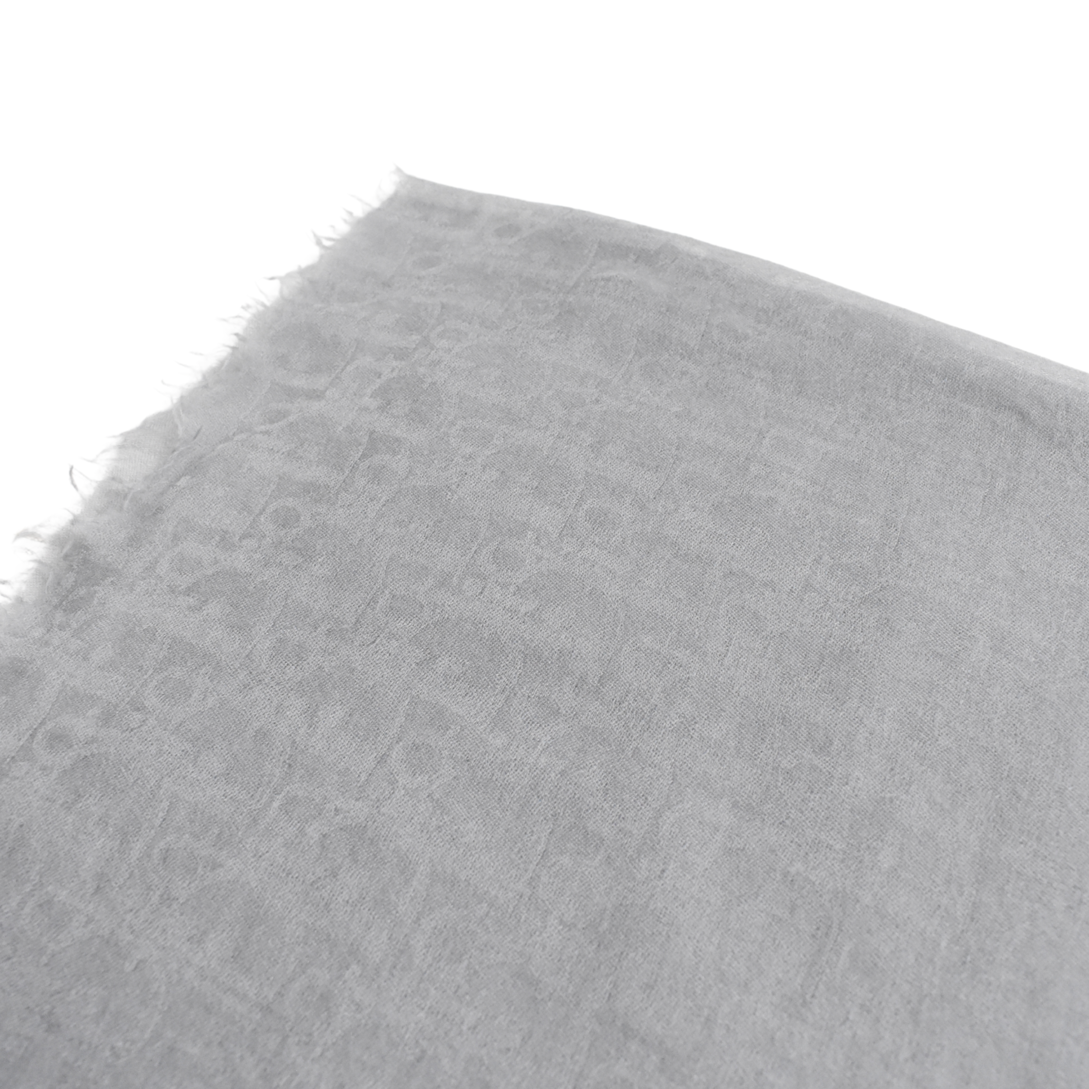 Christian Dior square scarf in grey cashmere with a tonal monogram all over print and fringe trim.