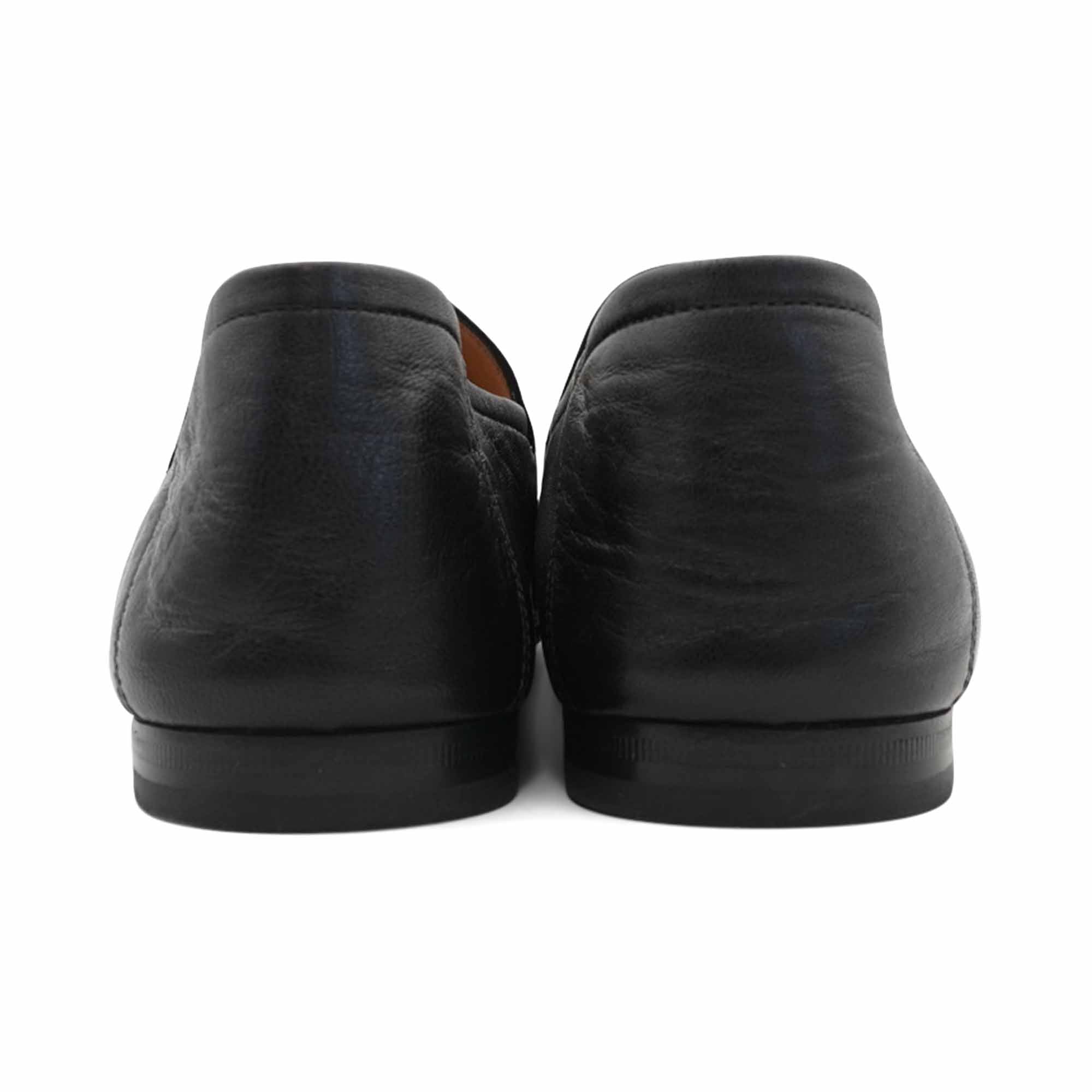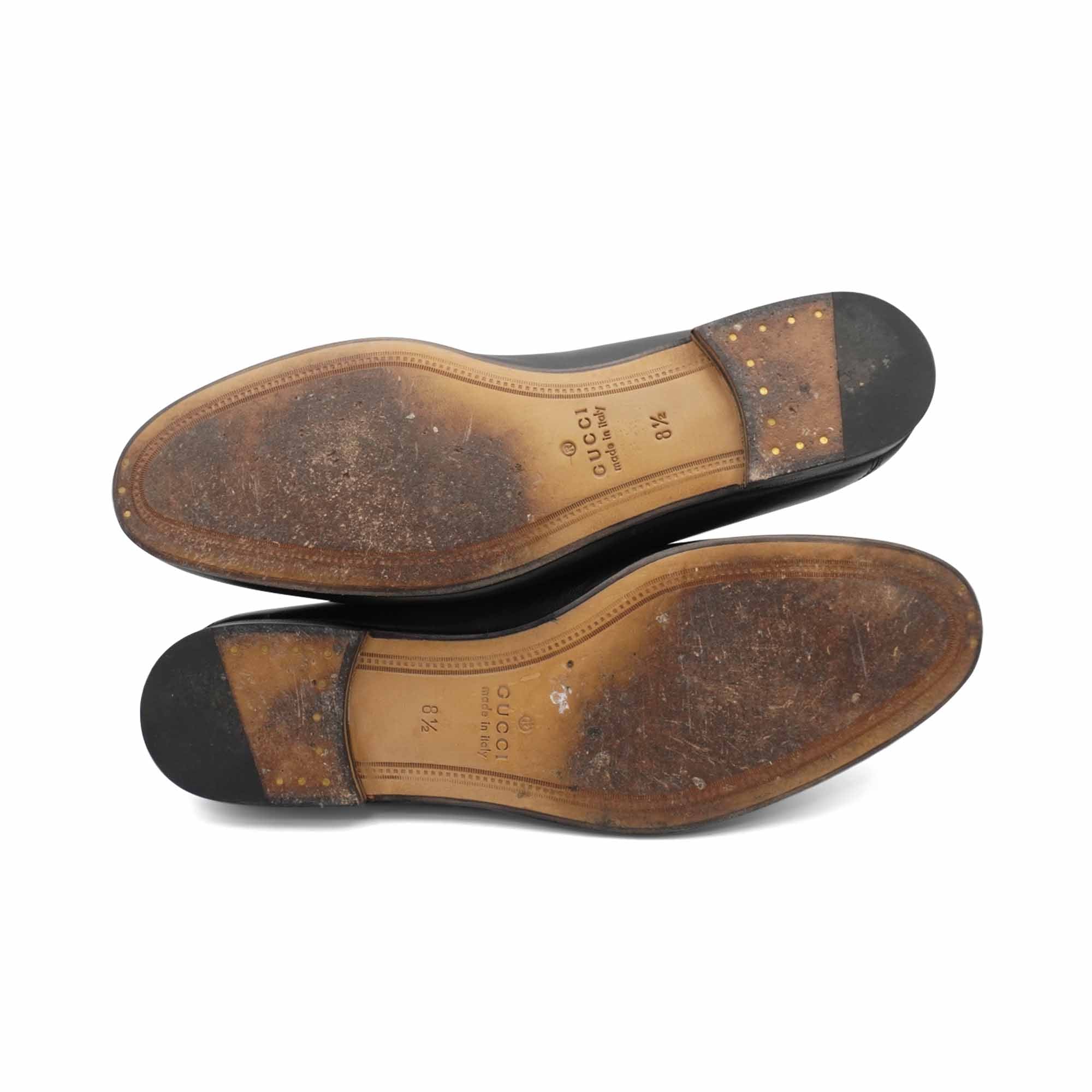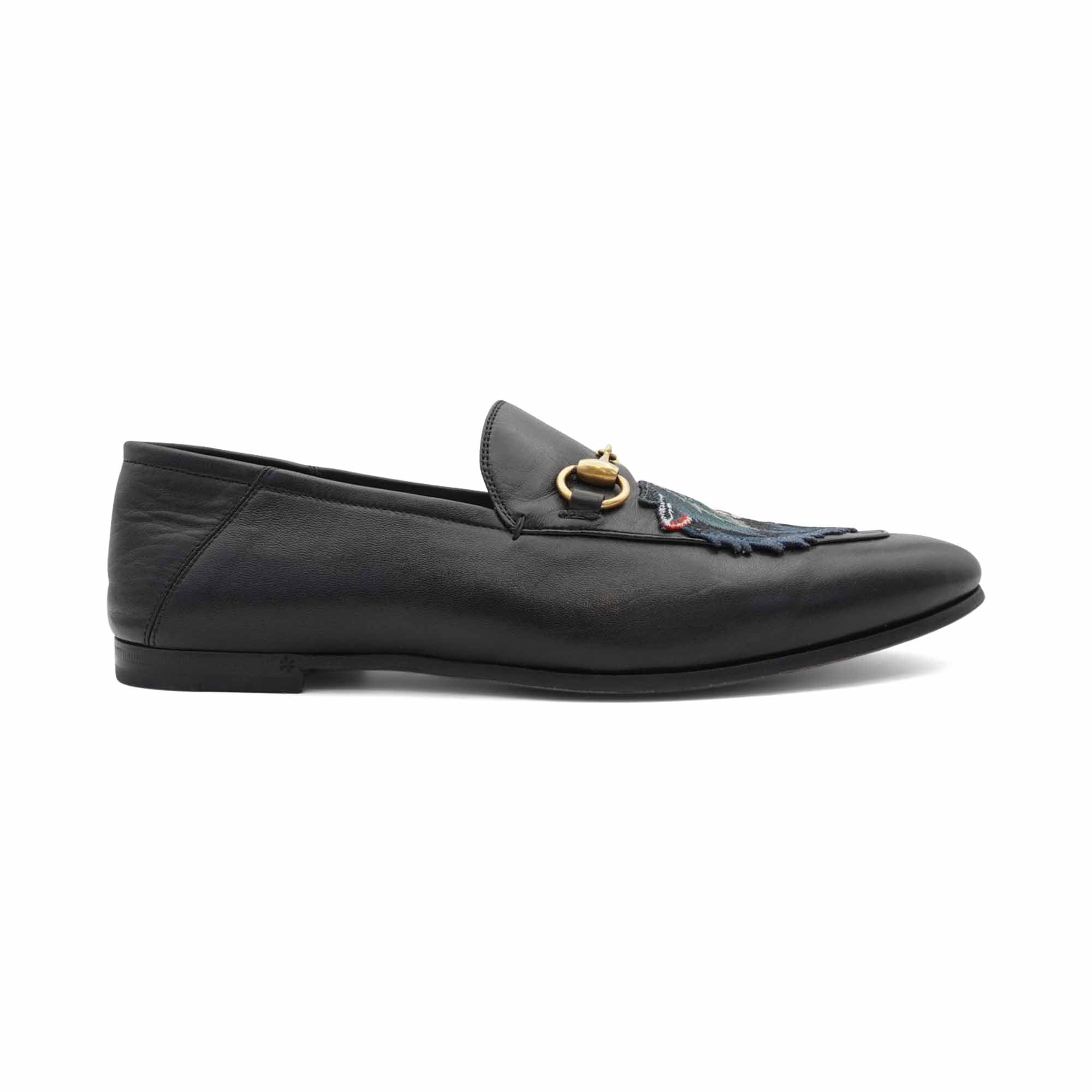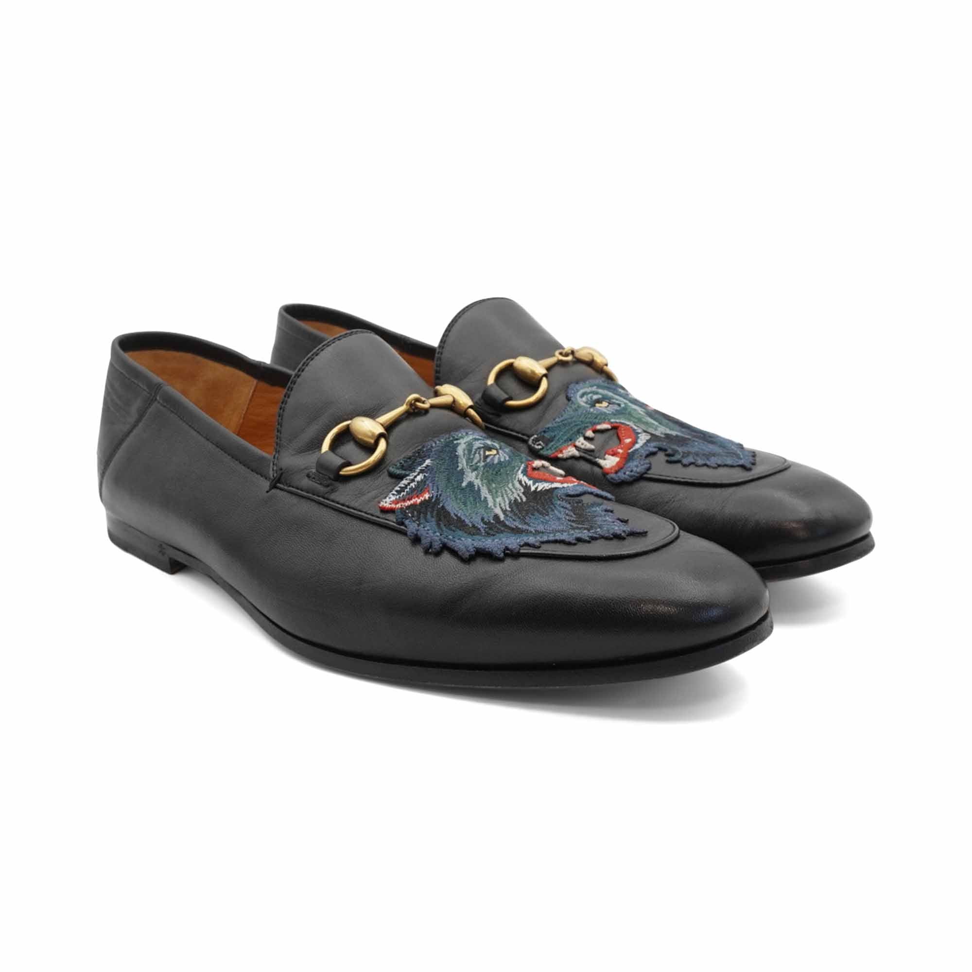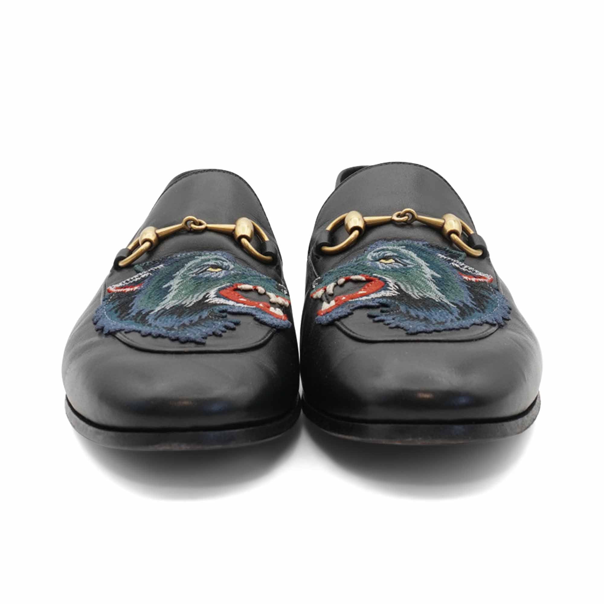 Gucci 'Brixton' loafers in black leather with a blue wolf face appliqué on the front and a gold horsebit detail.