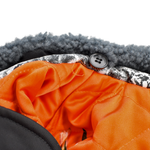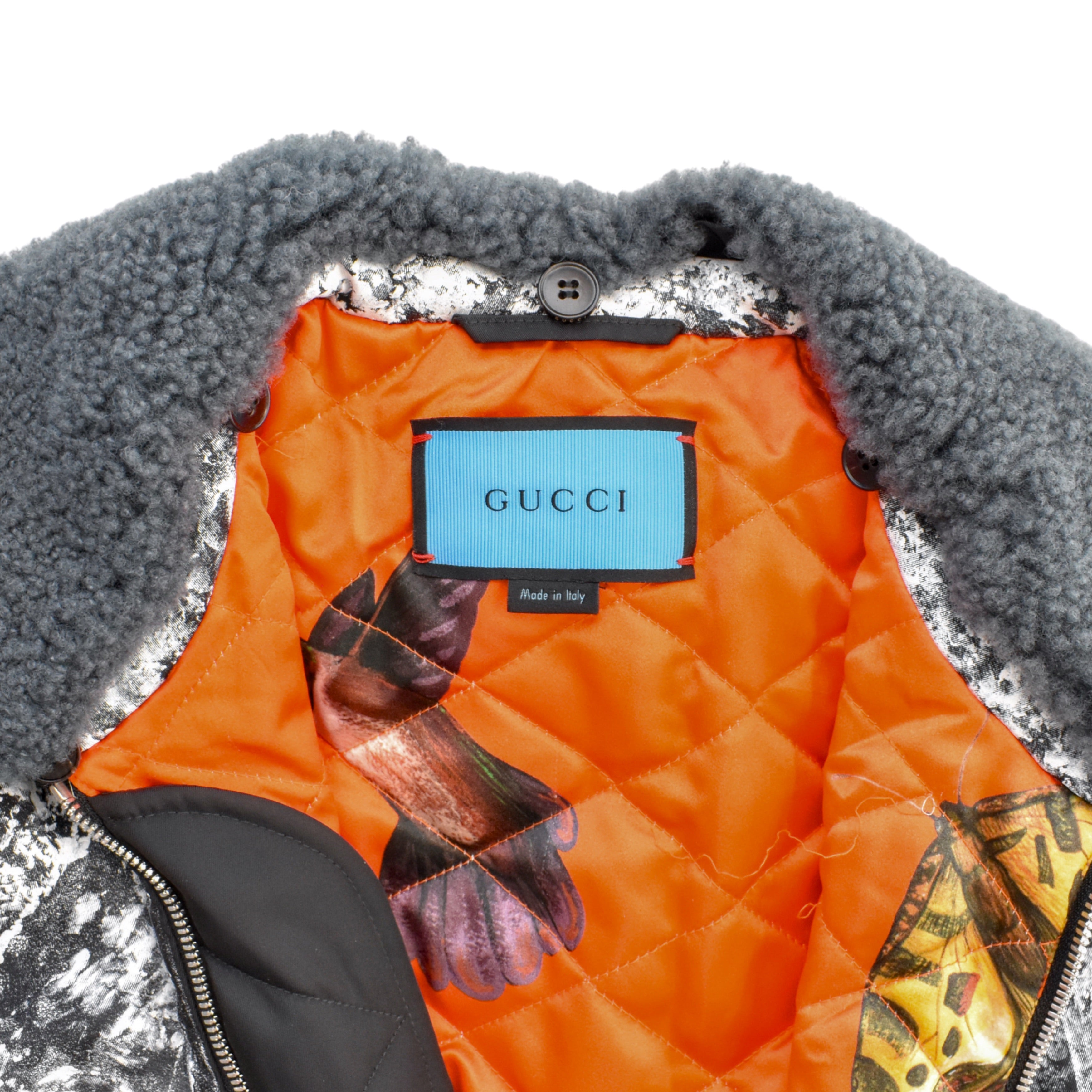Gucci 'Gucci Ghost' in black nylon with an all-over white painted effect, a front-zip opening in silver hardware, red and green racing stripe ribbed trim, and a removable shearling collar. The jacket has a spray painted logo graphic on the chest and back, and is lined with a bright orange flower printed nylon.